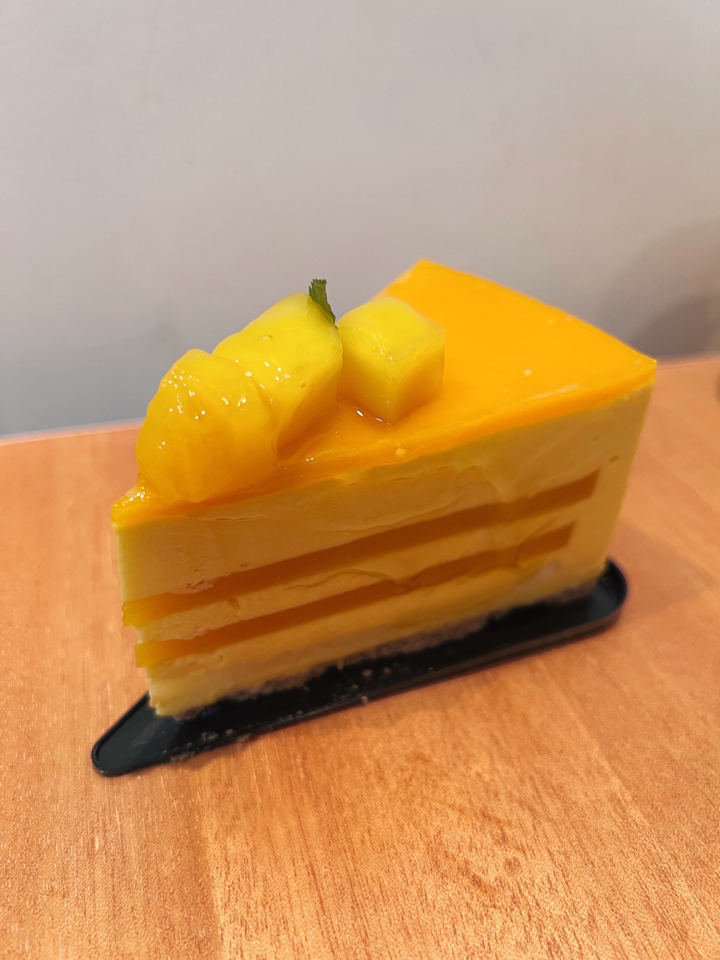 芒果慕斯蛋糕🍰,吃起来芒果味十足,有淡淡的甜味,底部有饼干碎,好吃!