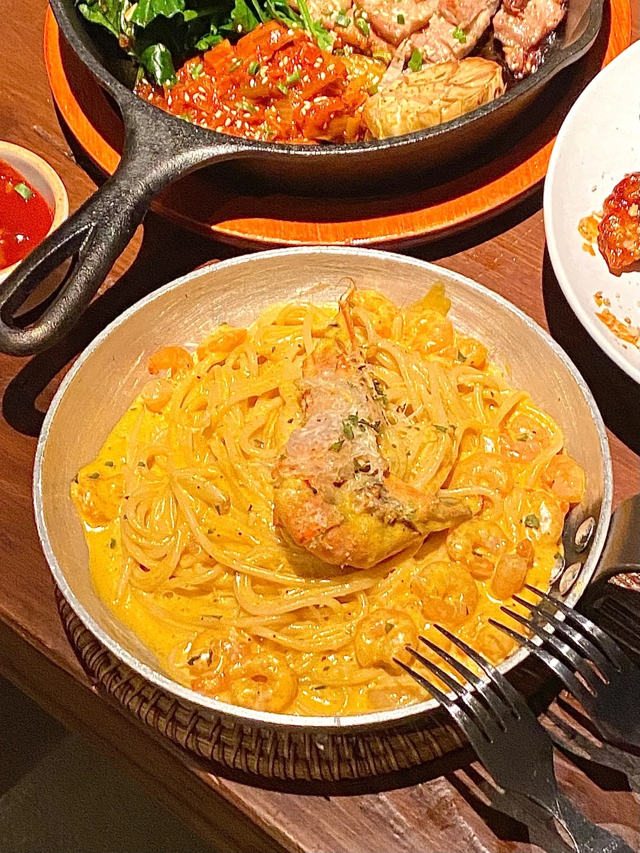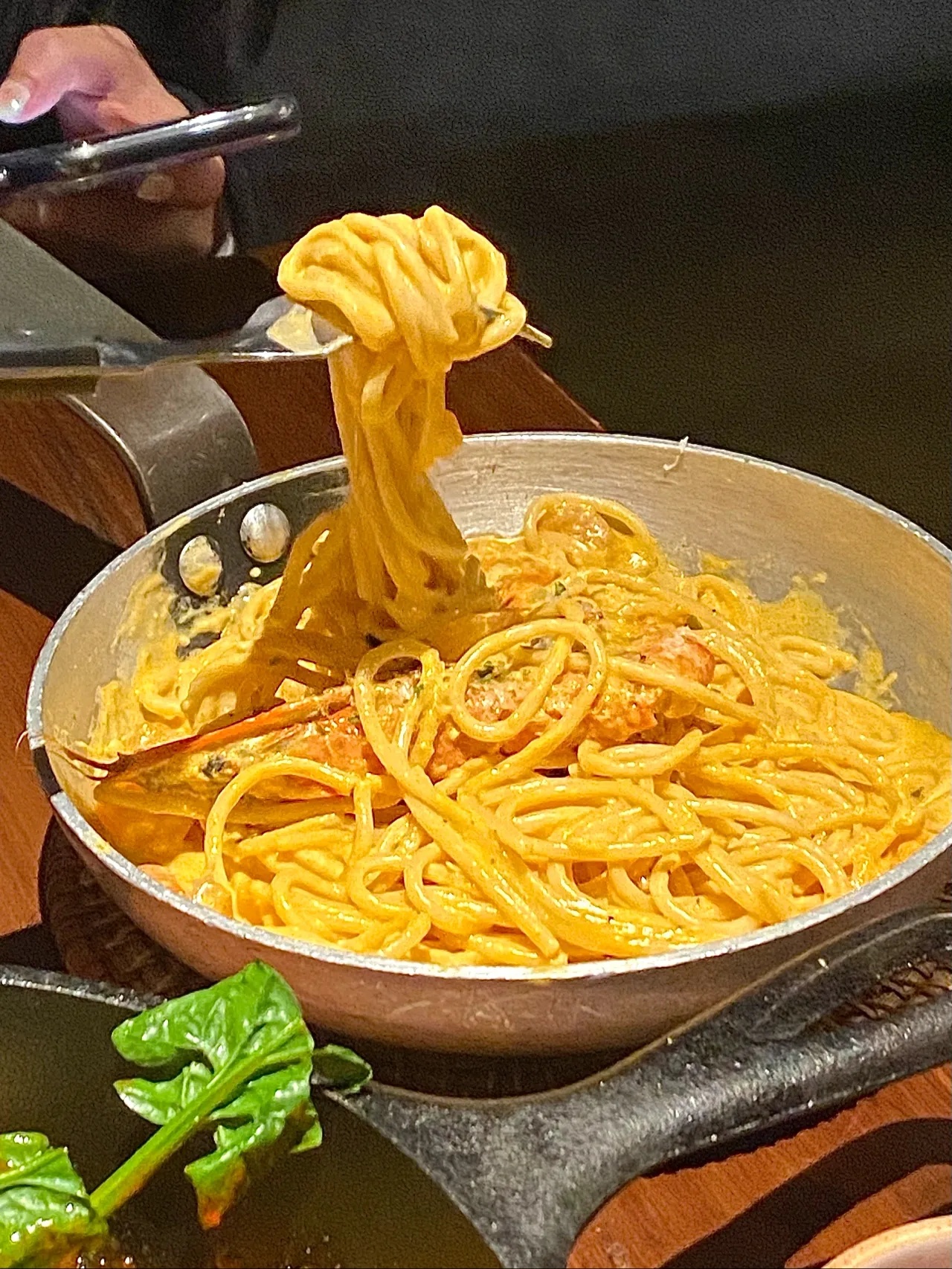🍝明虾辣酱奶油意面//虽然是奶油意面但是也是辣的o!!里头有大虾还有很多虾仁!!
