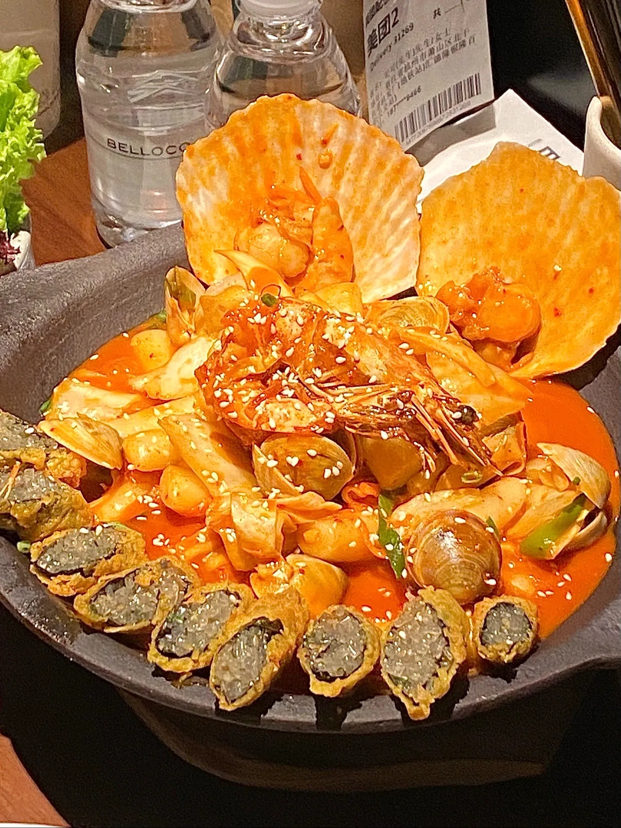 🥘海鲜辣年糕//里头料很多!!有扇贝、大虾、蛤蜊、鱼饼、年糕、泡菜等 锅边上还有一圈豆面粉丝做的卷!!蛮有新意