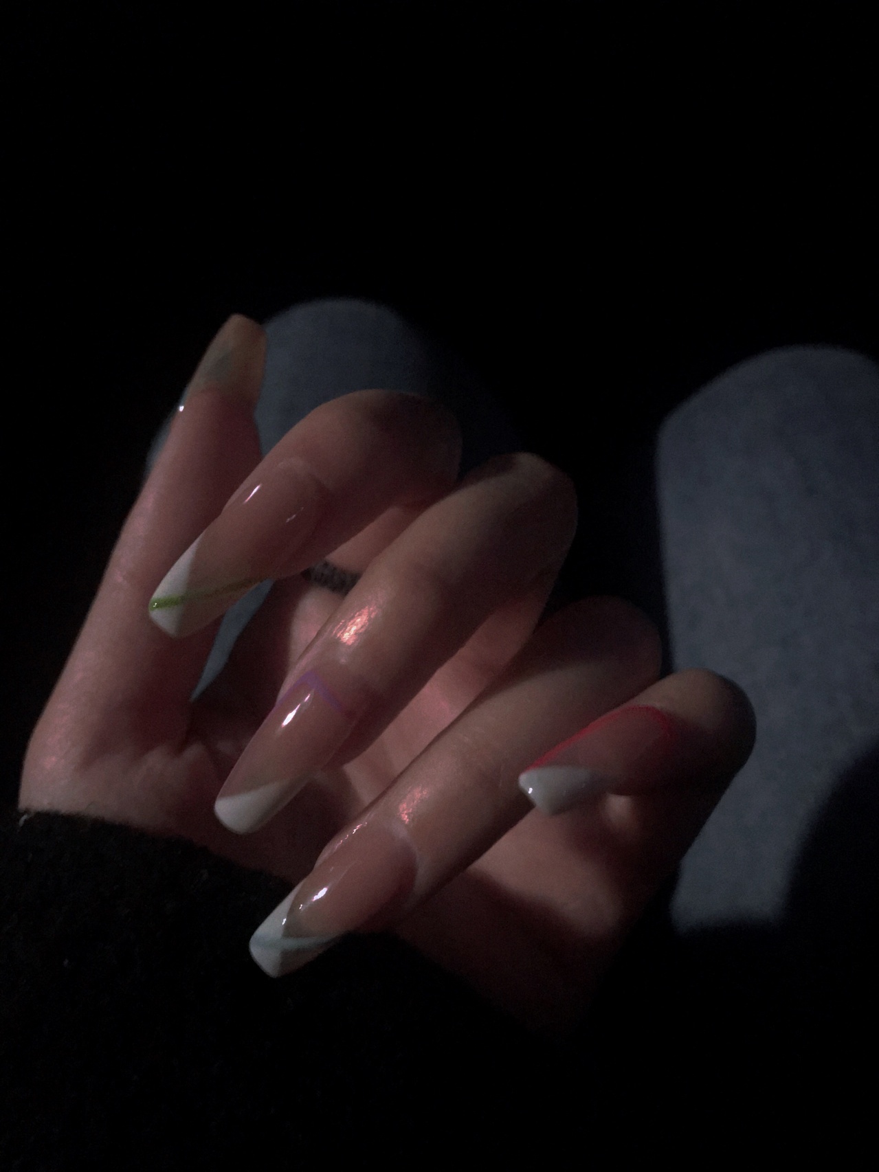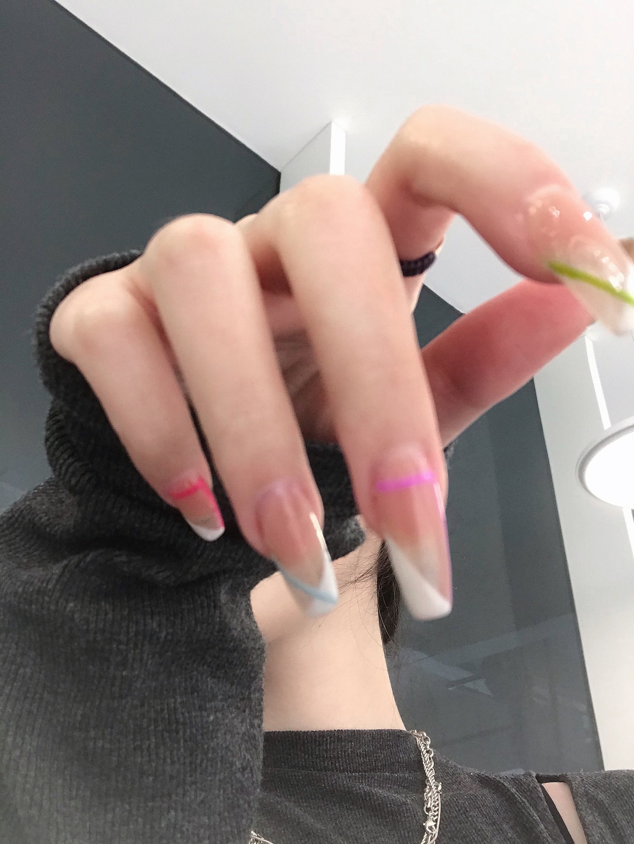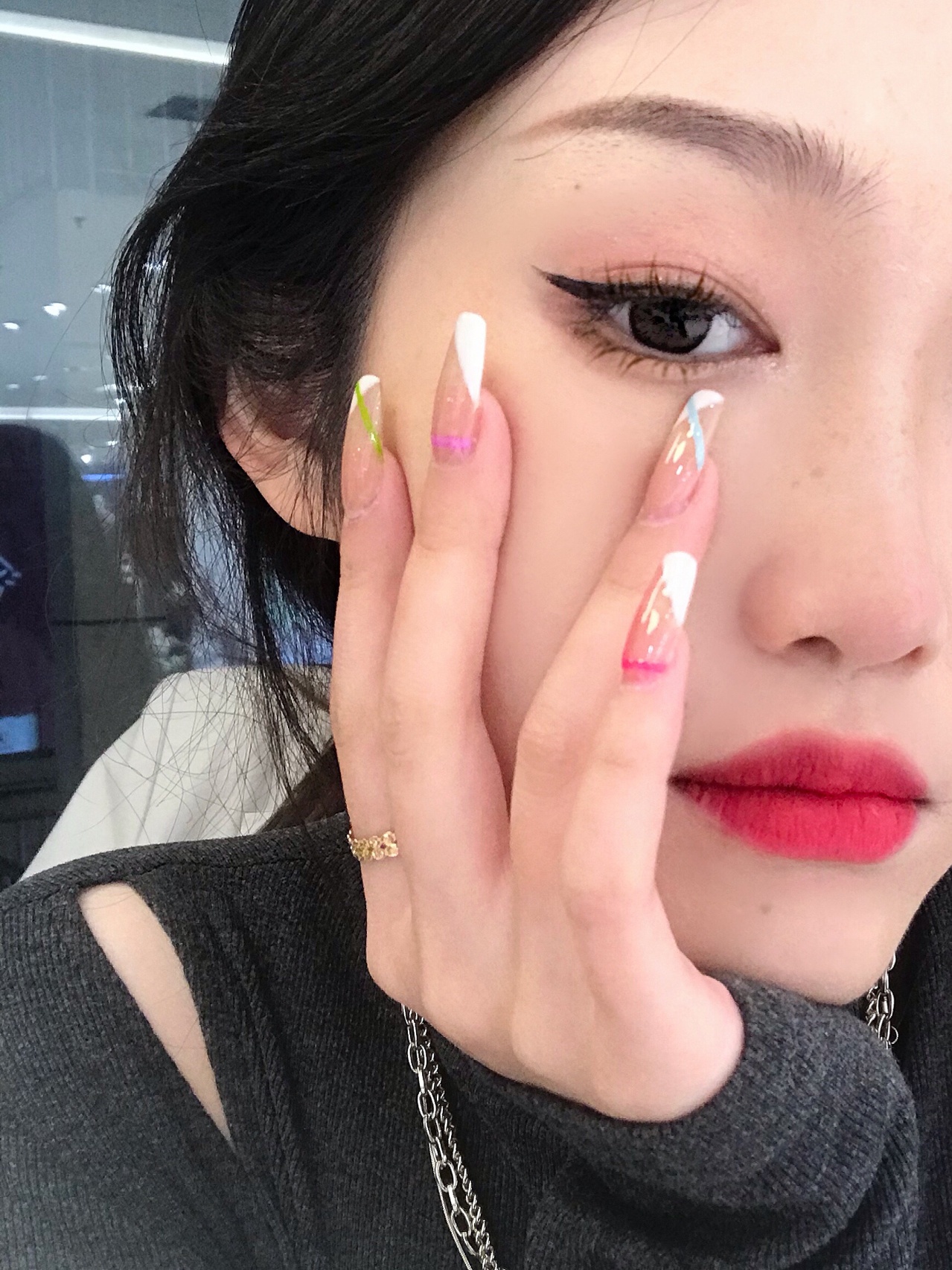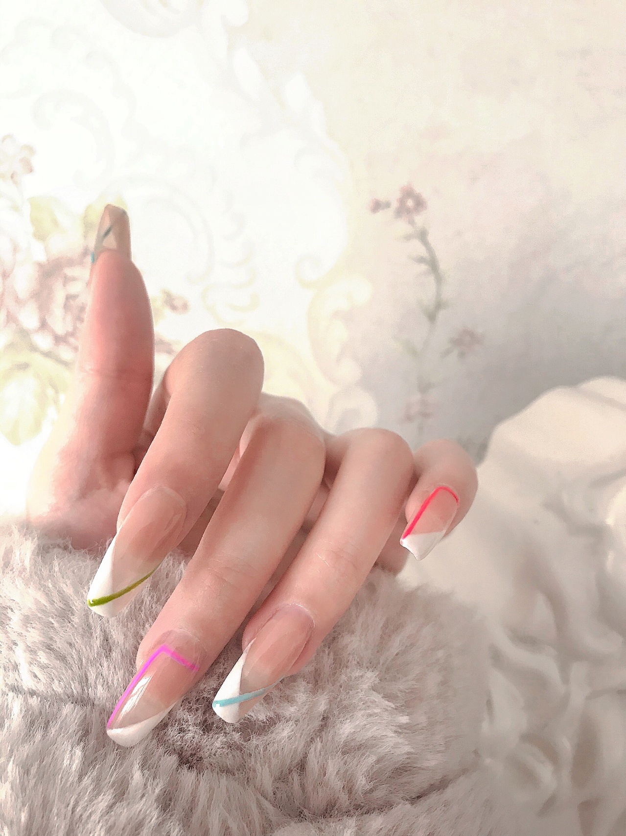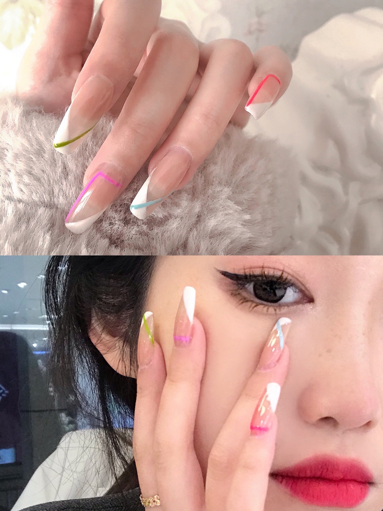 最近超喜欢法式美甲,但是又喜欢色彩碰撞的辣妹甲,觉得春夏还是要做个色彩鲜艳一点的!所以!就想把他们稍微结合一下!在法式美甲的基础上加上彩色线条🌈超级显白[赞R]非常百搭[赞R]简约不简单[赞R]