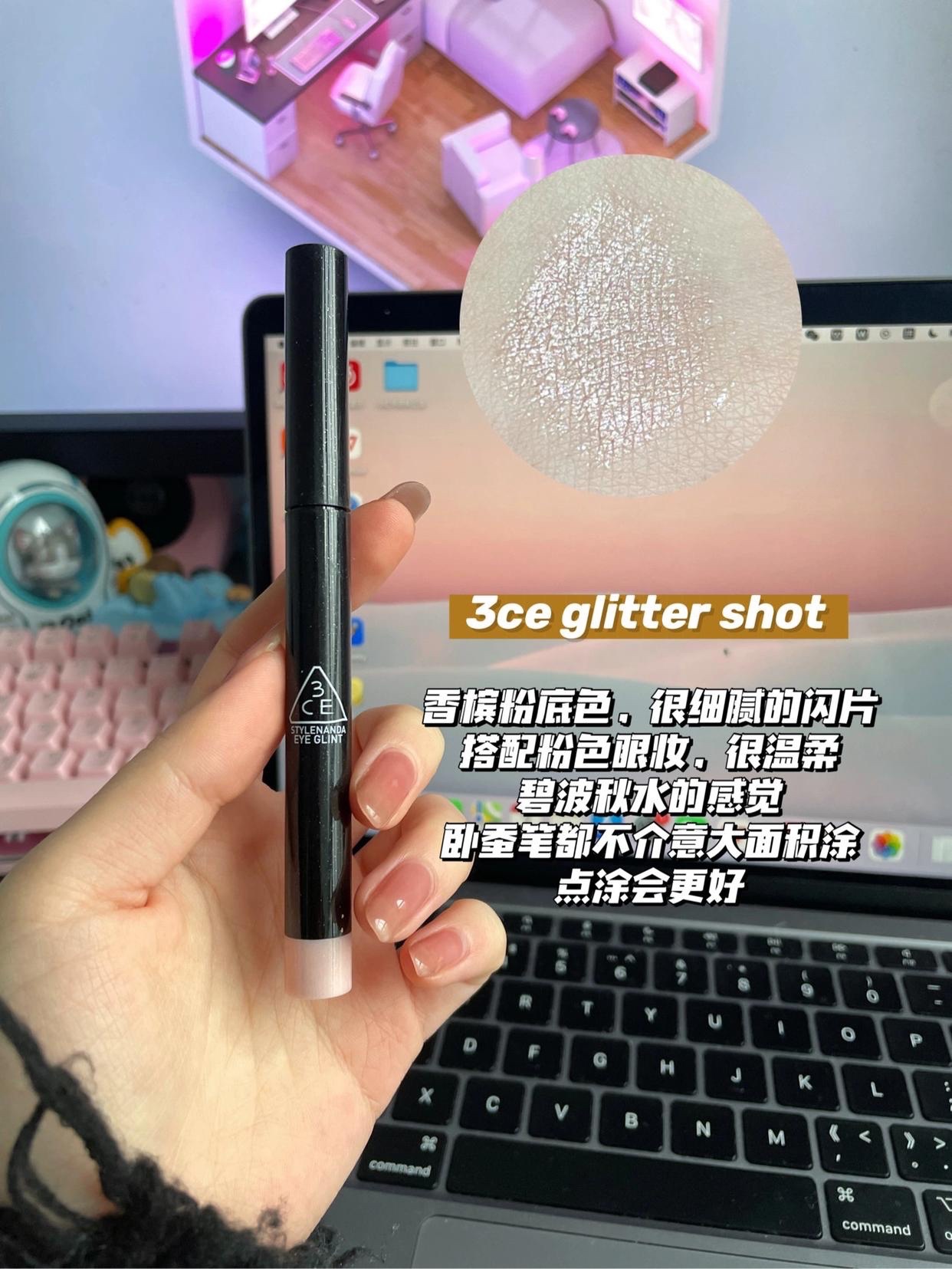 · 3ce glitter shot:香槟粉底色,很细腻的闪片。搭配粉色眼妆,很温柔,碧波秋水的感觉。卧蚕笔都不介意大面积涂,点涂会更好。