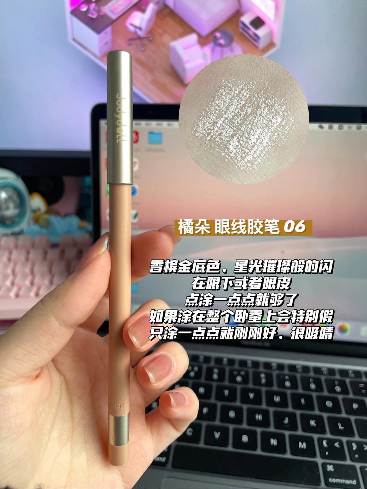 · 橘朵 06:香槟金底色,星光璀璨般的闪。在眼下或者眼皮点涂一点点就够了,如果涂在整个卧蚕上会特别假。只涂一点点就刚刚好,很吸睛。
