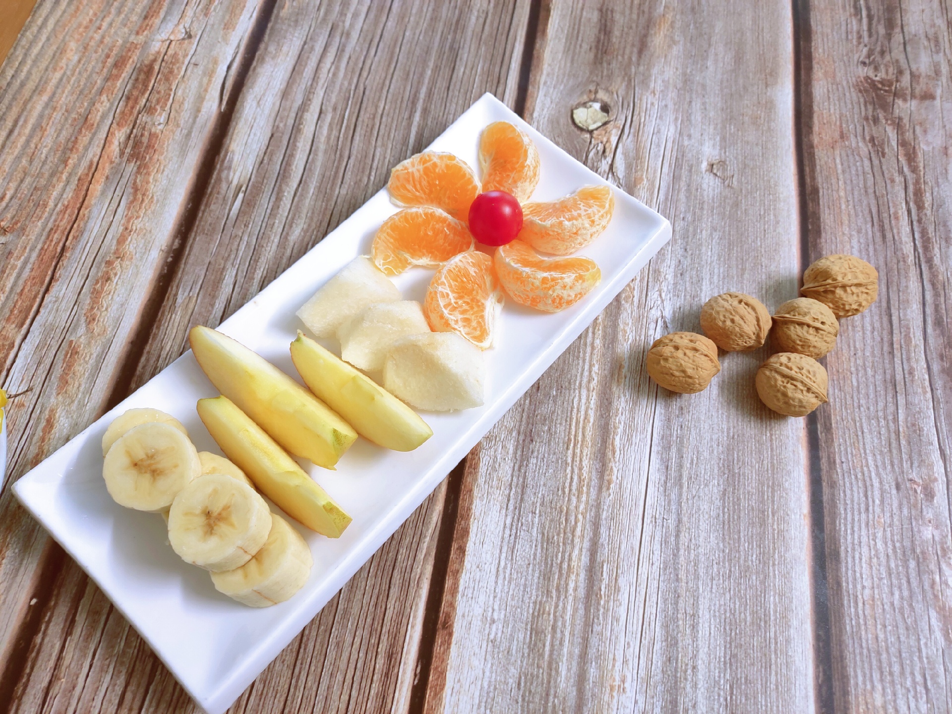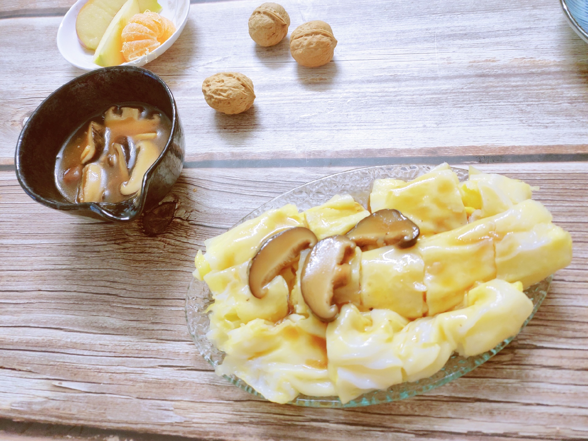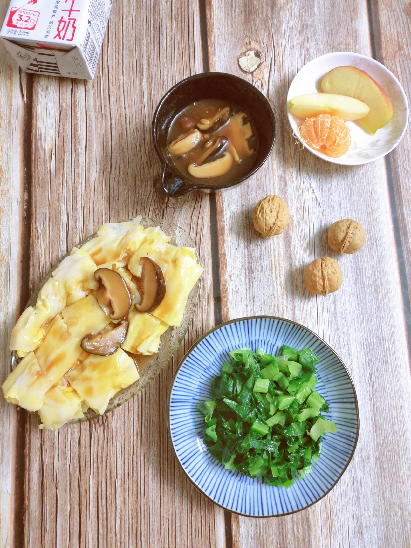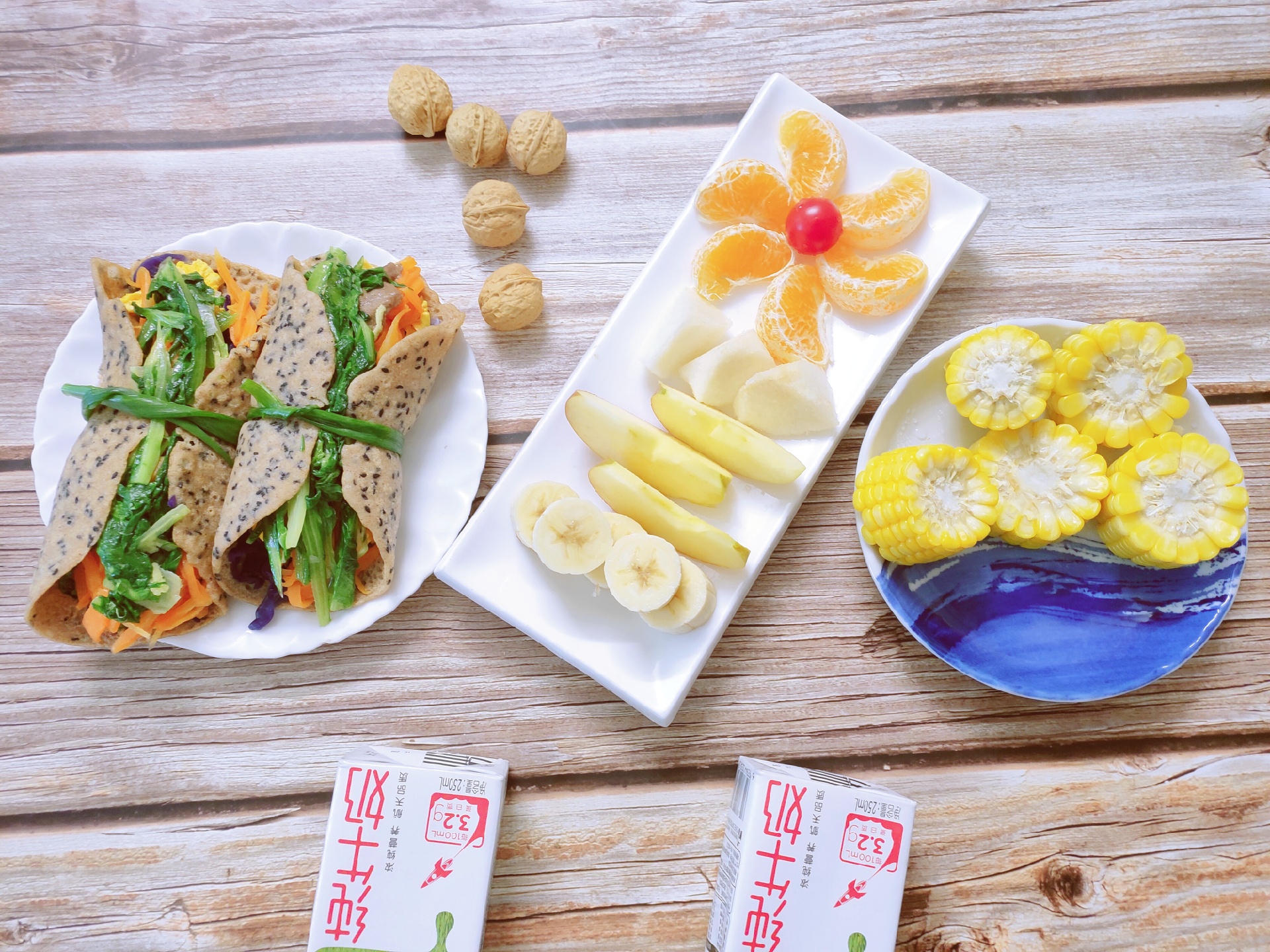 香菇蛋肠(公主),全麦春饼(油菜,紫甘蓝,胡萝卜,蛋,香菇,牛肉),玉米,牛奶,核桃,水果(苹果,🍐,柑,香蕉)