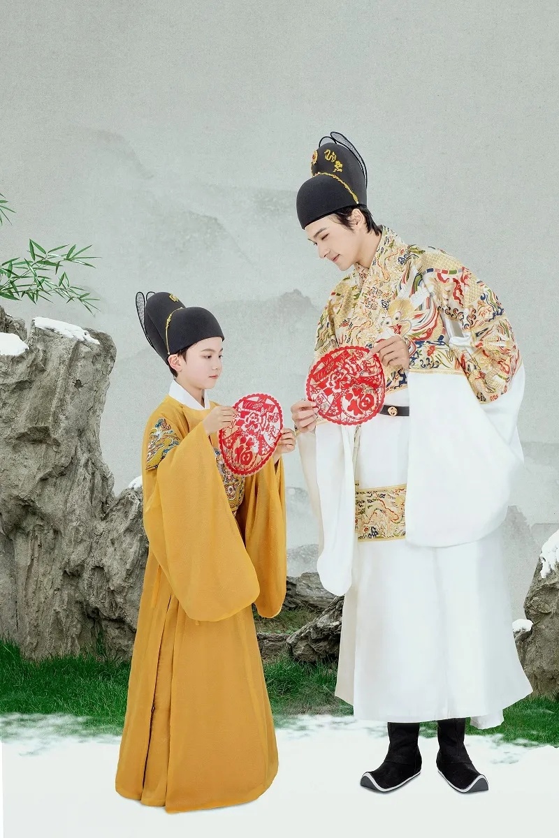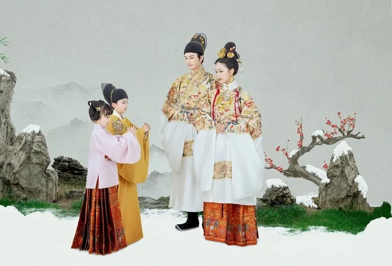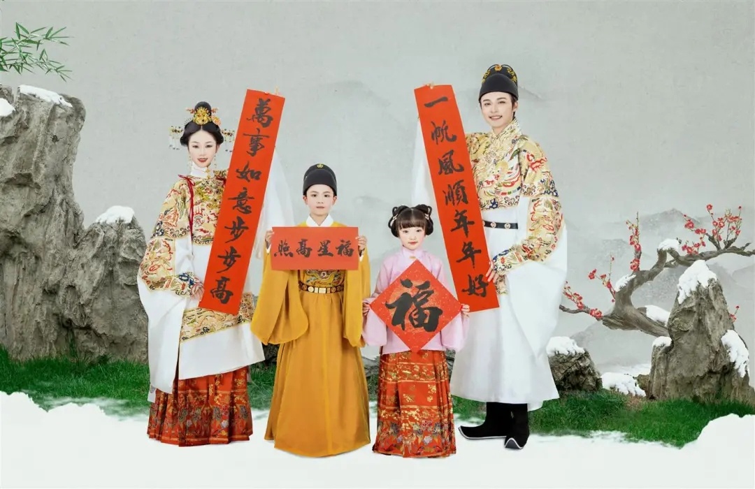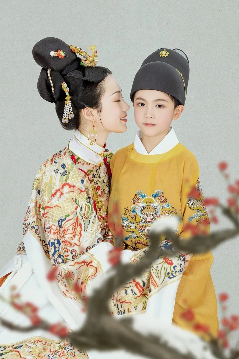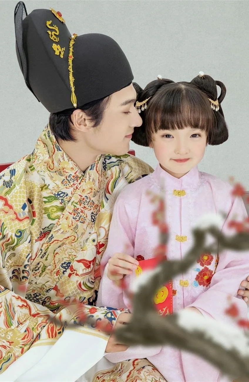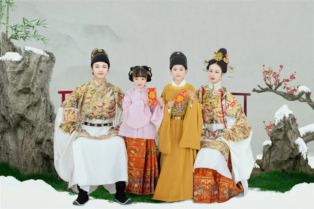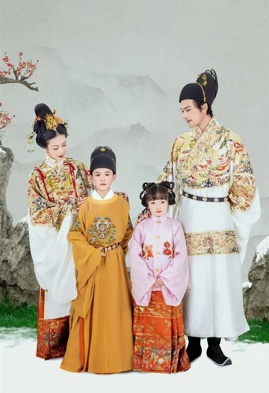 这是套明制全家福,整体风格端庄大气,真是长在我的审美上,特别符合中国传统文化特色,红黄配色象征着喜庆与吉祥,服装上的刺绣与图腾,尽显中国风,图案绣花,金线描绘,芬芳永固,气质浑然天成,无处不预示着2022好运连连~