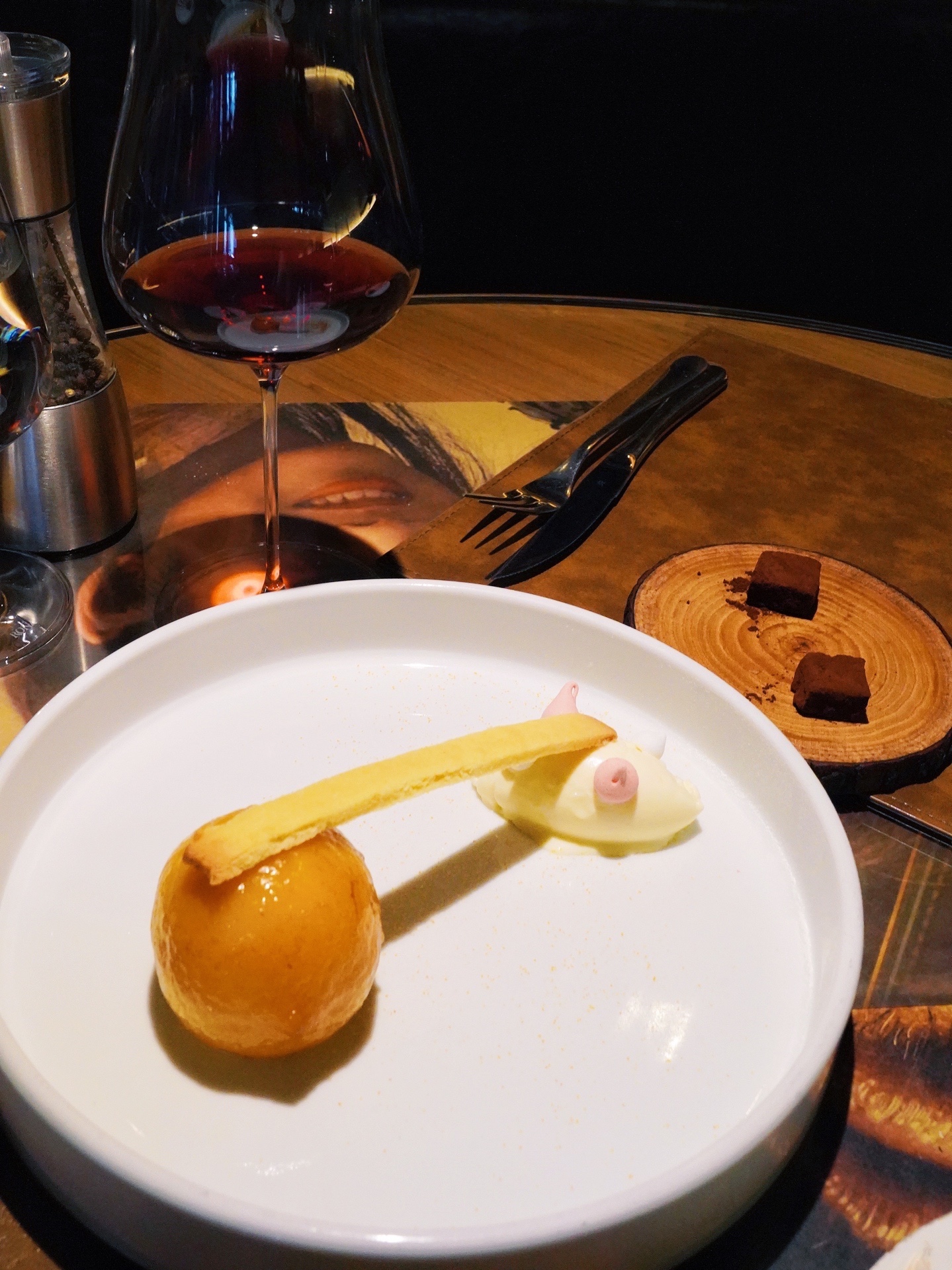 腌渍获得柠檬皮,里面包的是冰淇淋,有两种口味,味道不会甜腻,非常清爽,吃完牛扒后吃这个很舒服。