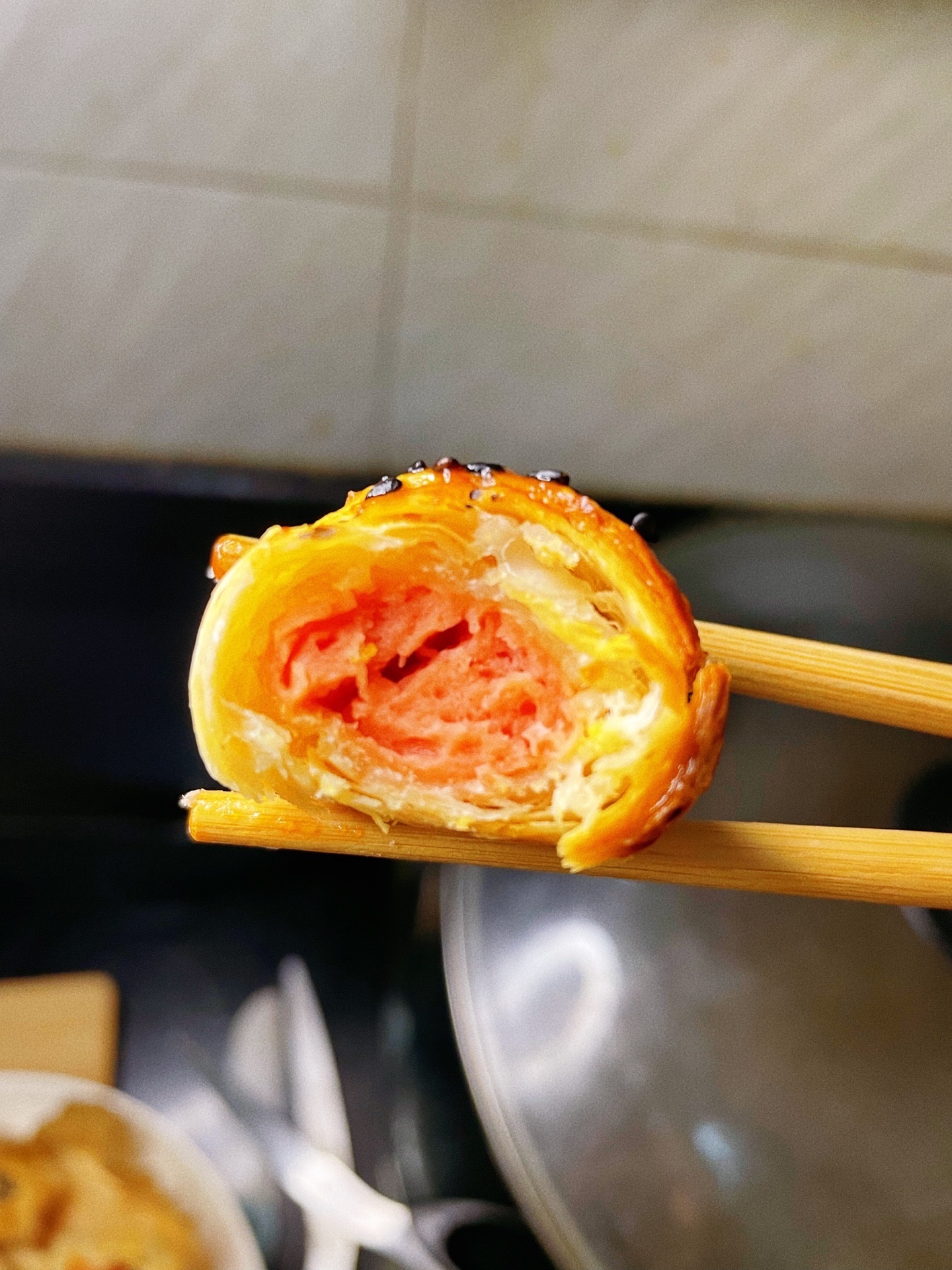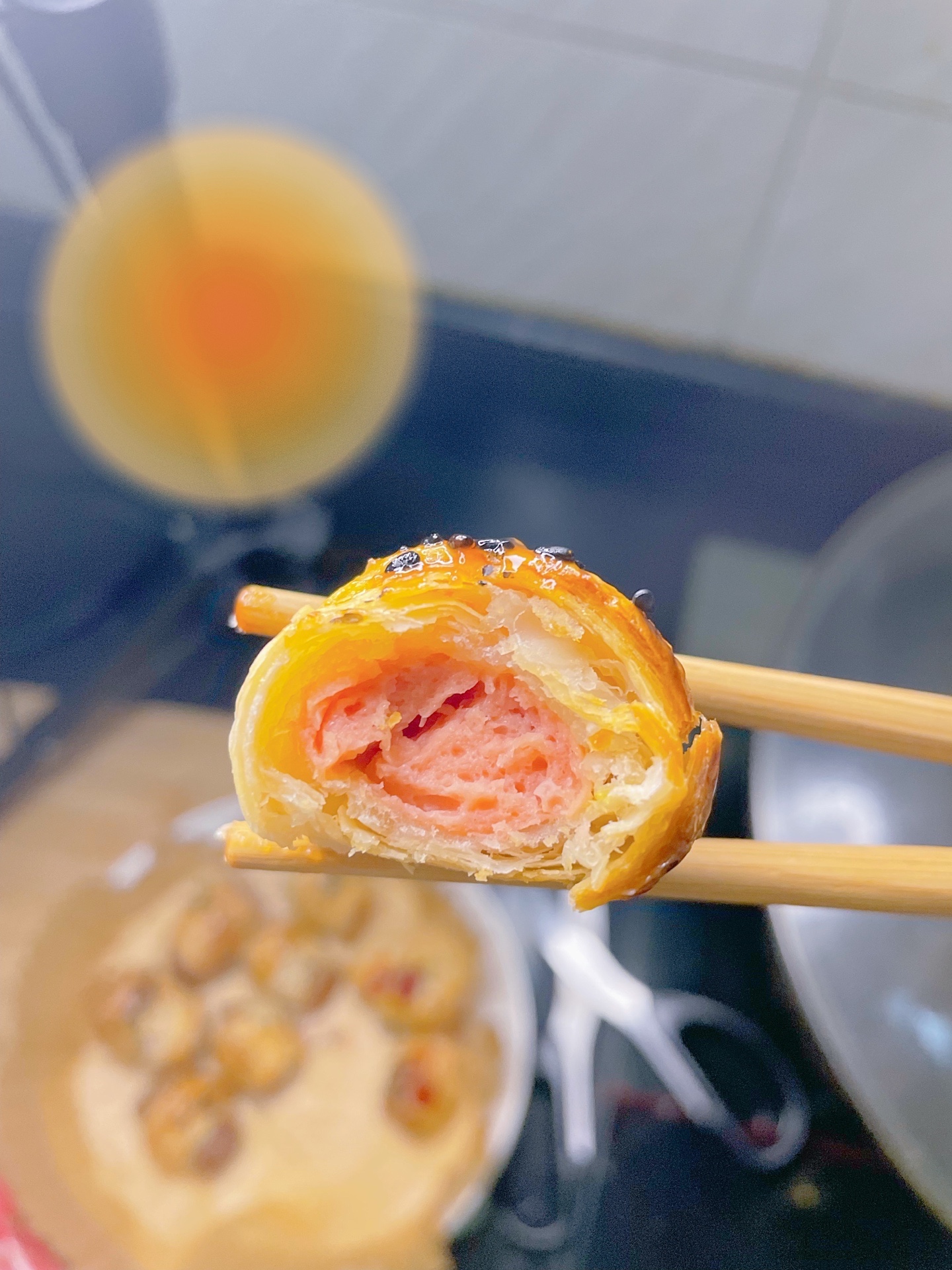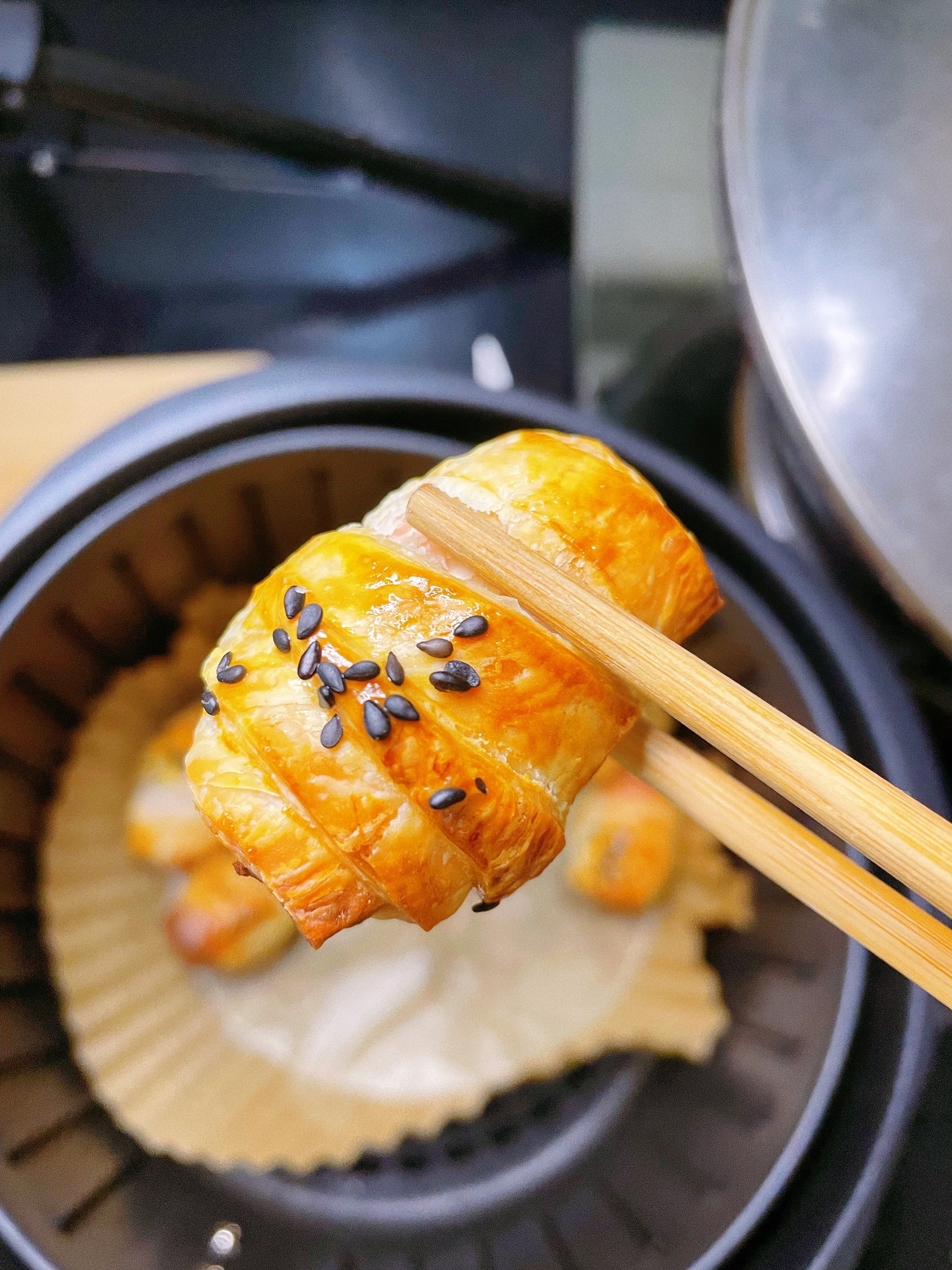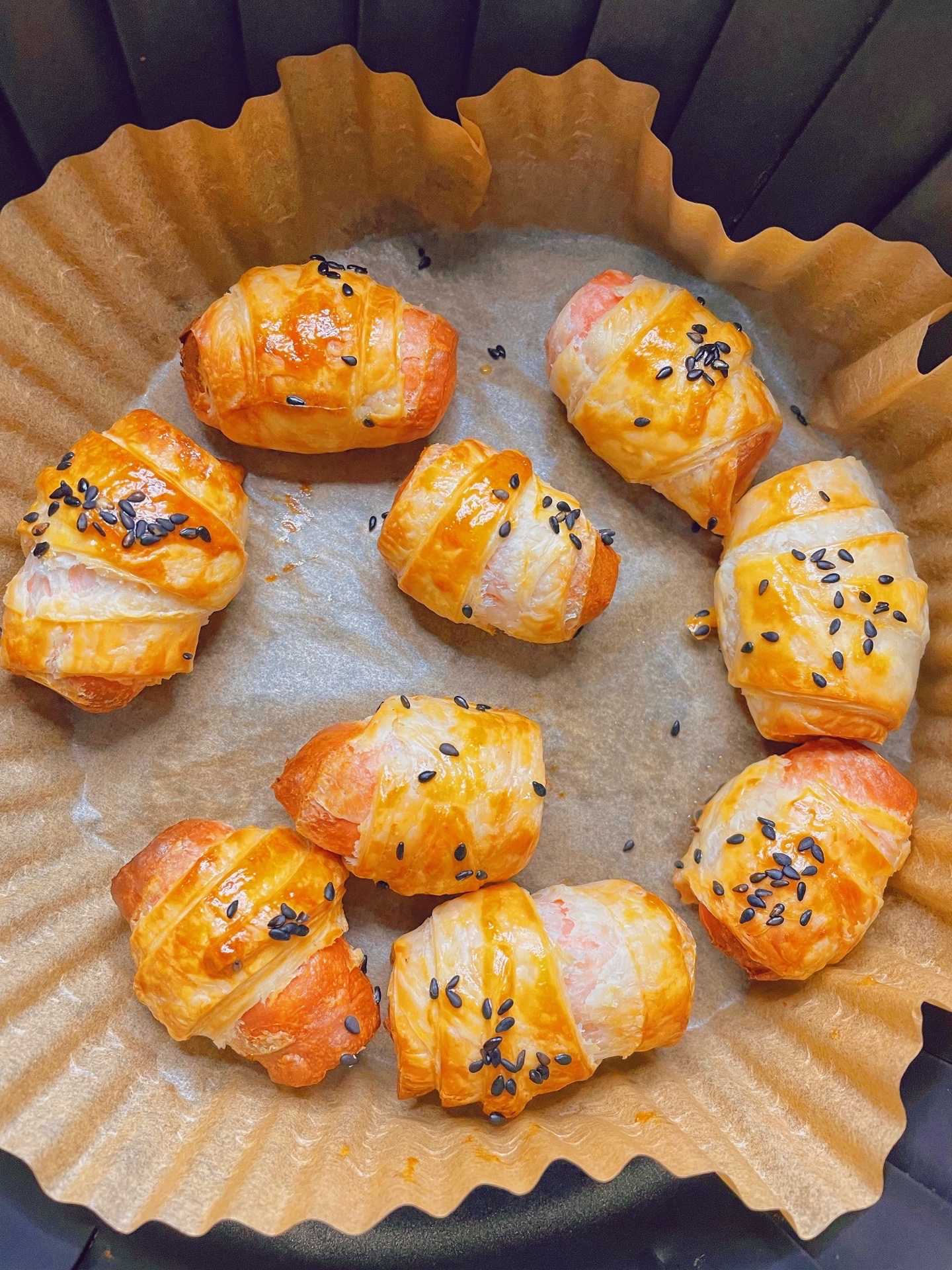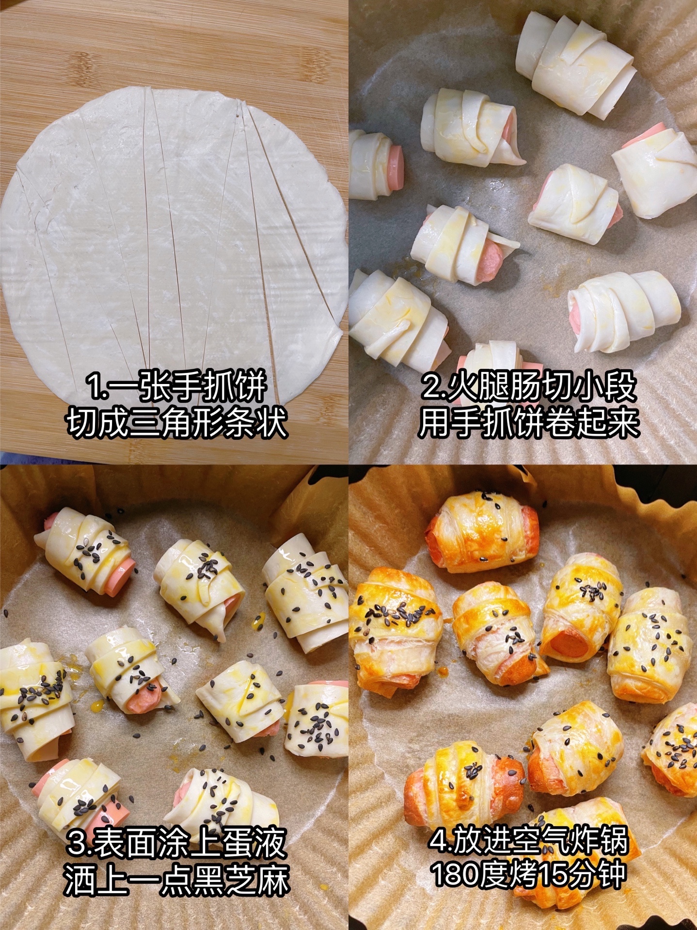 空气炸锅烤手抓饼卷火腿肠,有空气炸锅的姐妹都去做!!酥酥脆脆超好吃,配番茄酱绝了!