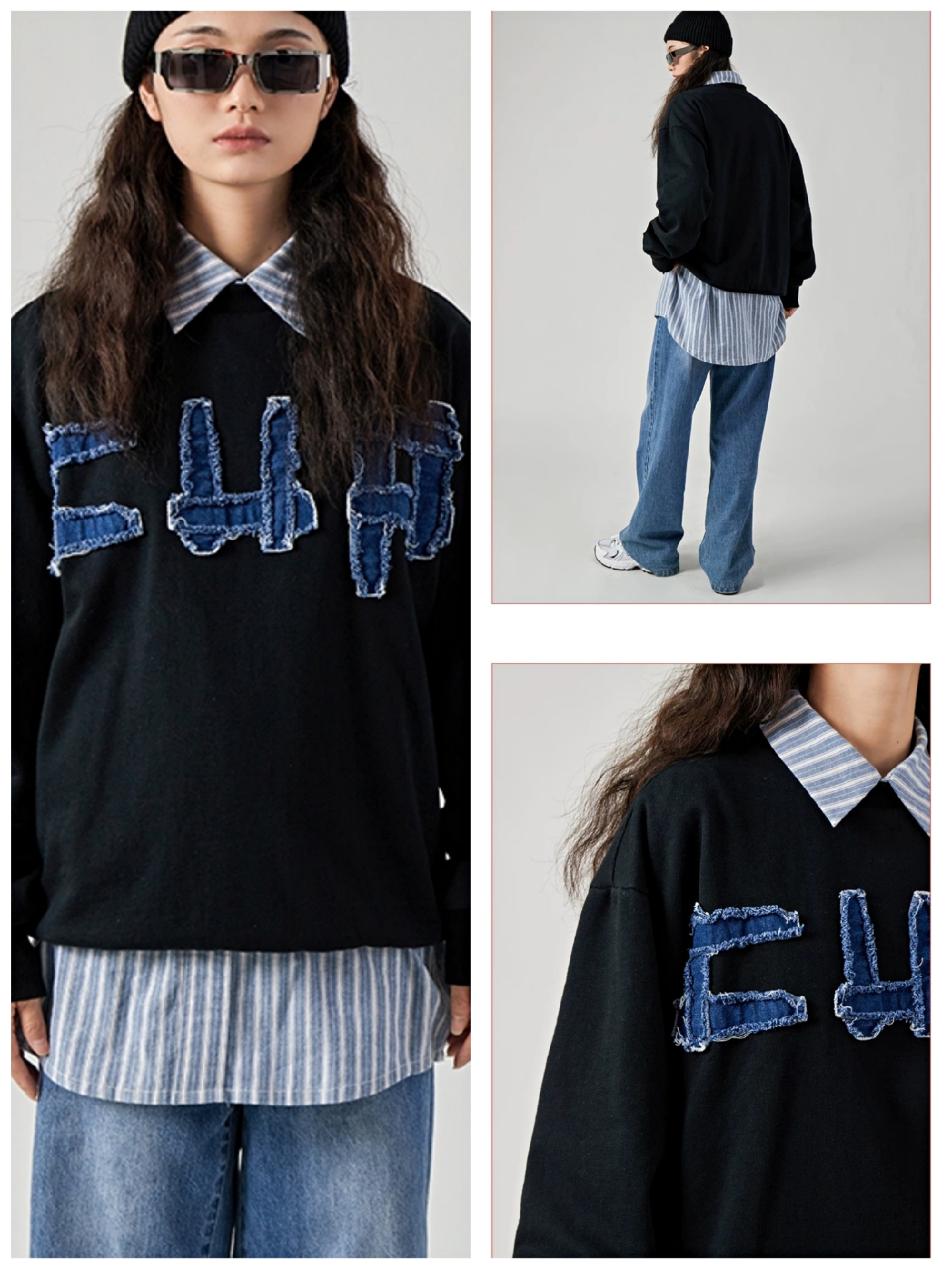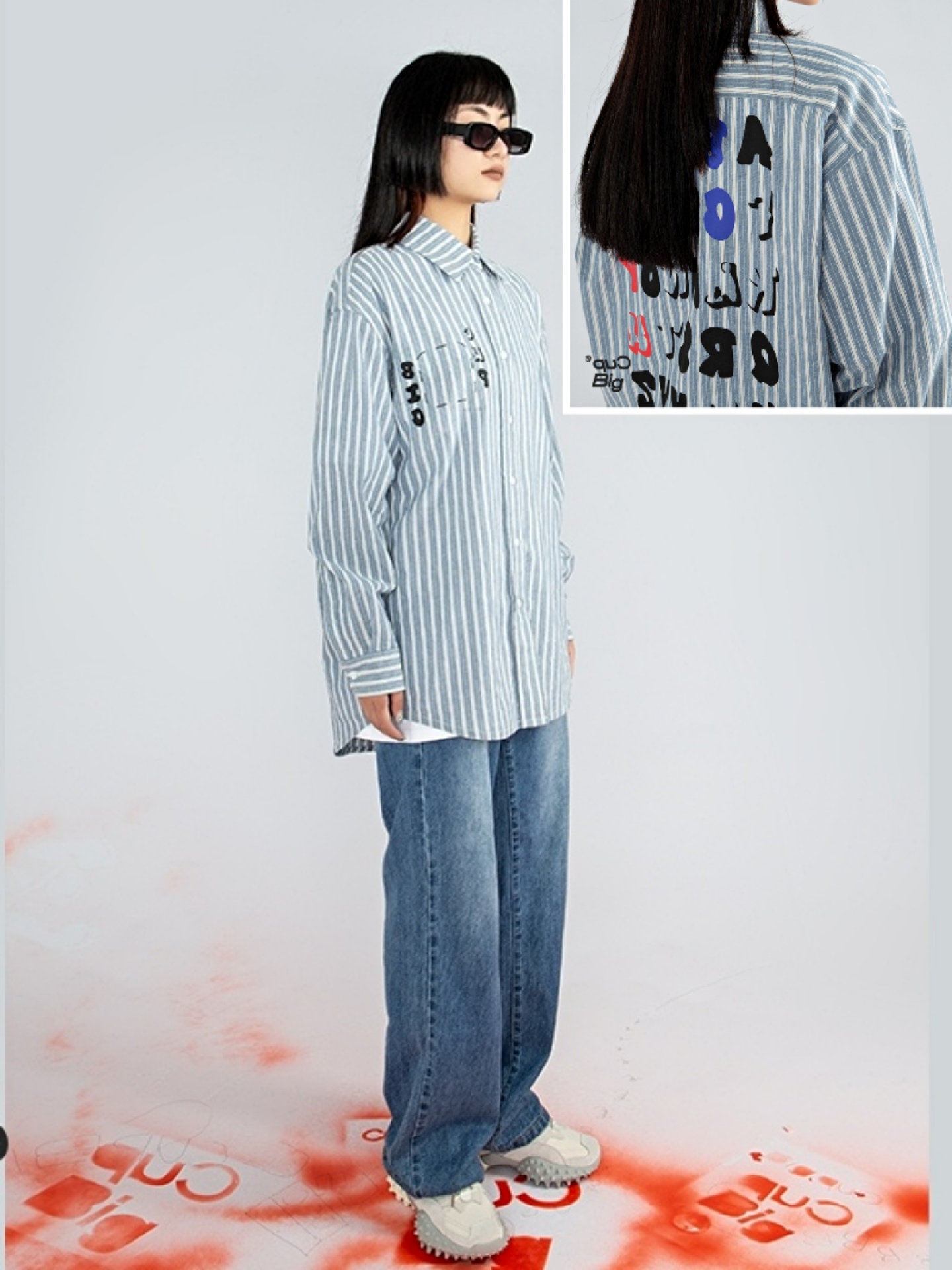 内搭蓝色条纹衬衣一侧和背面印有字母印花,直接外搭也很不错呢