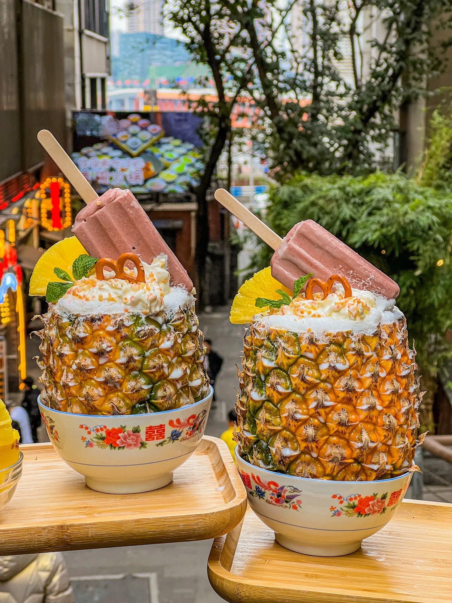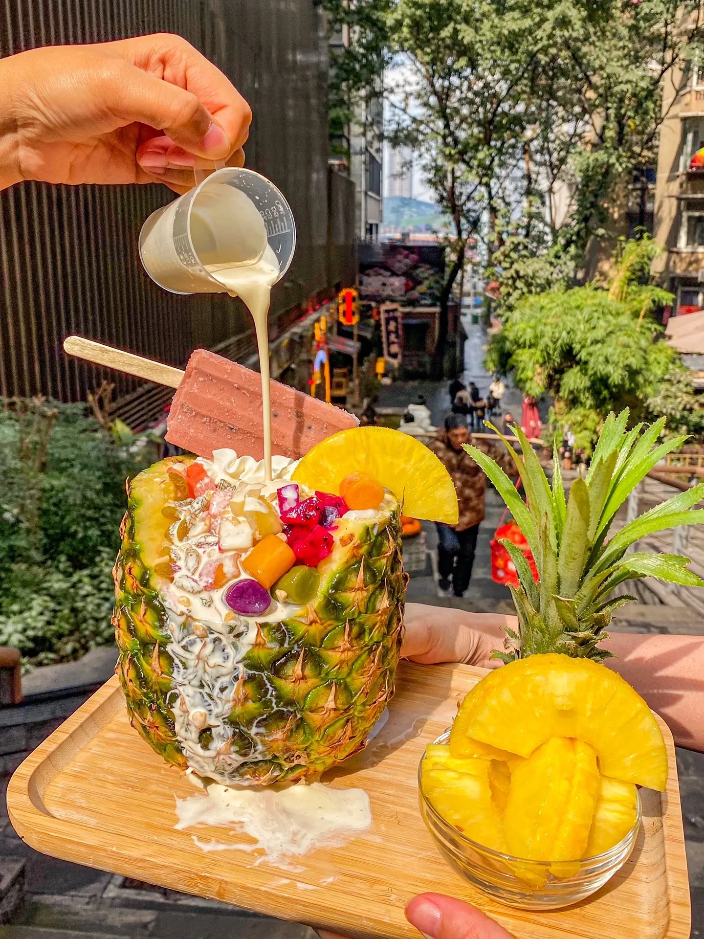 一整颗菠萝也太巴适了!里面的料多到爆炸💥芋圆、水果、葡萄干等,还有一大只冰棍儿~