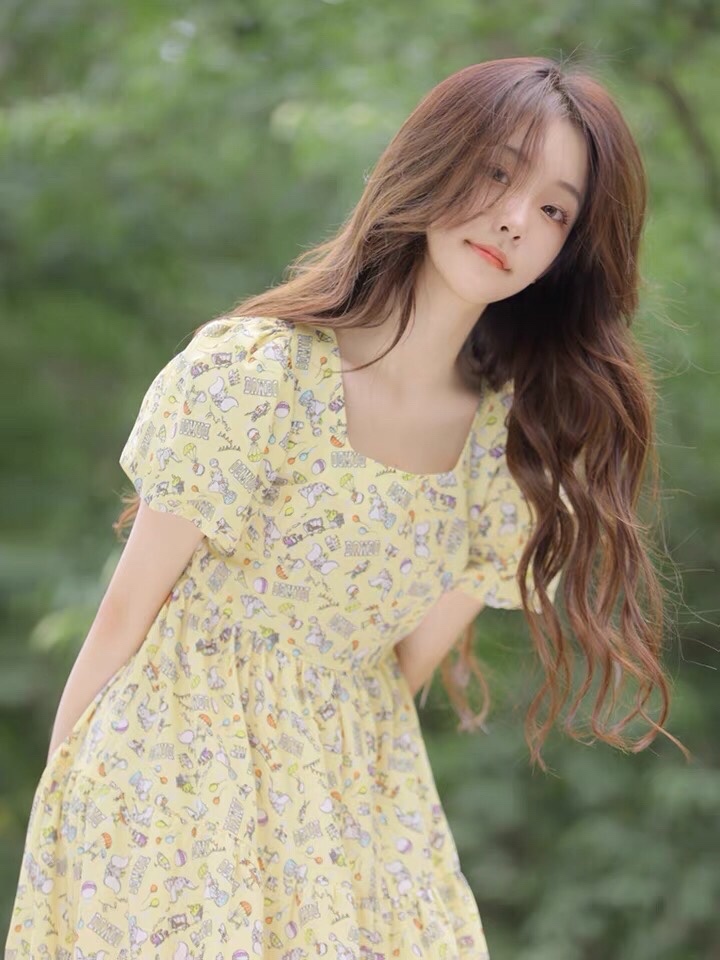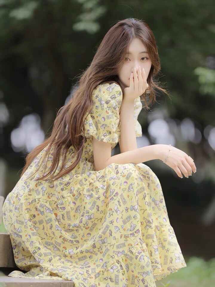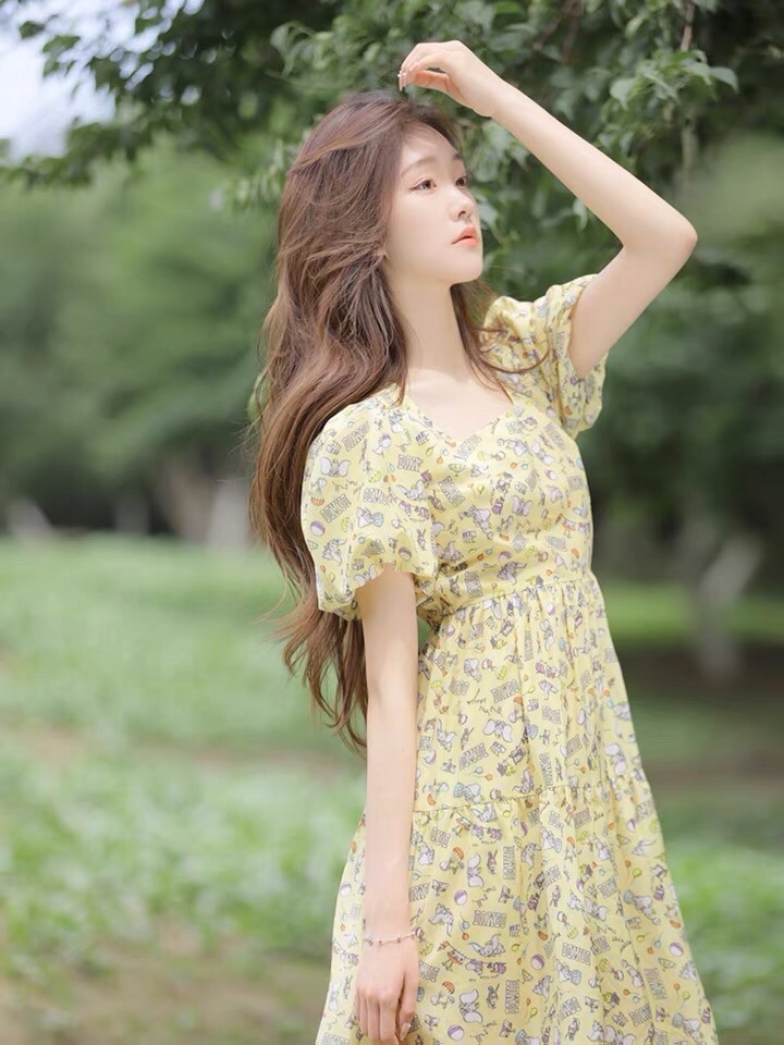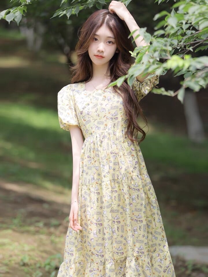 法式甜美超仙泡泡袖连衣裙夏季新款收腰复古淡黄色碎花长裙