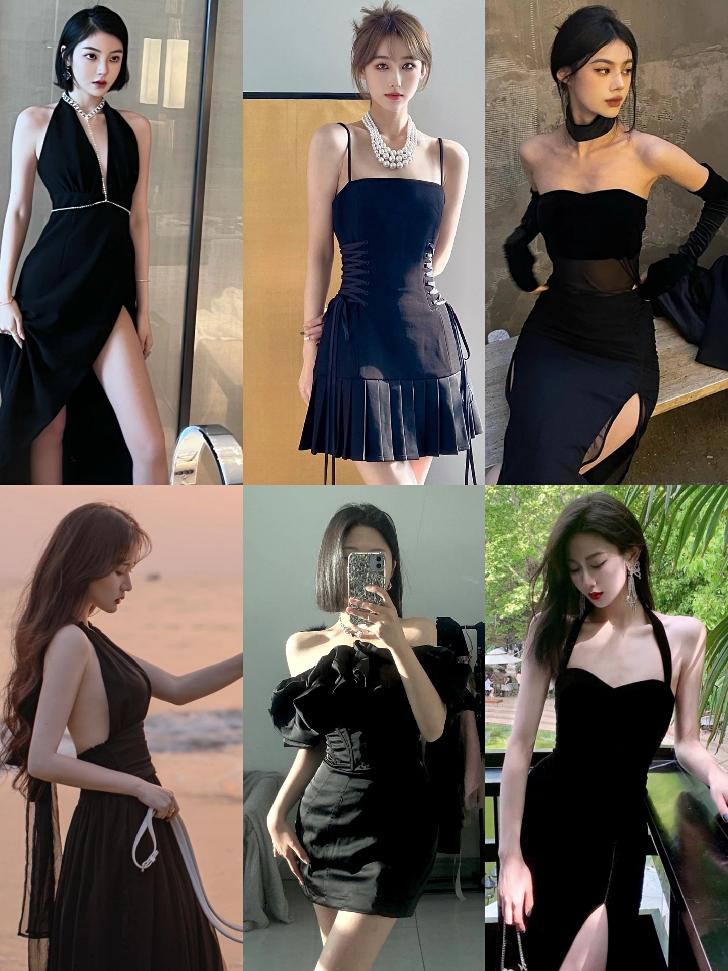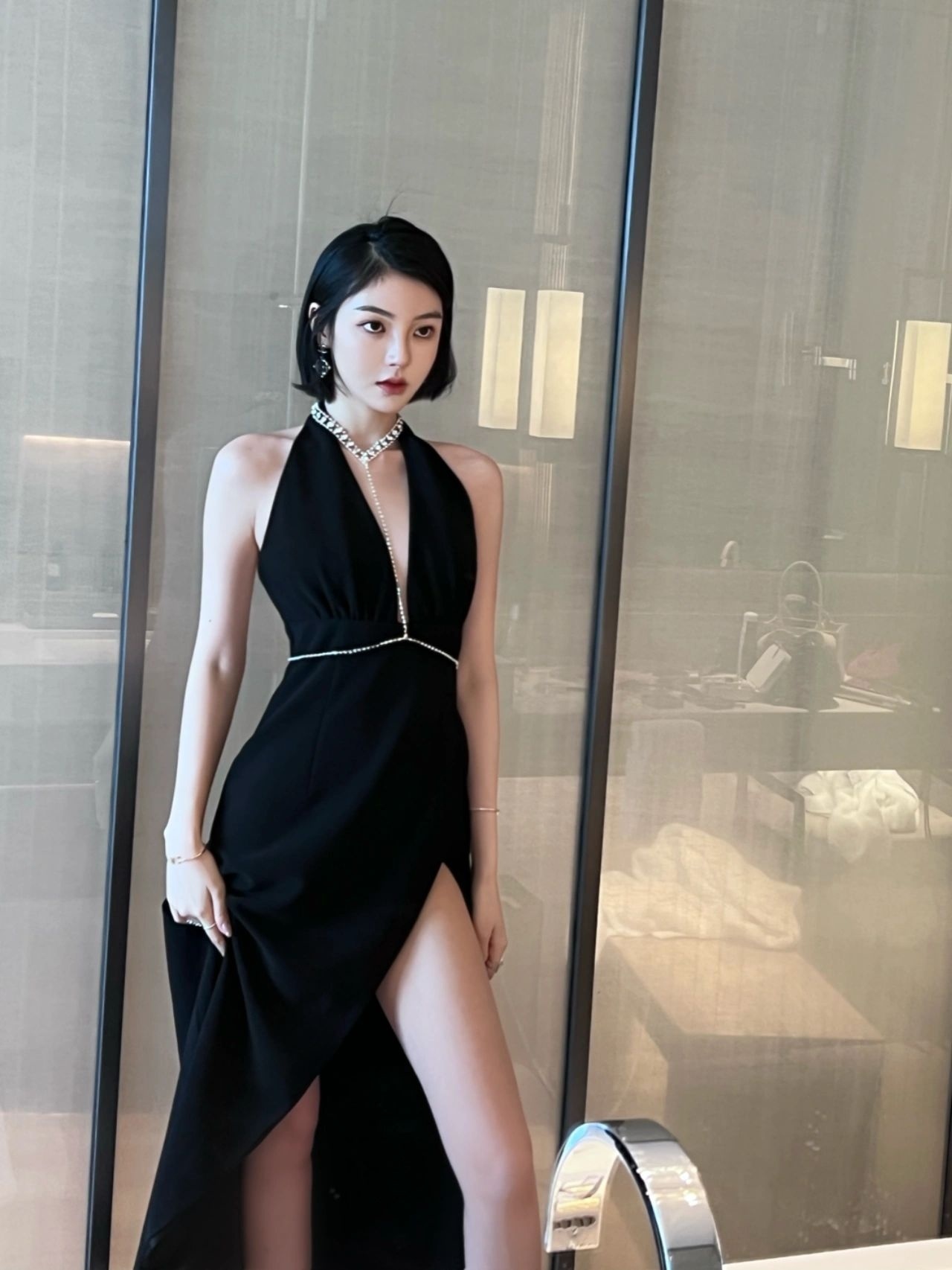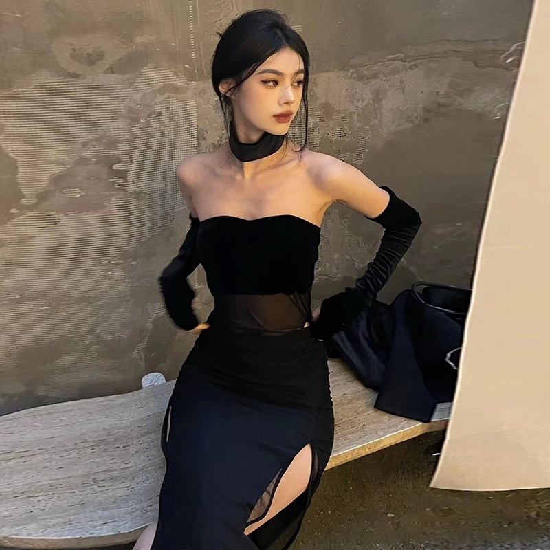 黑色连衣裙高级感设计感小众气质性感显瘦收腰开叉挂脖包臀裙女冬