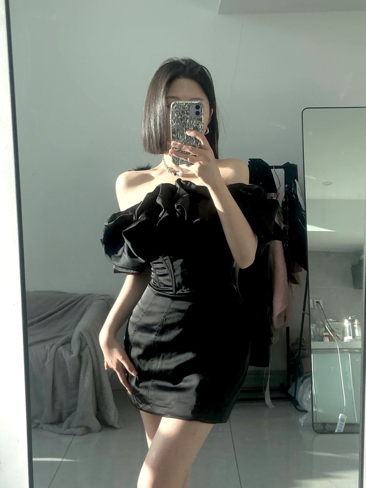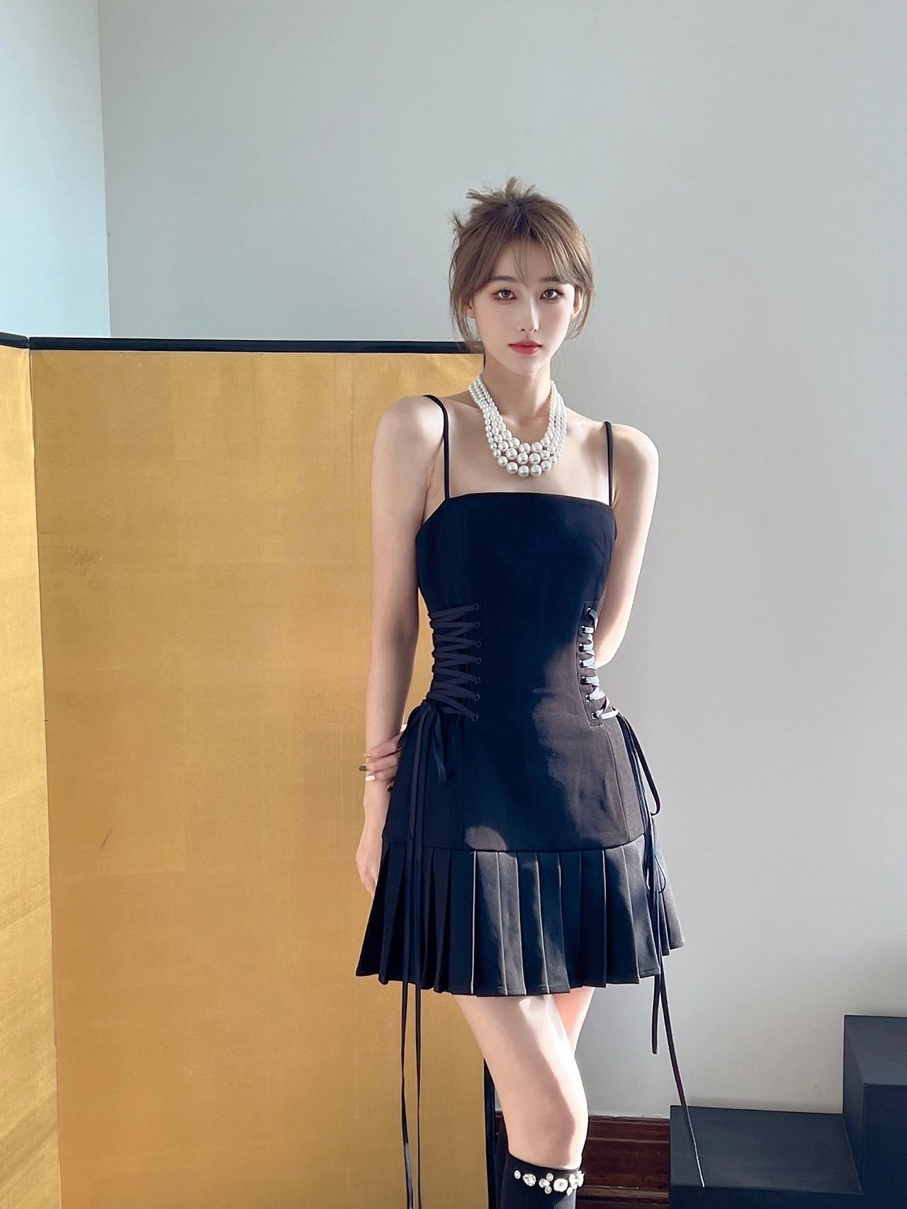 黑色连衣裙气质显瘦设计感小众高级收腰小个子裹胸露肩法式吊带裙