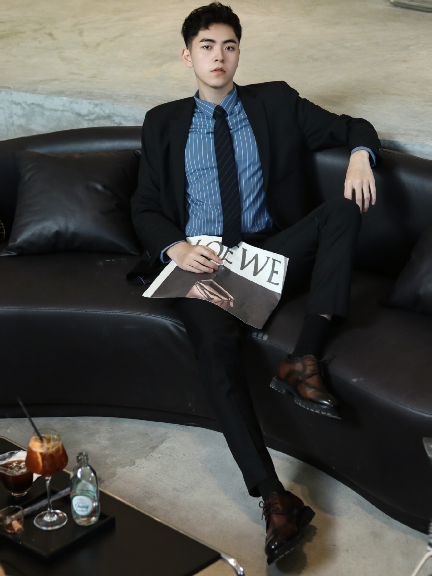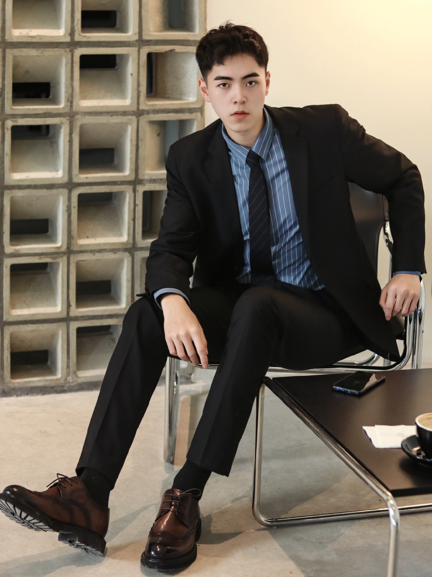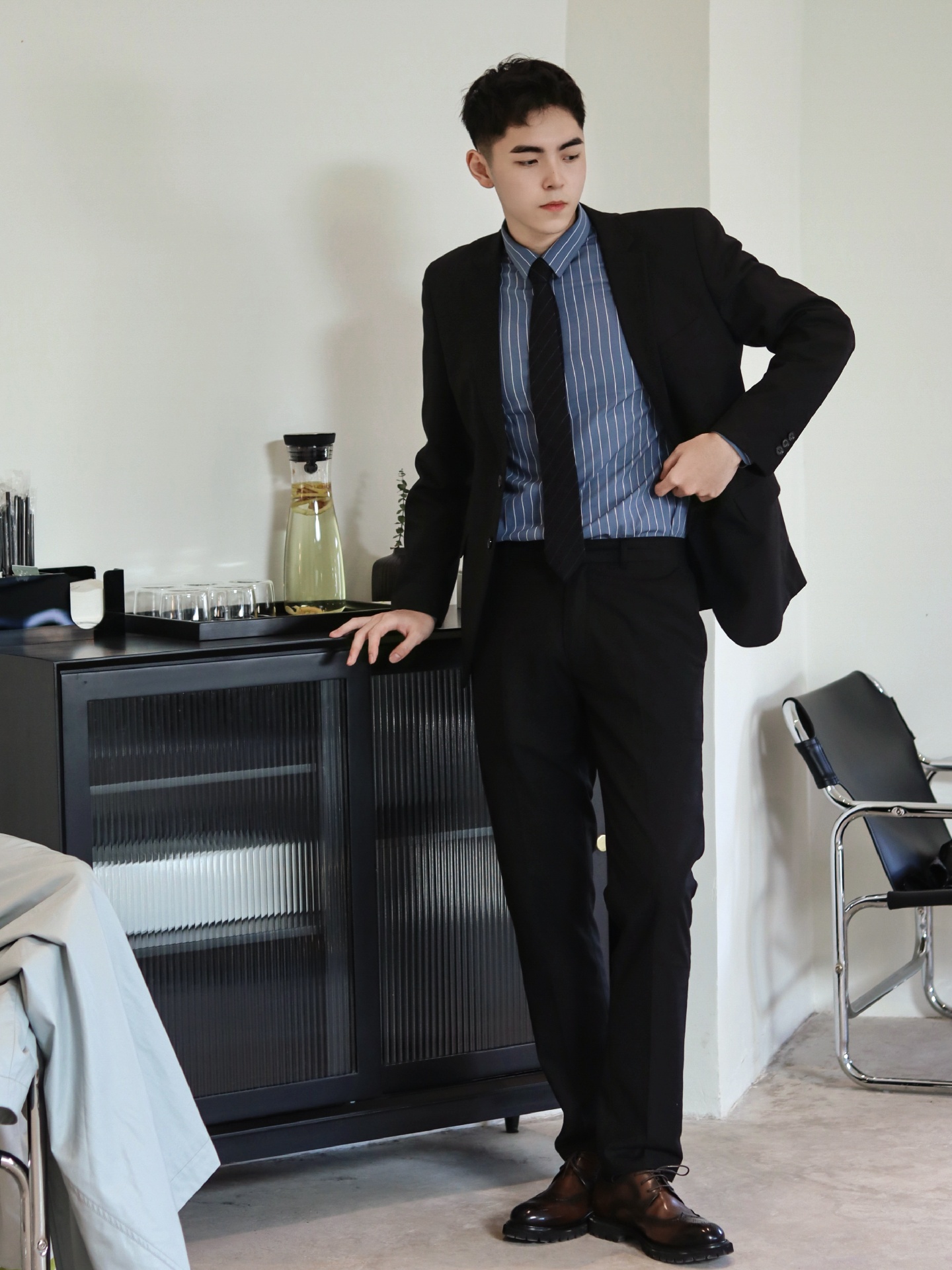黑色西装➕蓝色条纹衬衣➕深蓝色条纹领带➕黑袜➕皮鞋