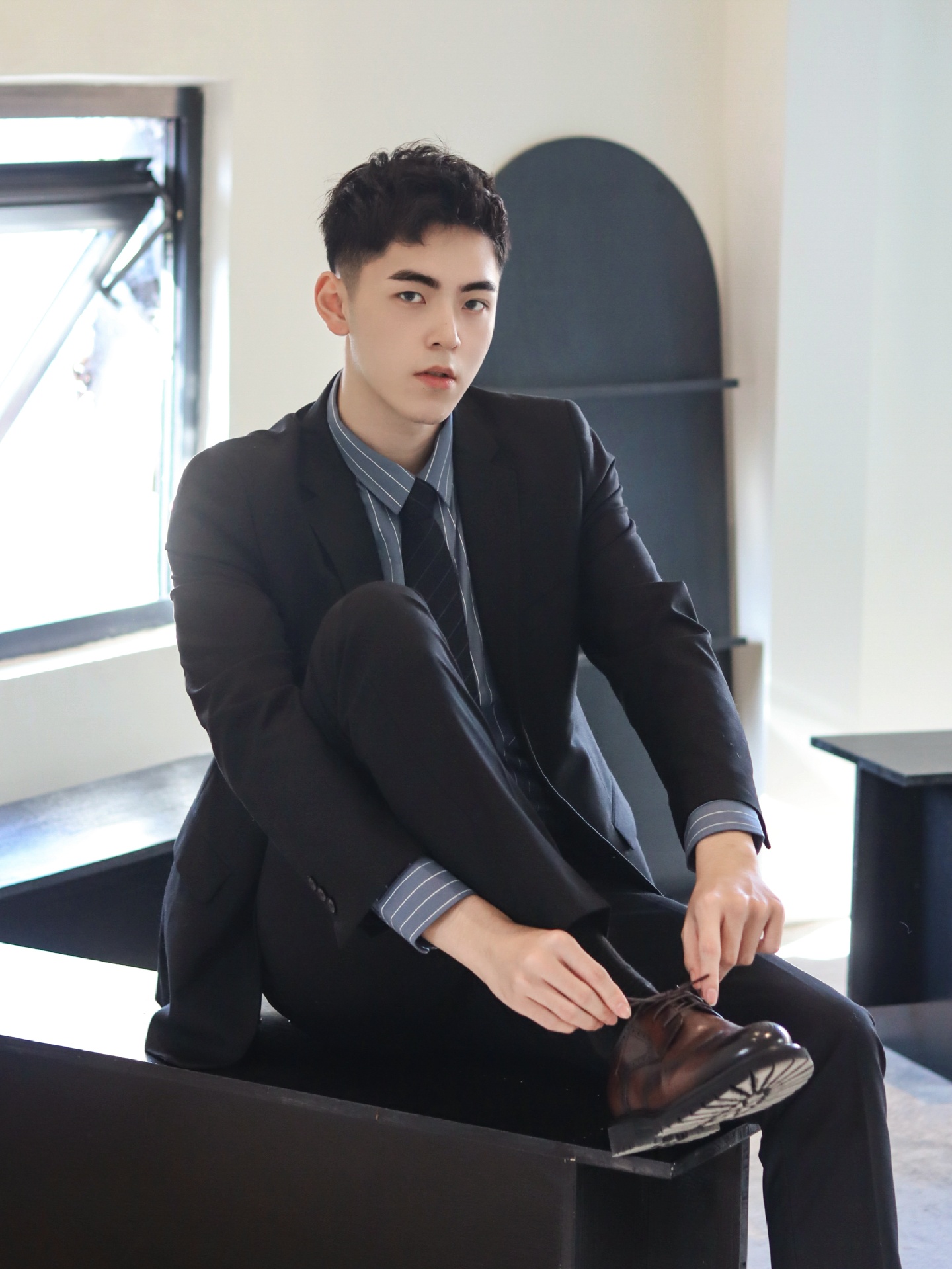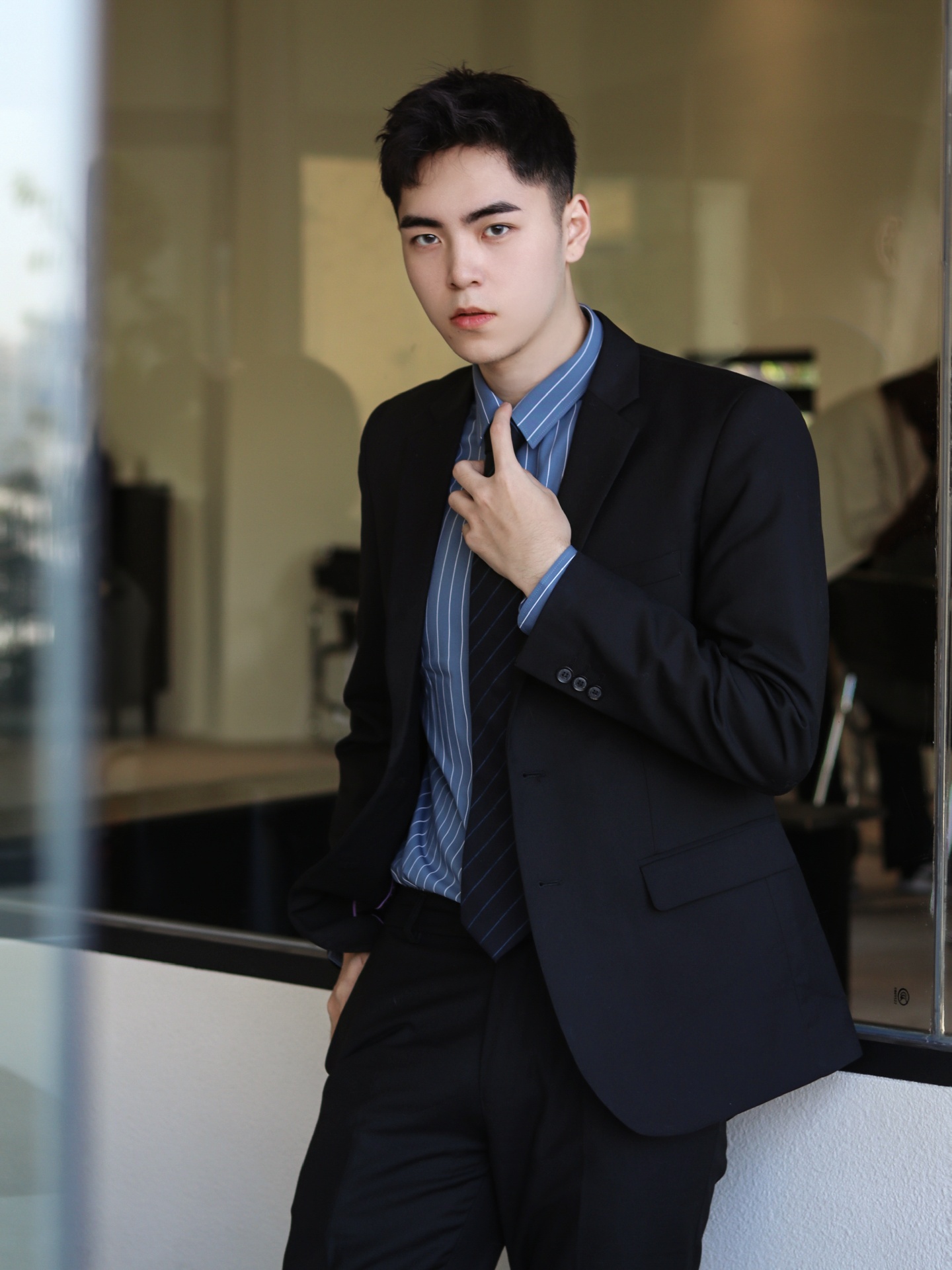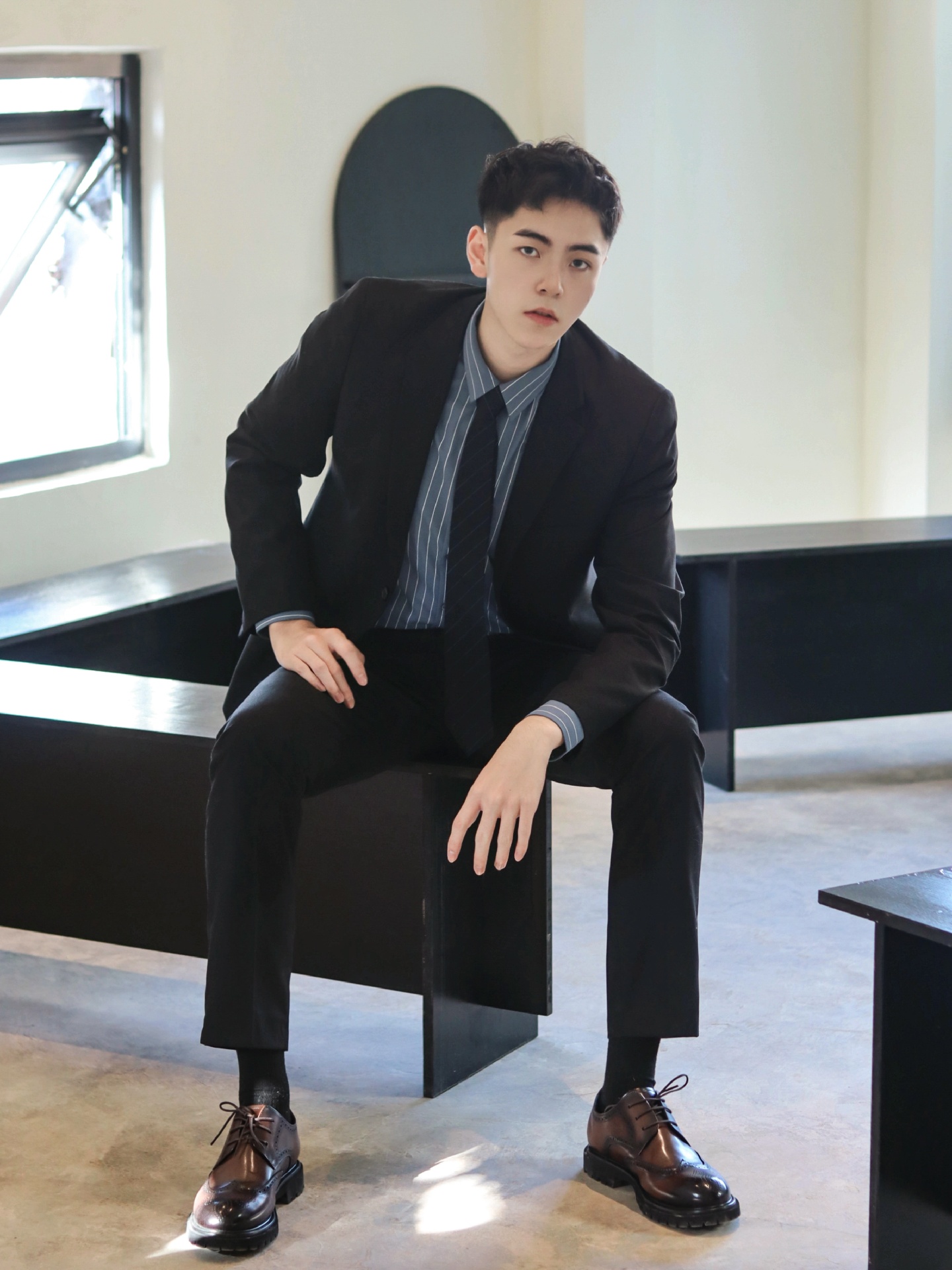 黑色西装➕蓝色条纹衬衣➕深蓝色条纹领带➕黑袜➕皮鞋
