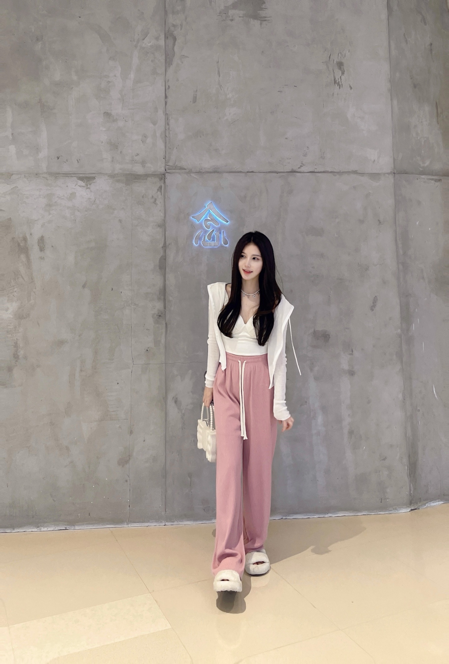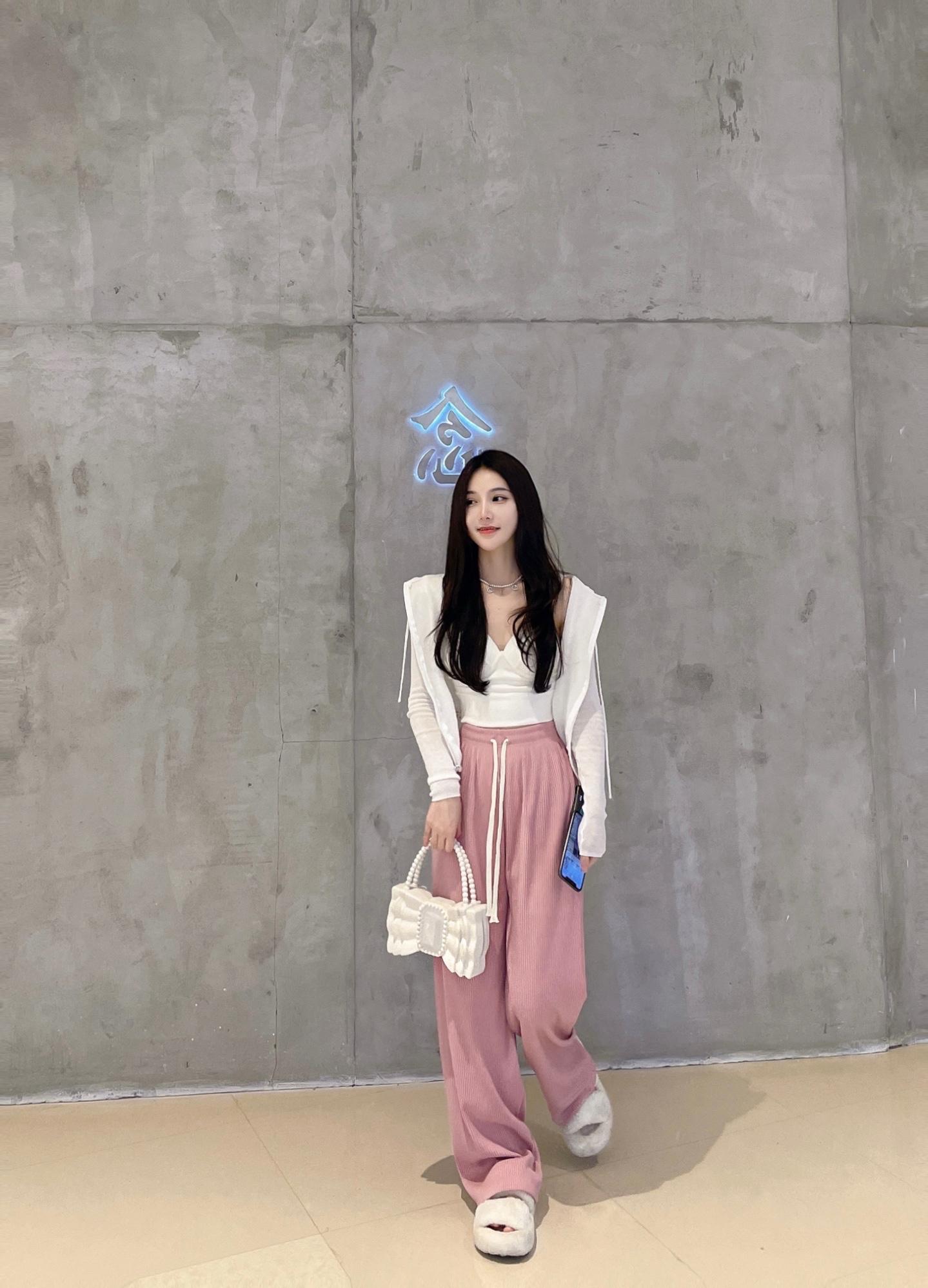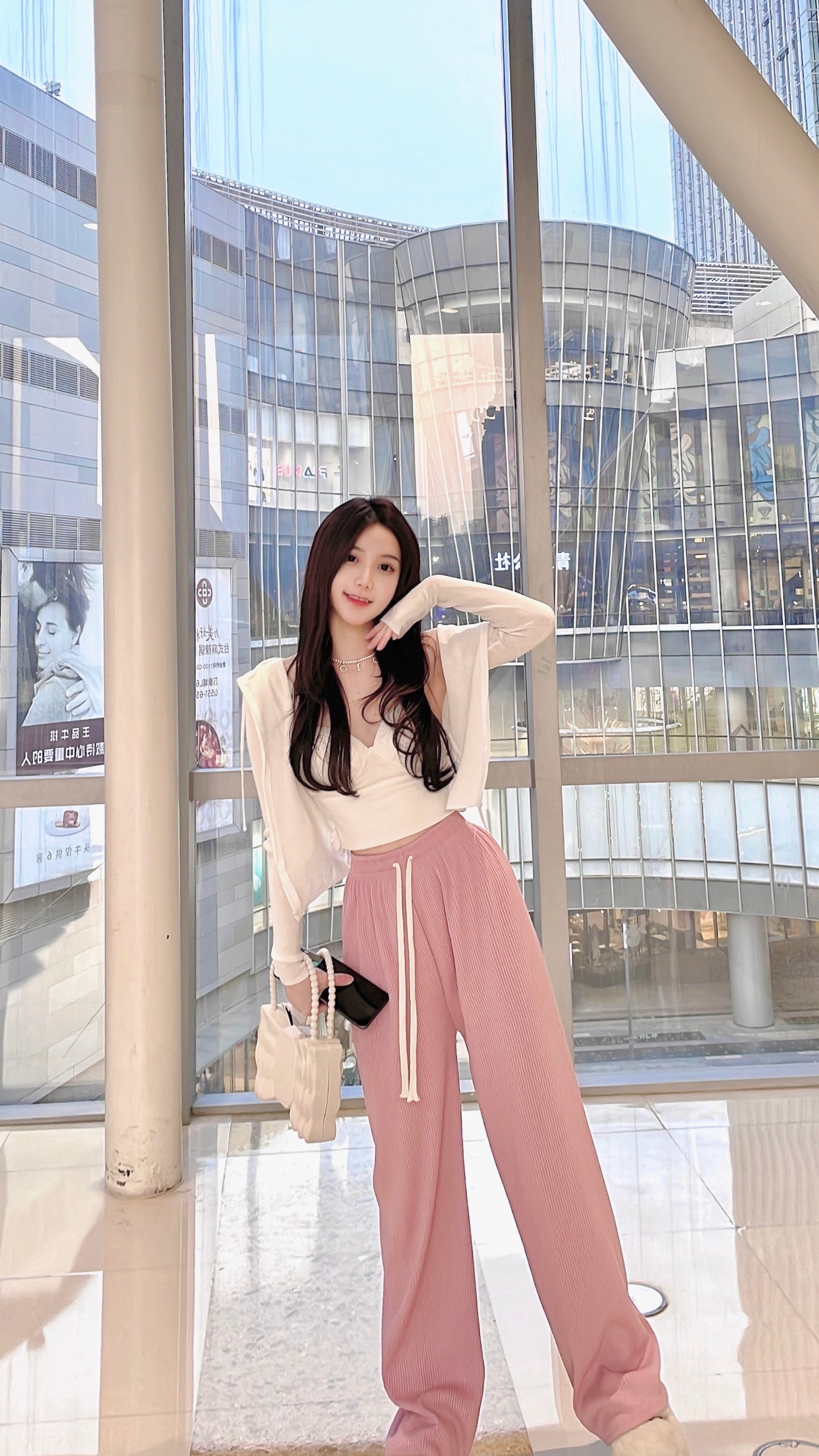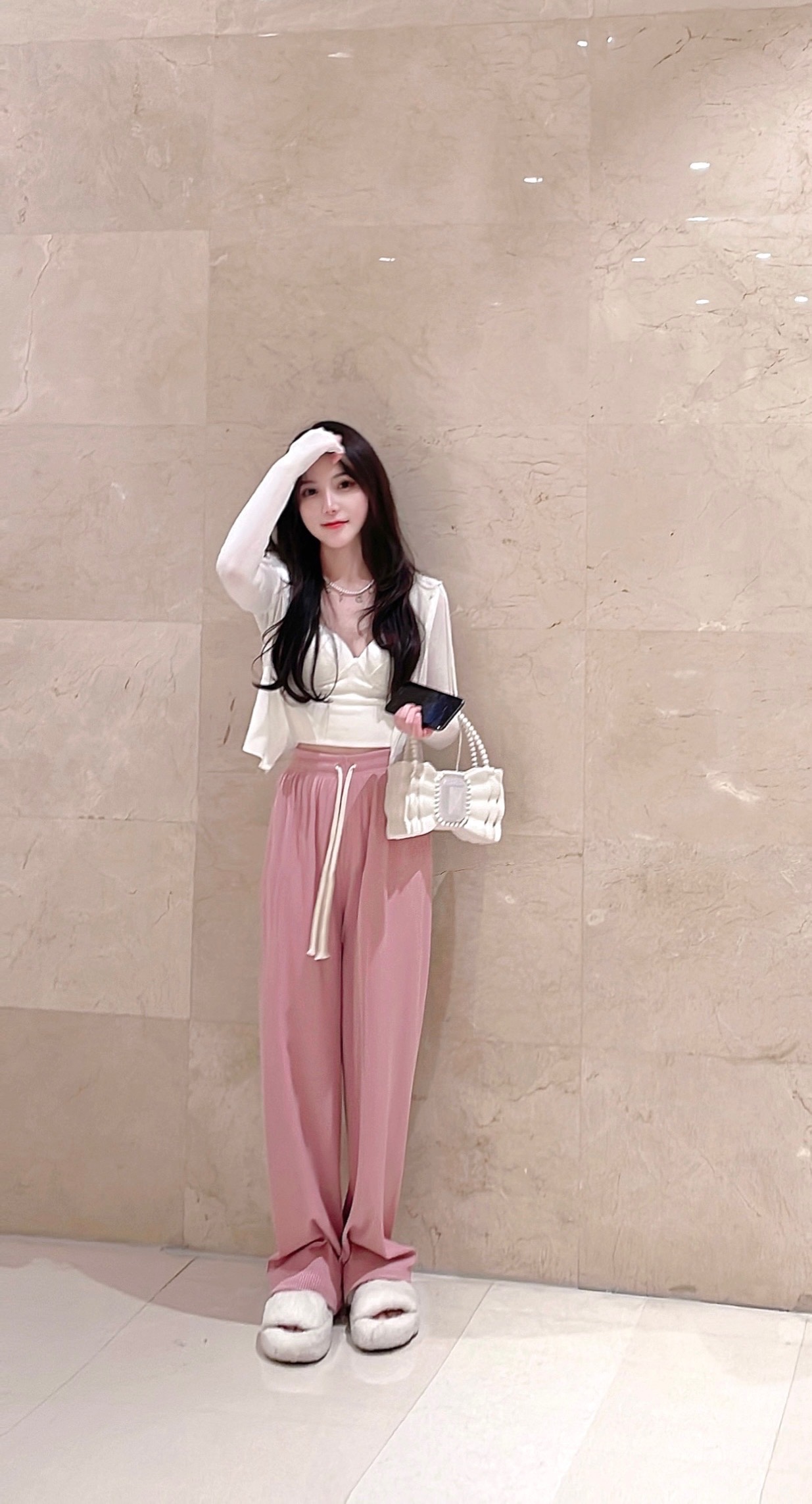 裤子我觉得很温柔,我很喜欢,搭配白色包包,开衫外套,一个珍珠项链
