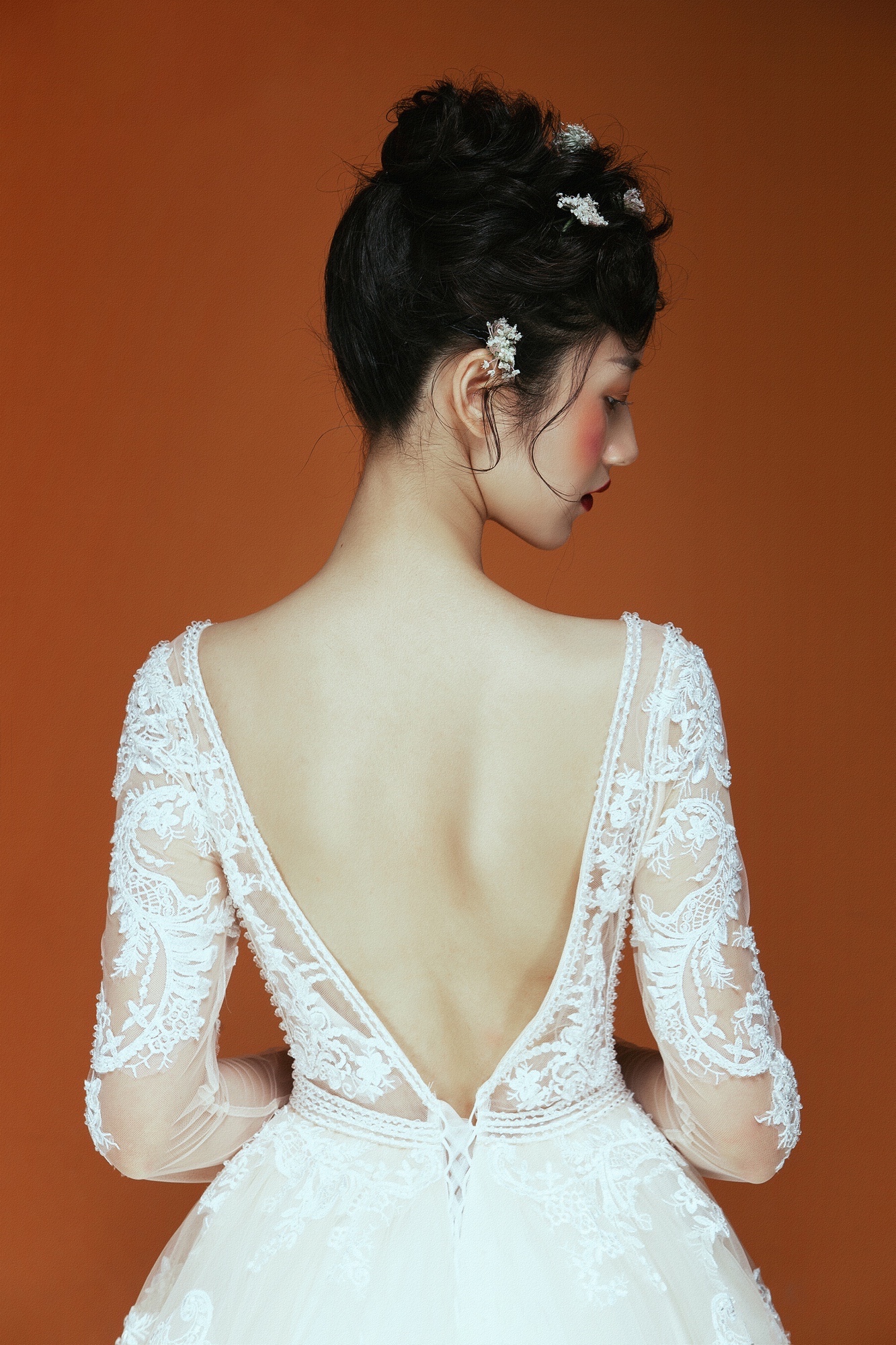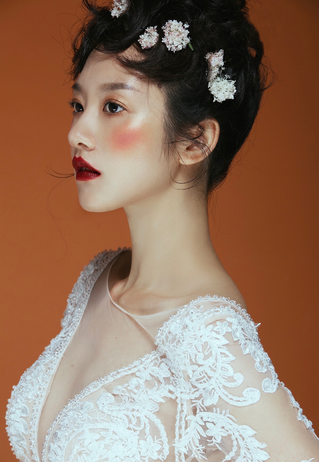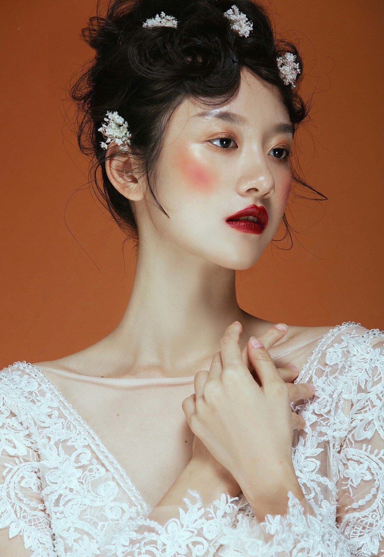 带有浓郁的中世纪风格,服饰的搭配以及复古发髻配饰,妆容重点体现在,油画质感腮红,复古唇妆。画中人柔美慵懒,气质安静古典,暗色调的油画风勾勒出少女温柔和腼腆的情绪,撩动心弦。