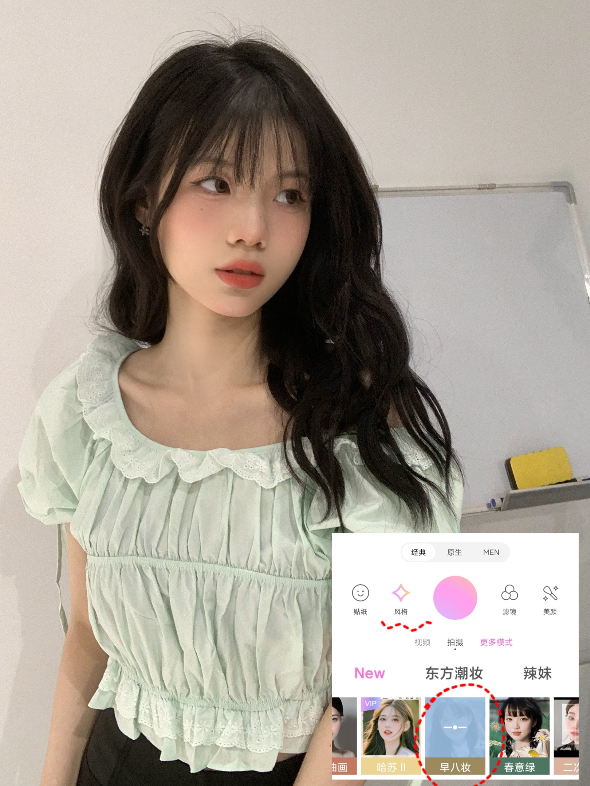 不会画的可以直接用美颜相机-风格-早八妆直接拍,学生妆很清淡!神仙滤镜