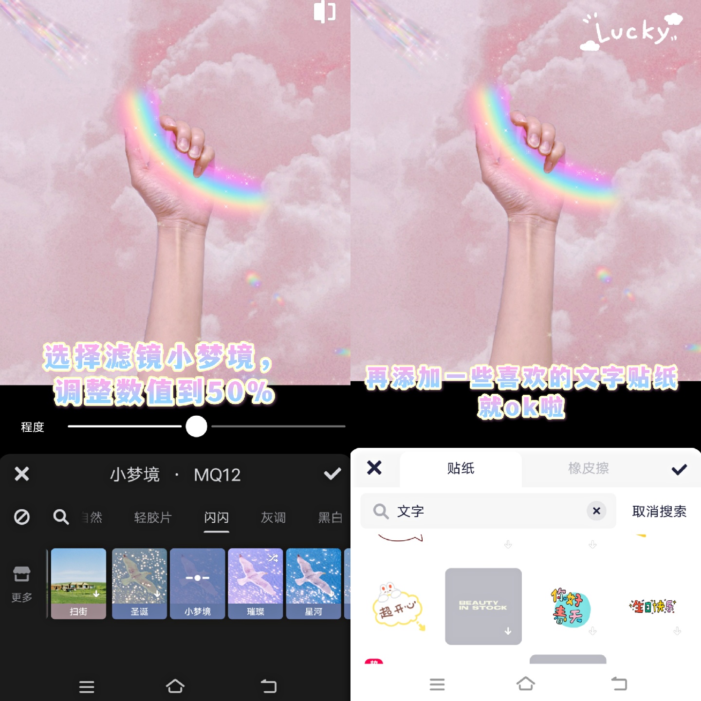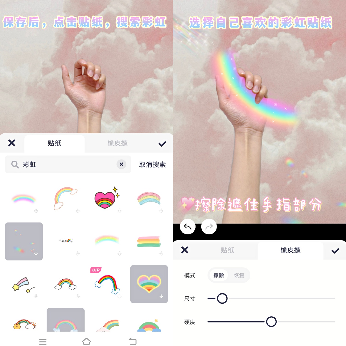 3.选择贴纸,搜索彩虹贴纸🌈、文字贴纸,按图中教程所示进行装饰