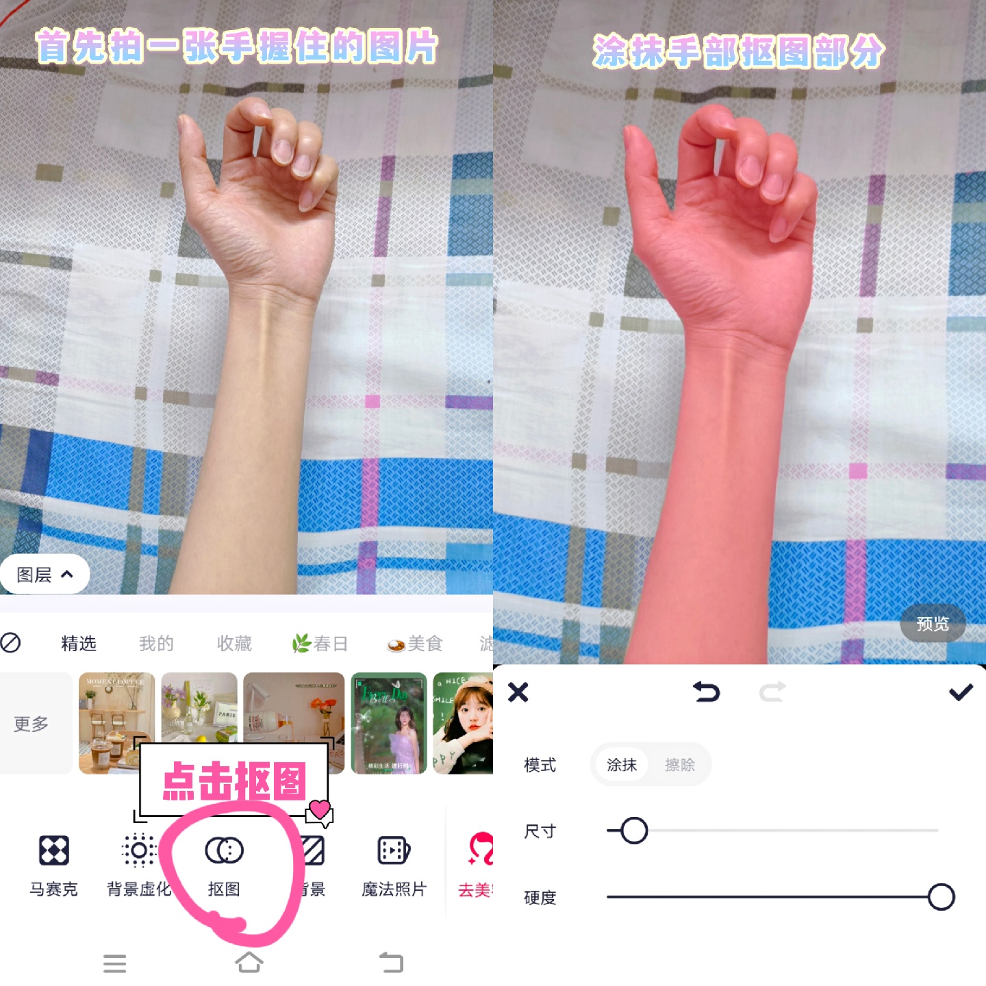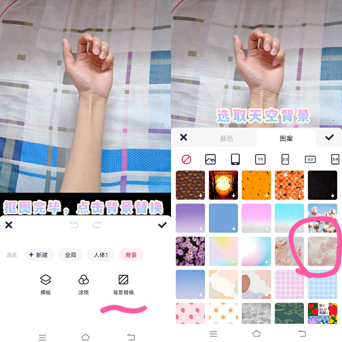 2.点击抠图,扣出手部部分,点击背景替换,选择天空背景