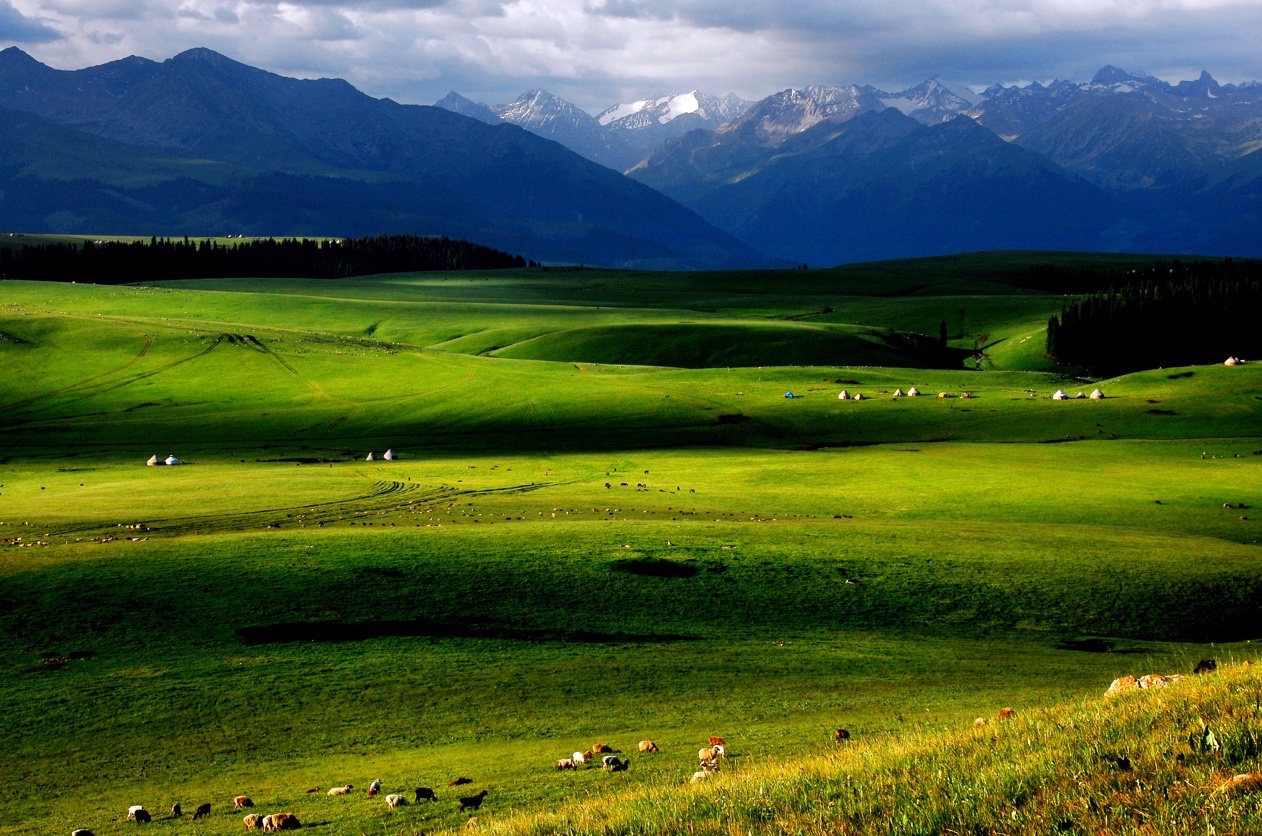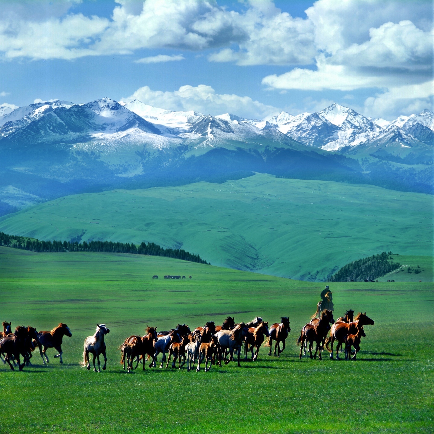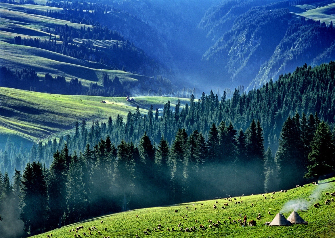 第一张:高山牧场。新疆特克斯县喀拉峻草原 恣意舒展的绿无边无际地流淌着,喀拉峻仍保留了千年的自然原始状态,一种雄浑苍茫的远古之气迎面扑来。