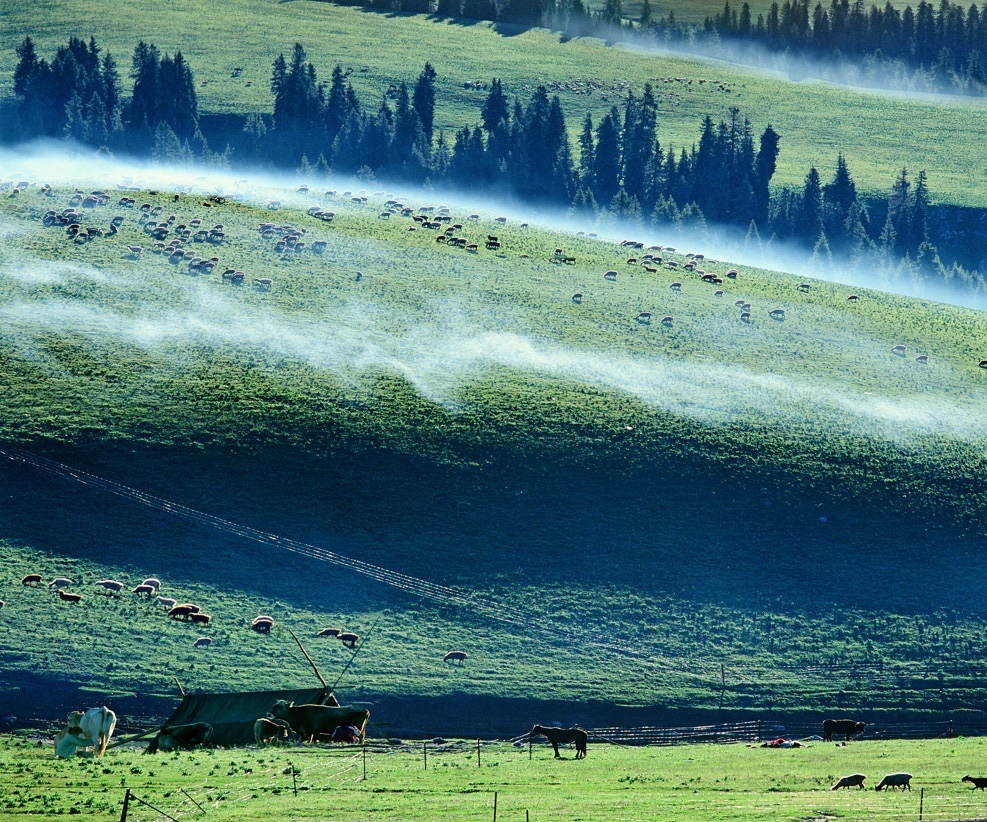 第五张:喀拉峻晨曦。 新疆特克斯县喀拉峻高山牧场 晨曦中的喀拉峻山峦,舒缓地起伏着她优美线条,晨雾飘渺,飘渺着妩媚,起伏着婀娜。