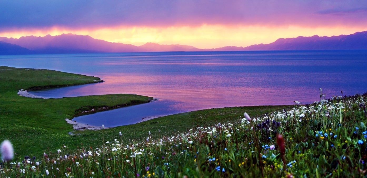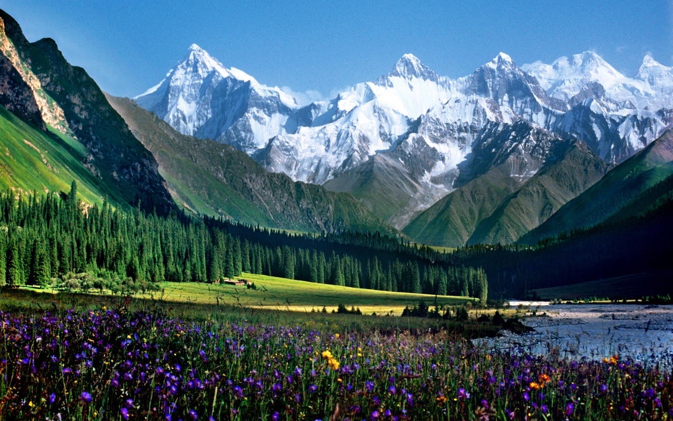 第八张:春到夏特峡谷 新疆夏召苏县夏塔特乡 夏特河水沿山势或奔涌或潺潺地流淌,河谷延伸着无限的绿,山花竞放,云杉高耸,云杉的后面是一片连绵的雪山,拥戴着英雄的汗腾格里冰峰。