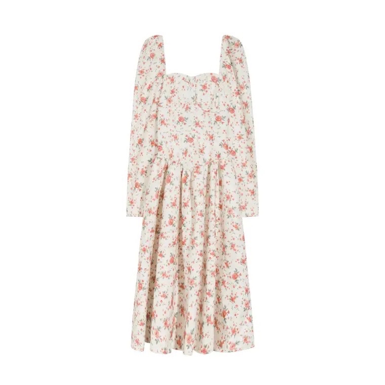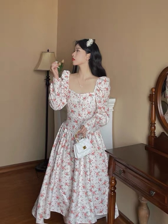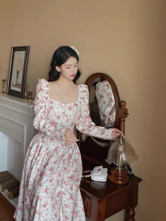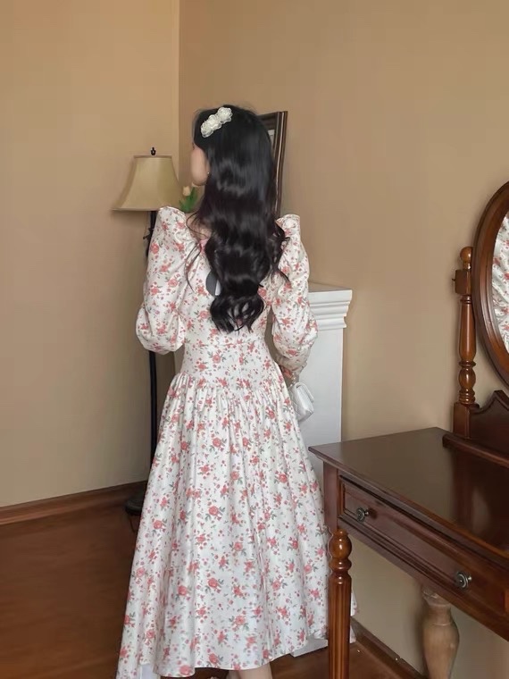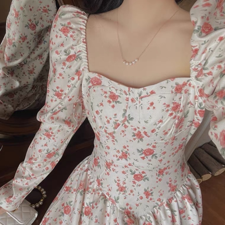 奶甜收腰连衣裙女春法式温柔复古碎花温柔方领收腰长裙