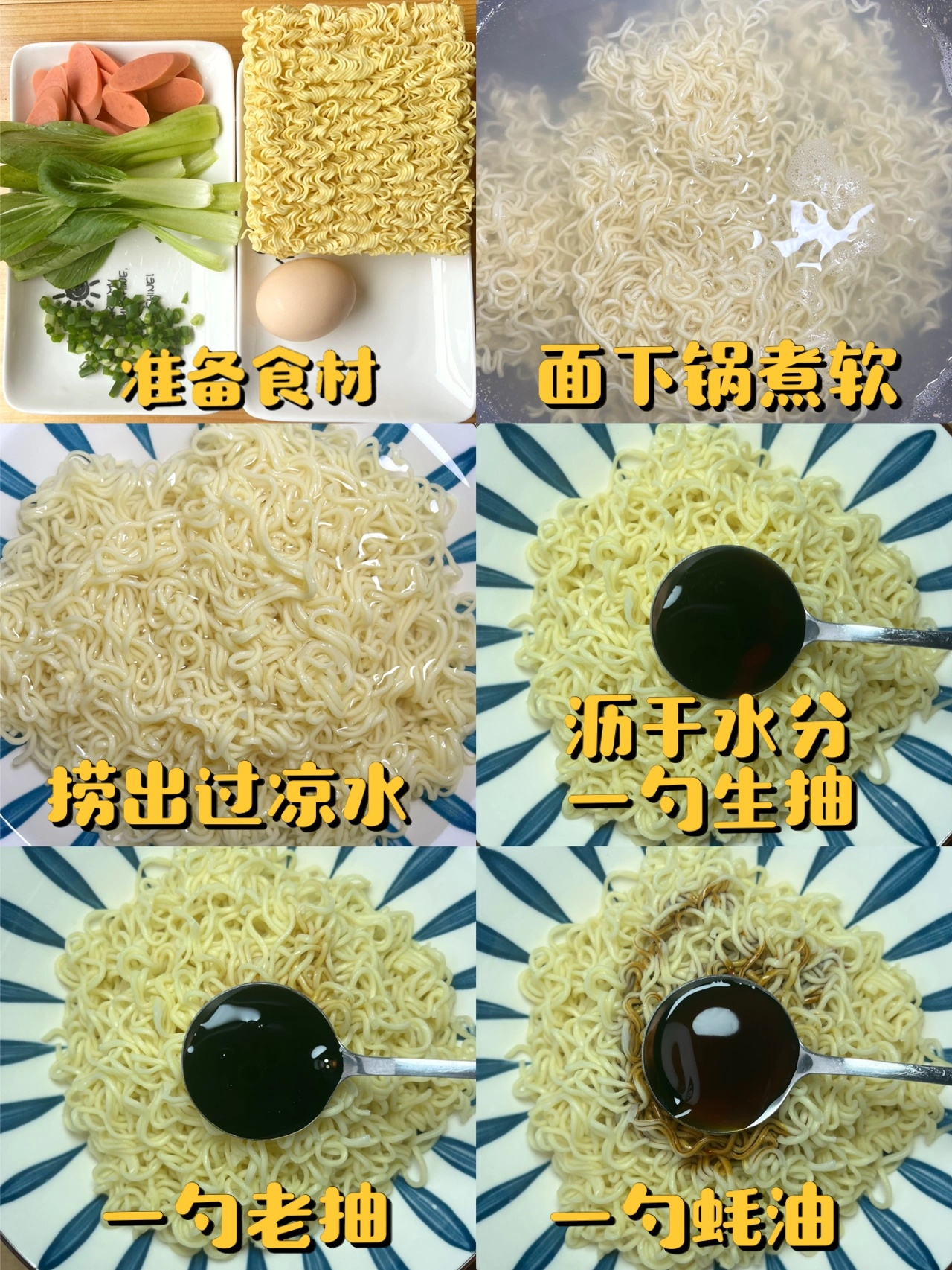 1️⃣水开煮方便面,煮软捞出过凉水,沥干水分加一勺生抽、一勺老抽、一勺蚝油、半勺白糖,搅拌均匀