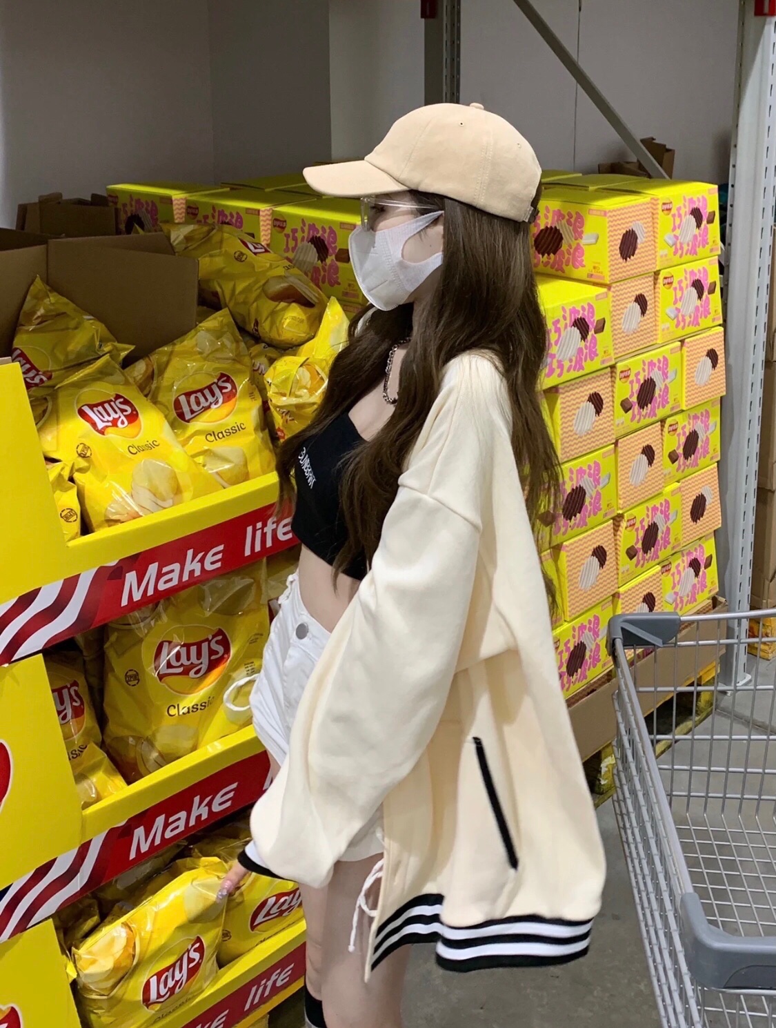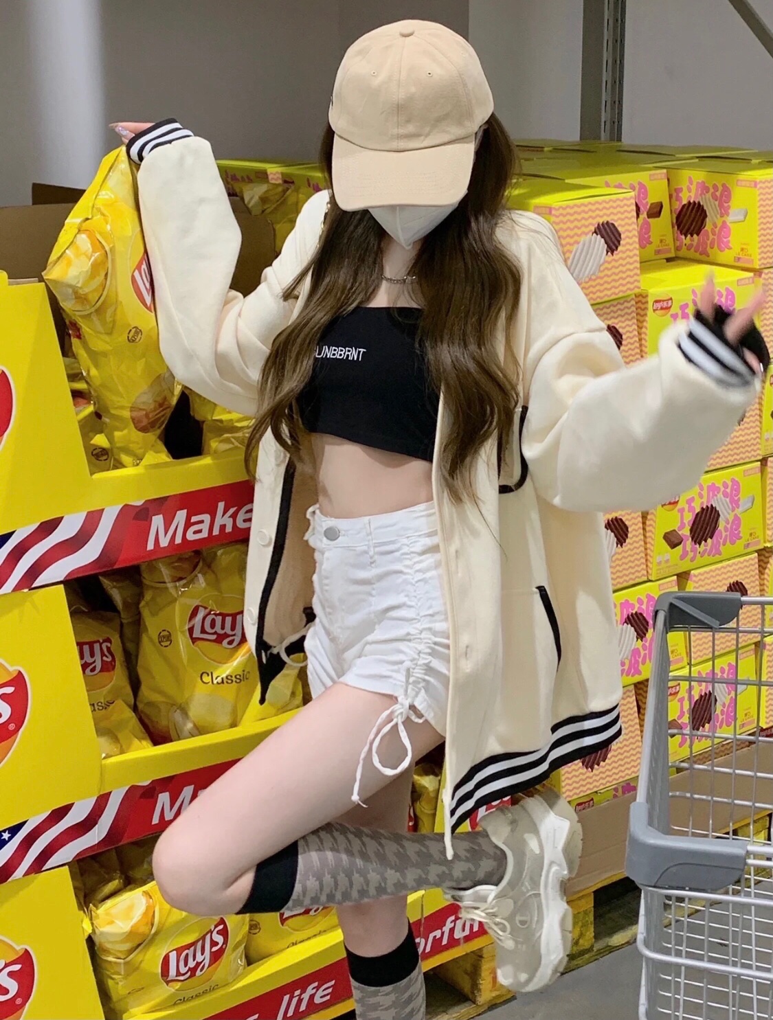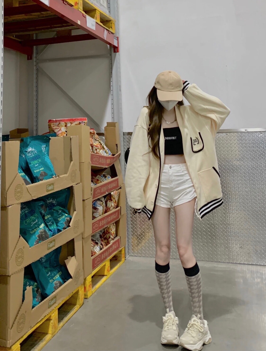 棒球服搭配内搭抹胸牛仔短裤