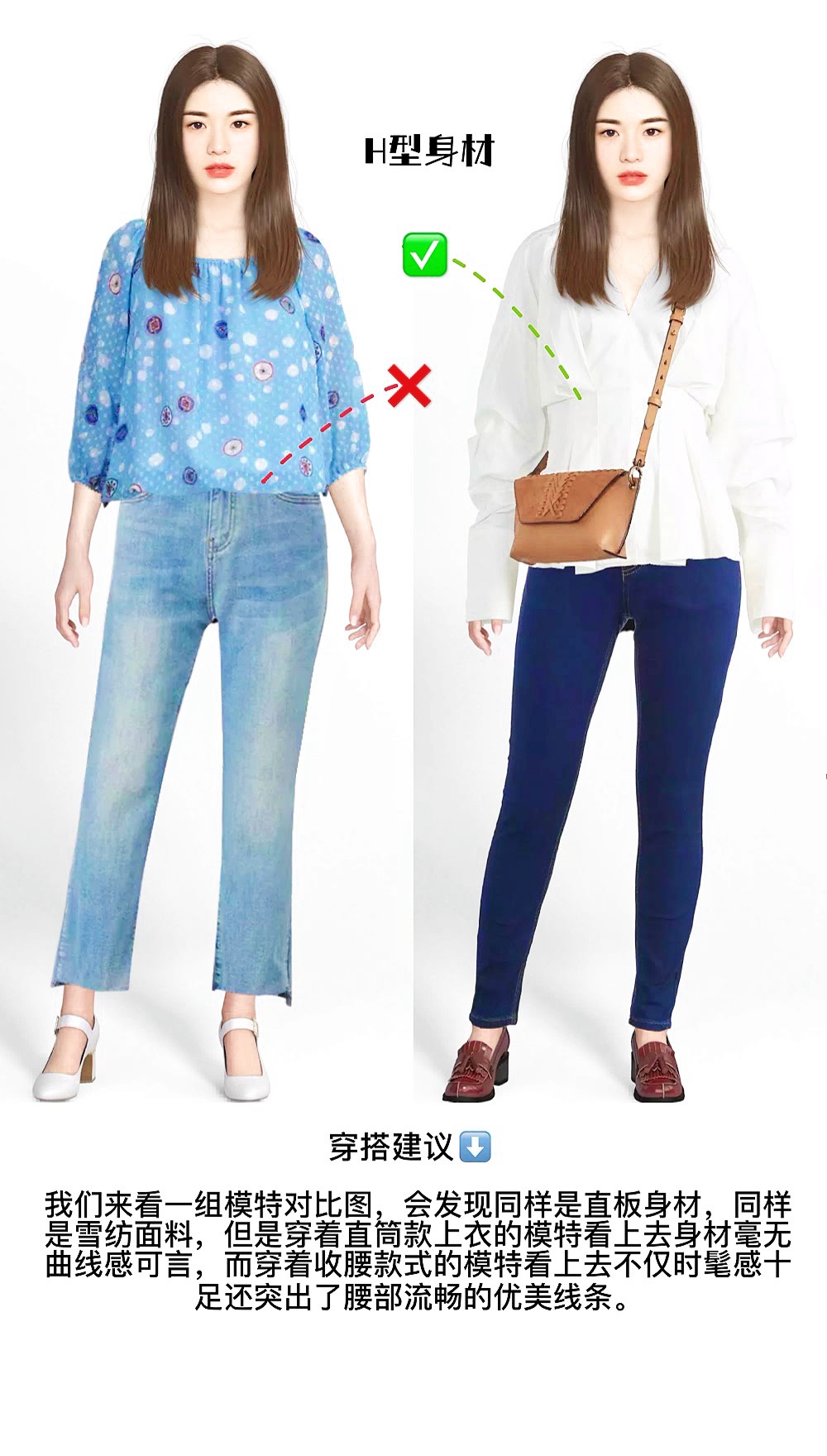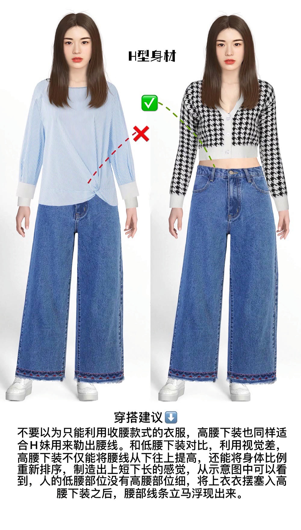 2⃣利用视觉差,高腰下装不仅能将腰线从下往上提高,展现腰部最细的地方,还能将身体比例重新排序,制造出上短下长的感觉。
