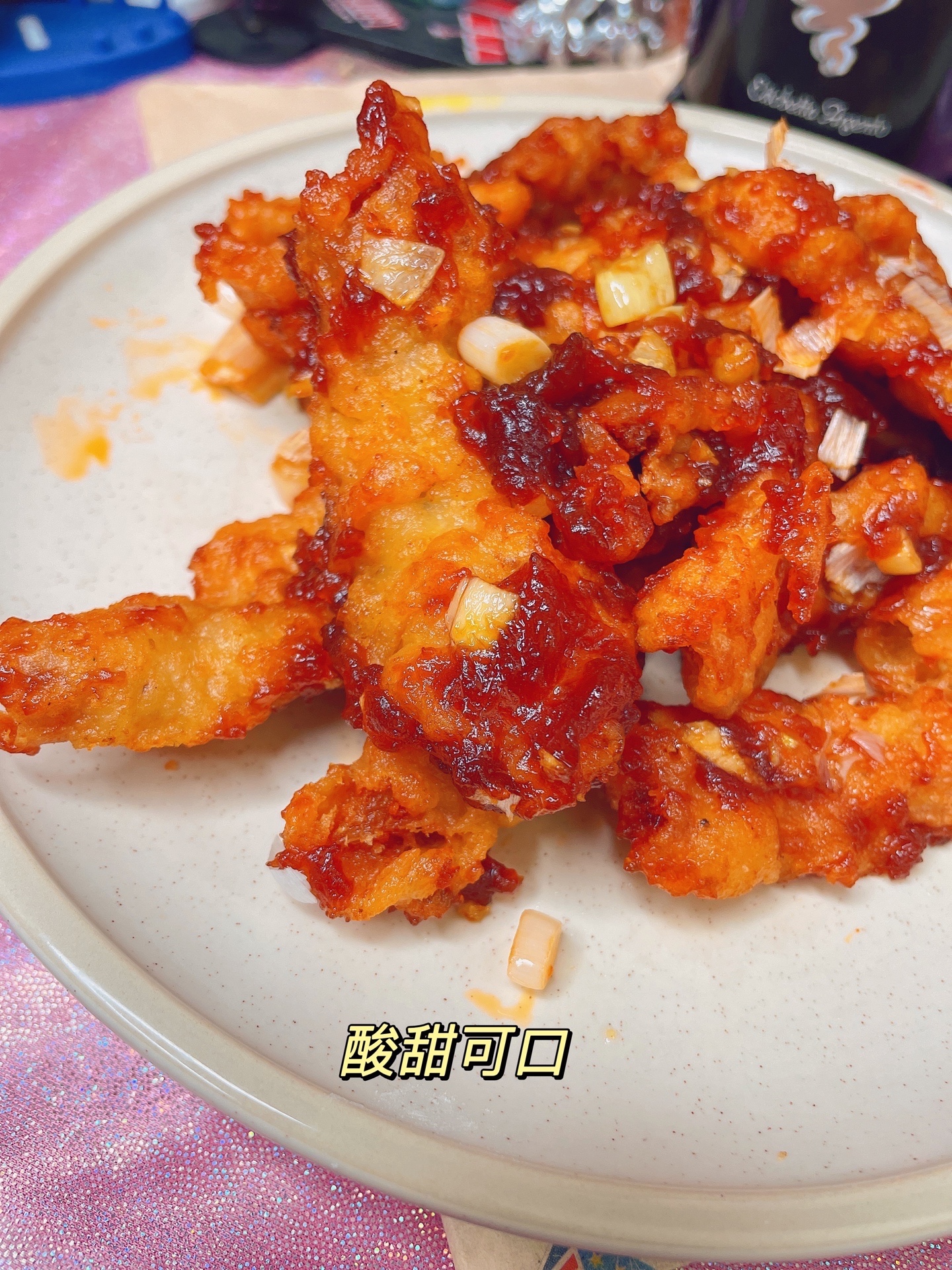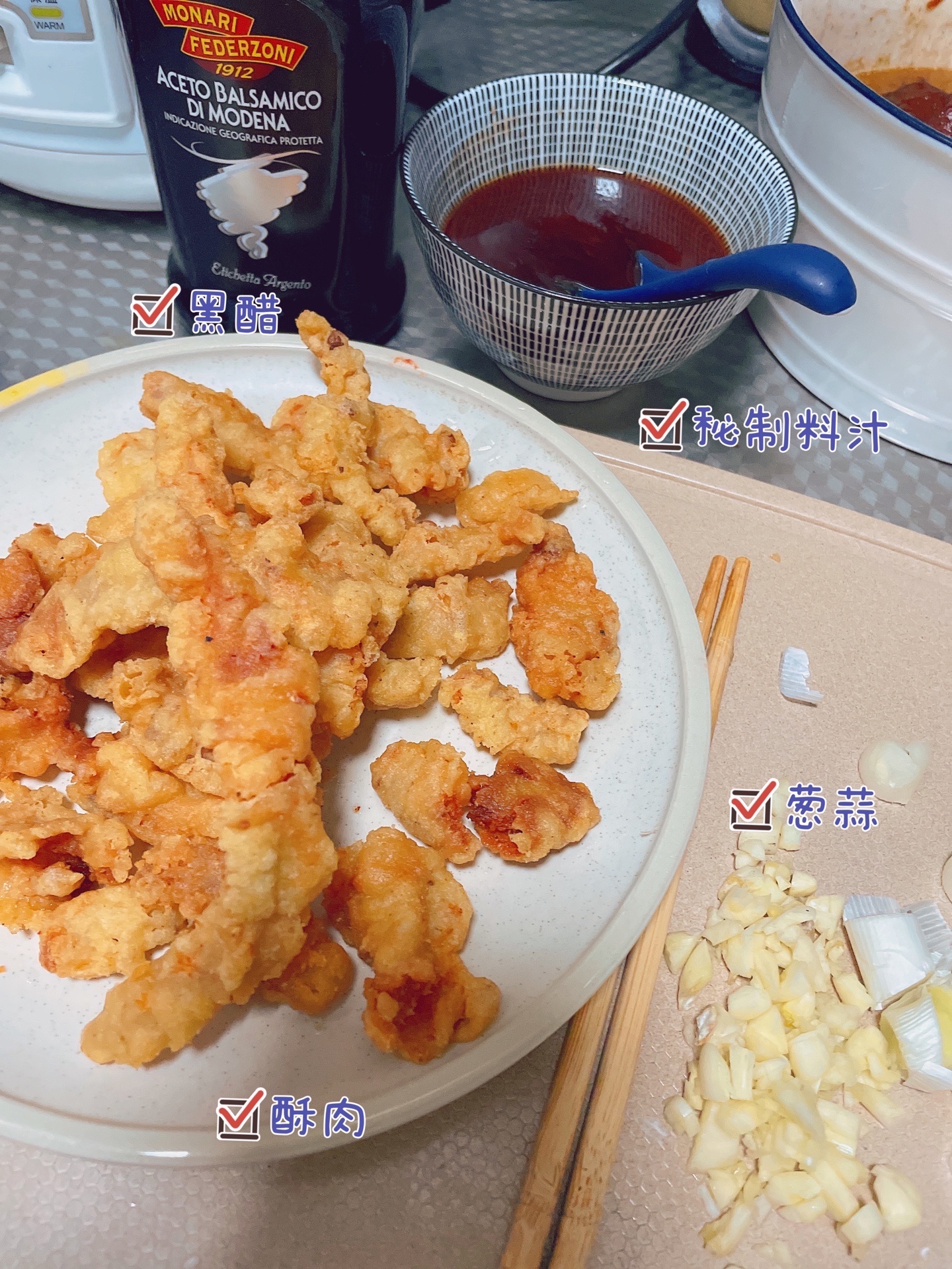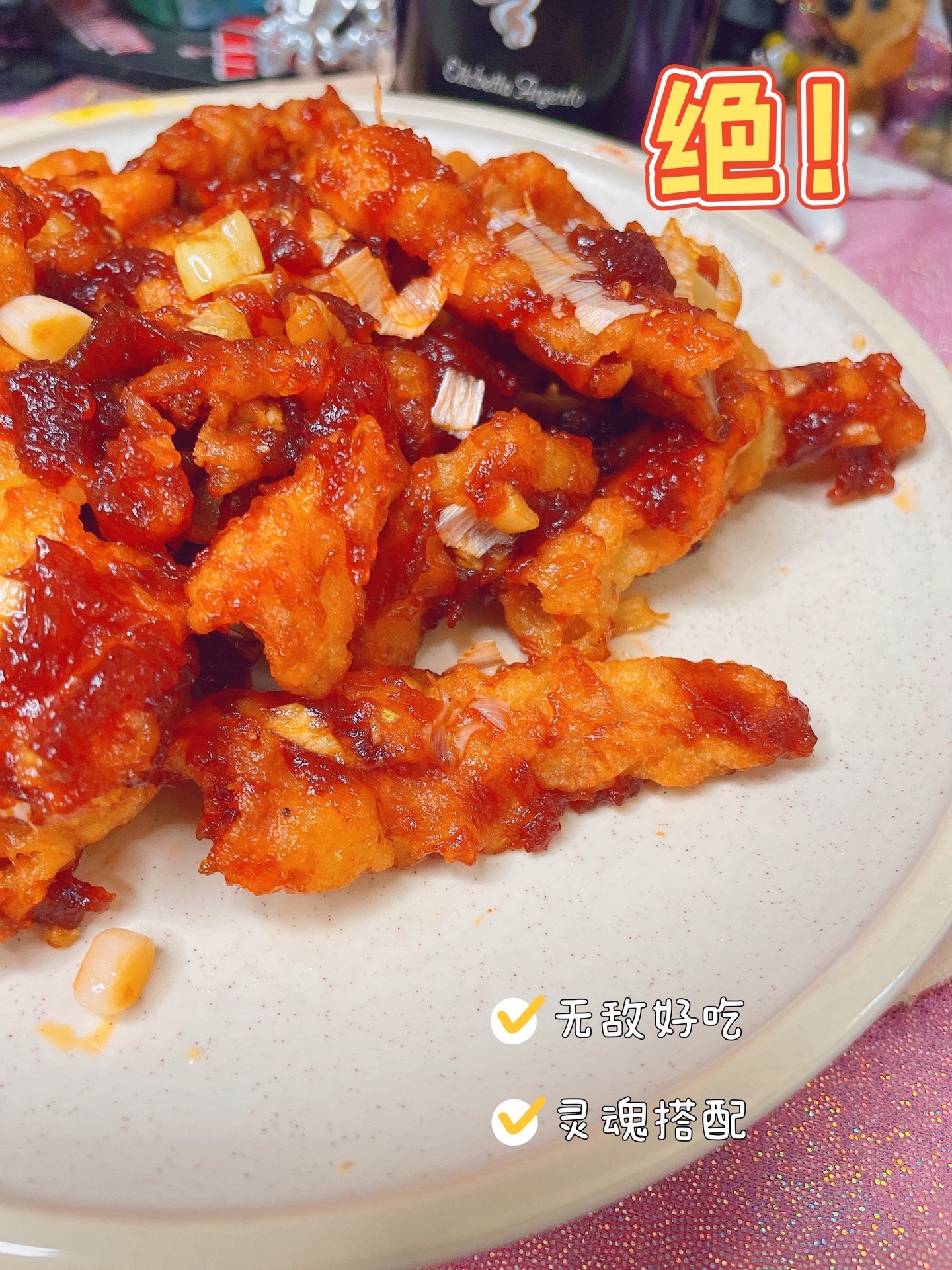 热油,放葱碎和蒜🧄末,料汁放进去翻炒两下,把酥肉放进去裹上酱汁就好了!