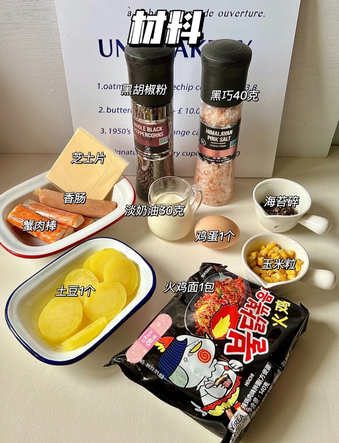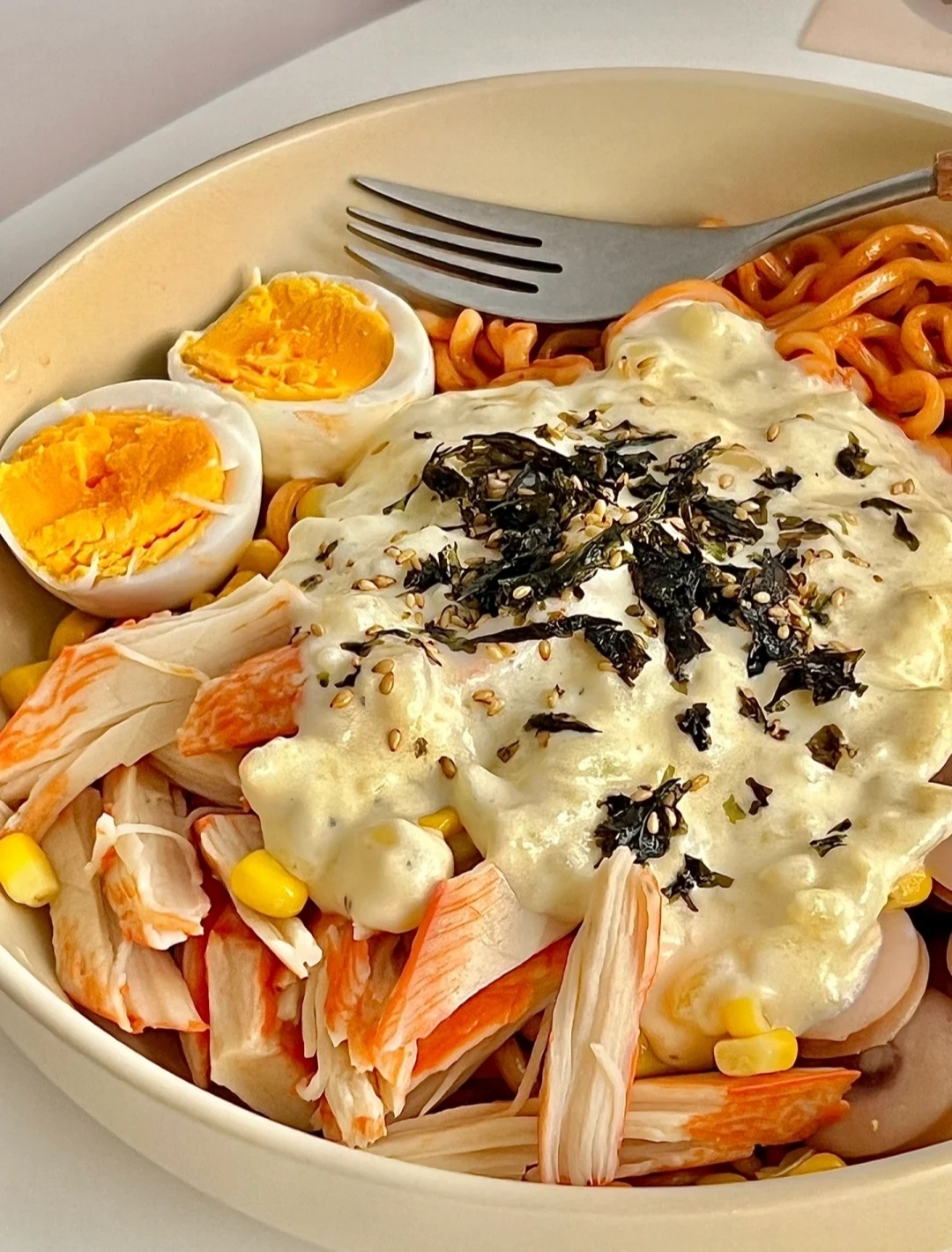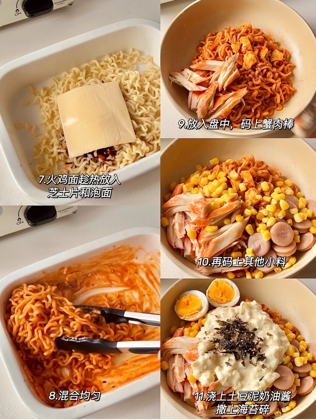 👉🏻材料:火鸡面1包、土豆1个、蟹肉棒4条、香肠2根、芝士片1片、蛋奶油30克、鸡蛋1个、玉米粒适量、海苔碎适量。