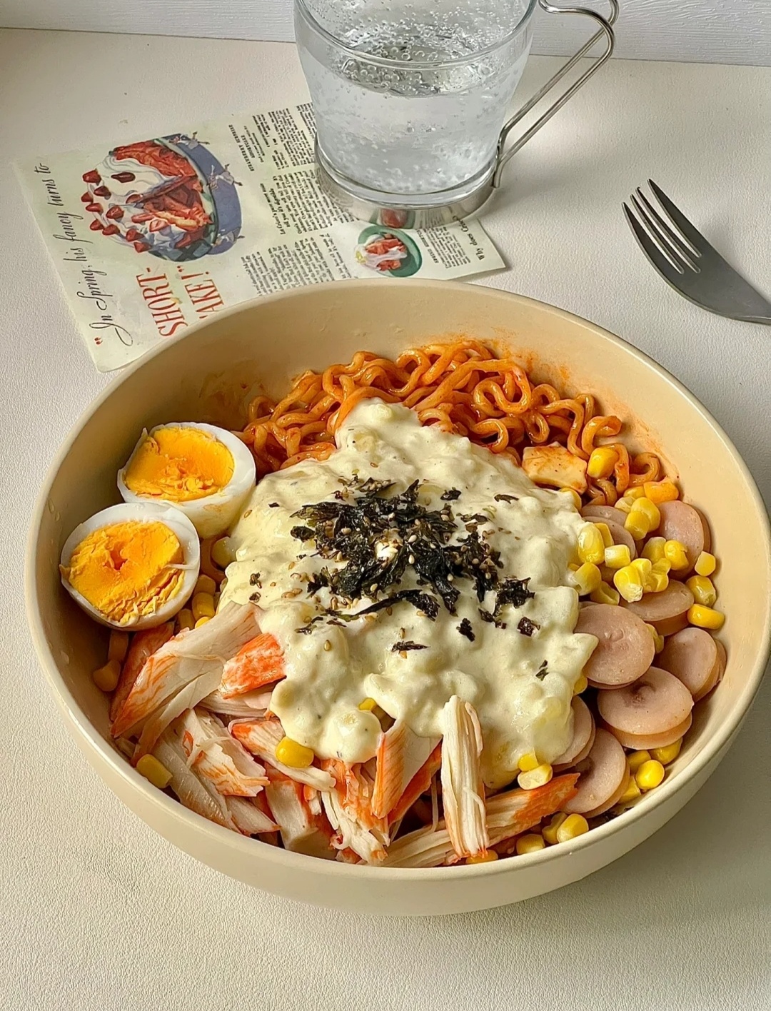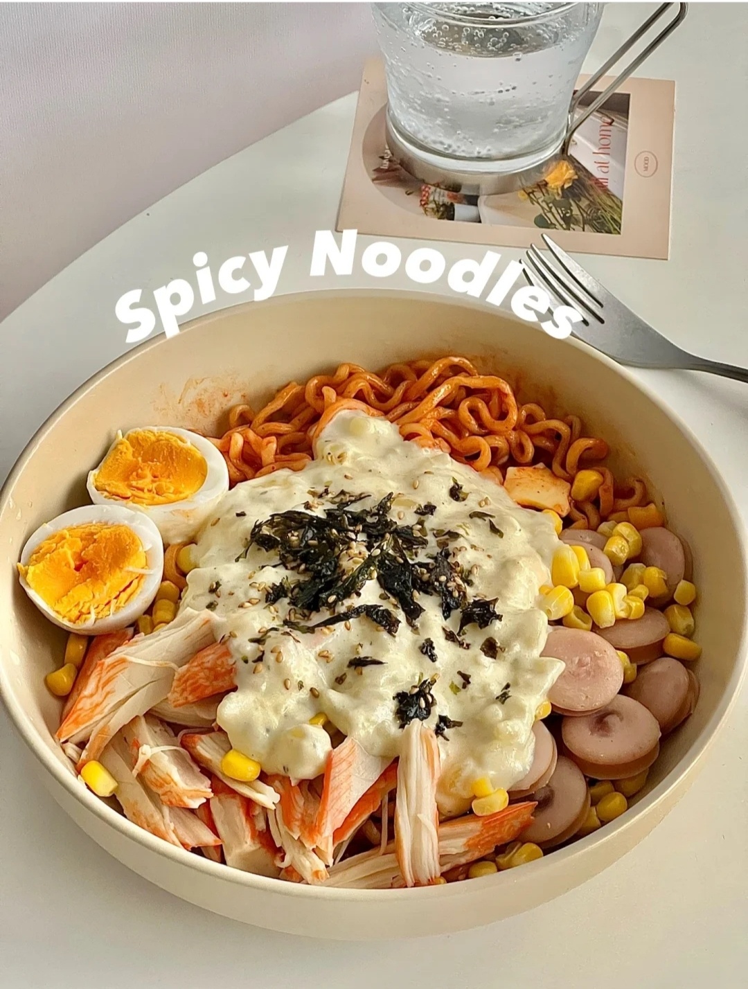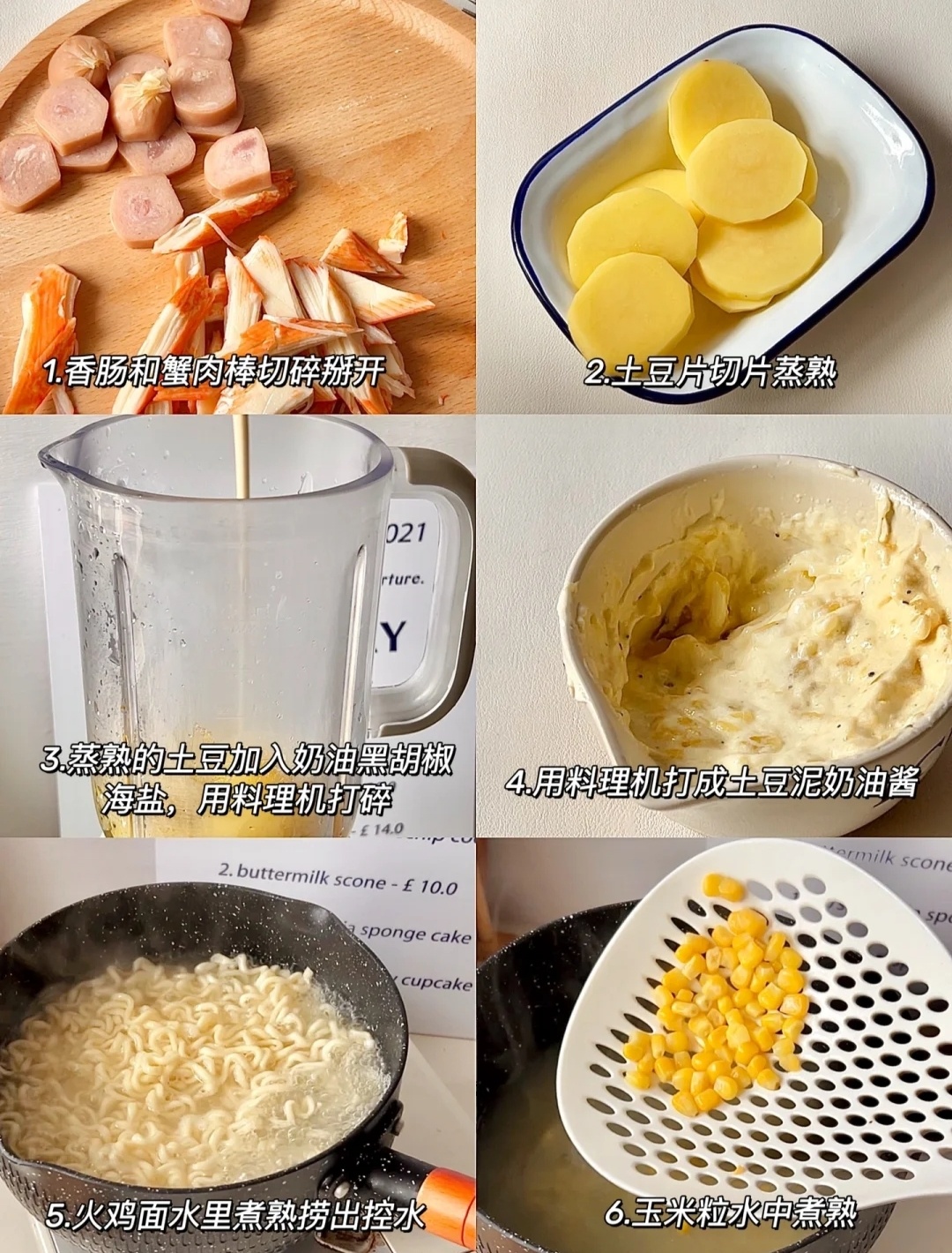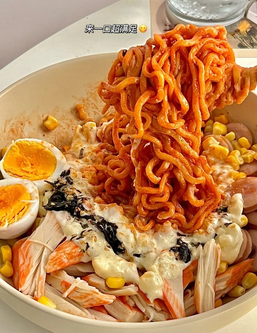 👉🏻材料:火鸡面1包、土豆1个、蟹肉棒4条、香肠2根、芝士片1片、蛋奶油30克、鸡蛋1个、玉米粒适量、海苔碎适量。