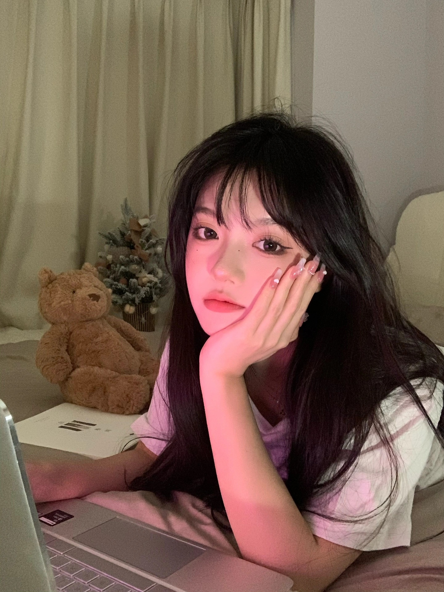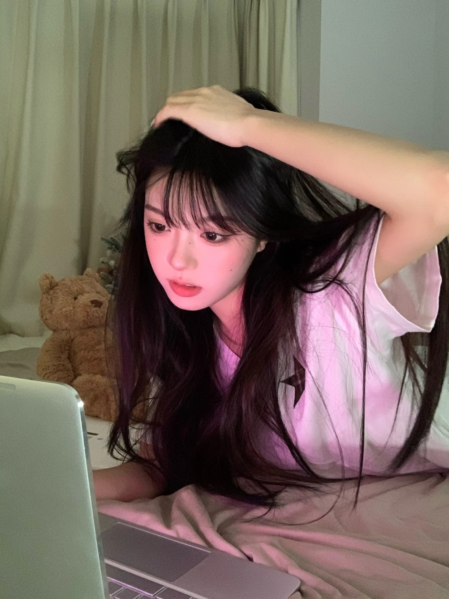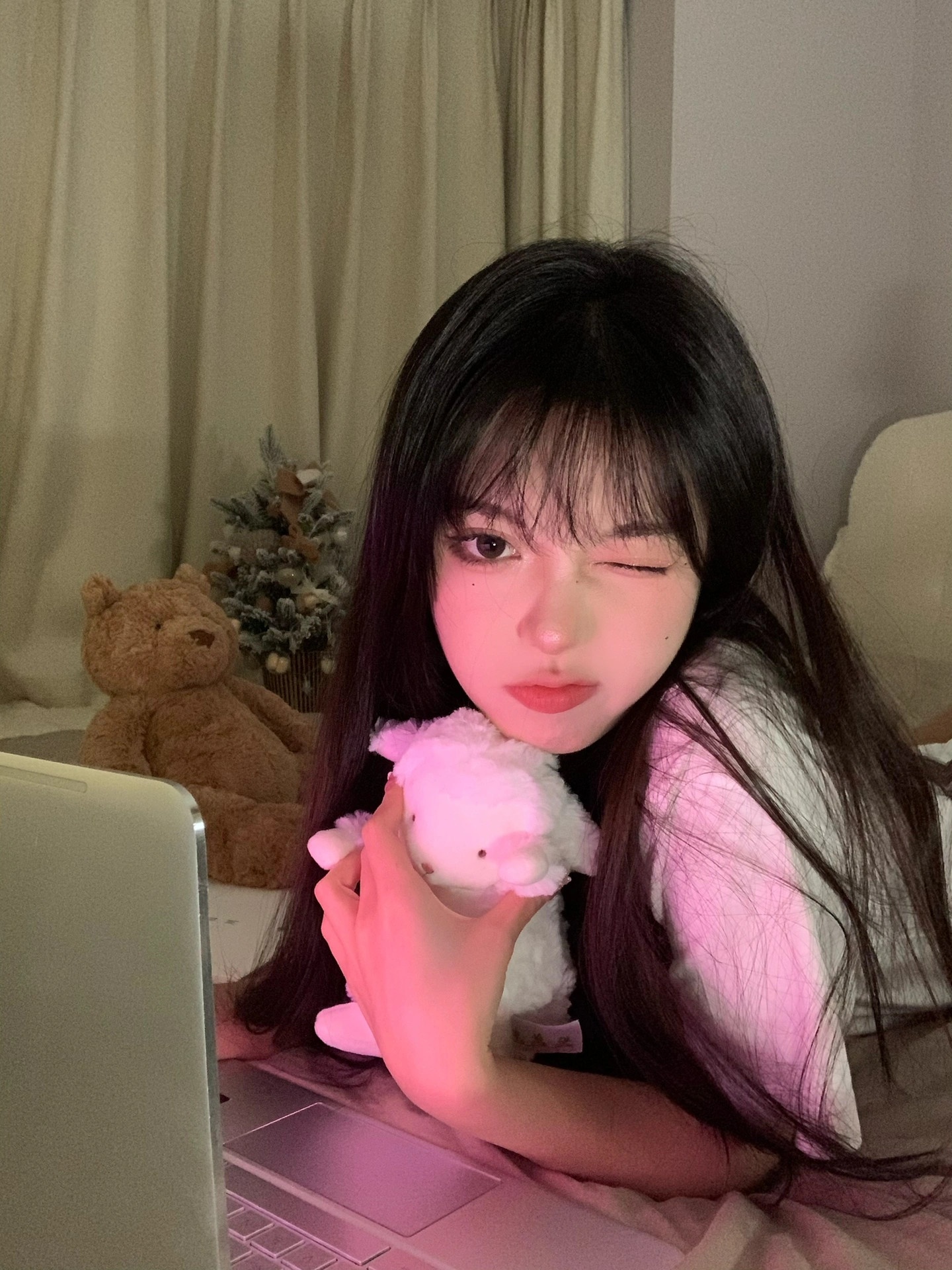 💖把房间的灯都关了 开一盏台灯和一个补光灯 打开电脑调好粉色背景 屏幕亮度也调高哦!灯的位置在图9⃣️哦