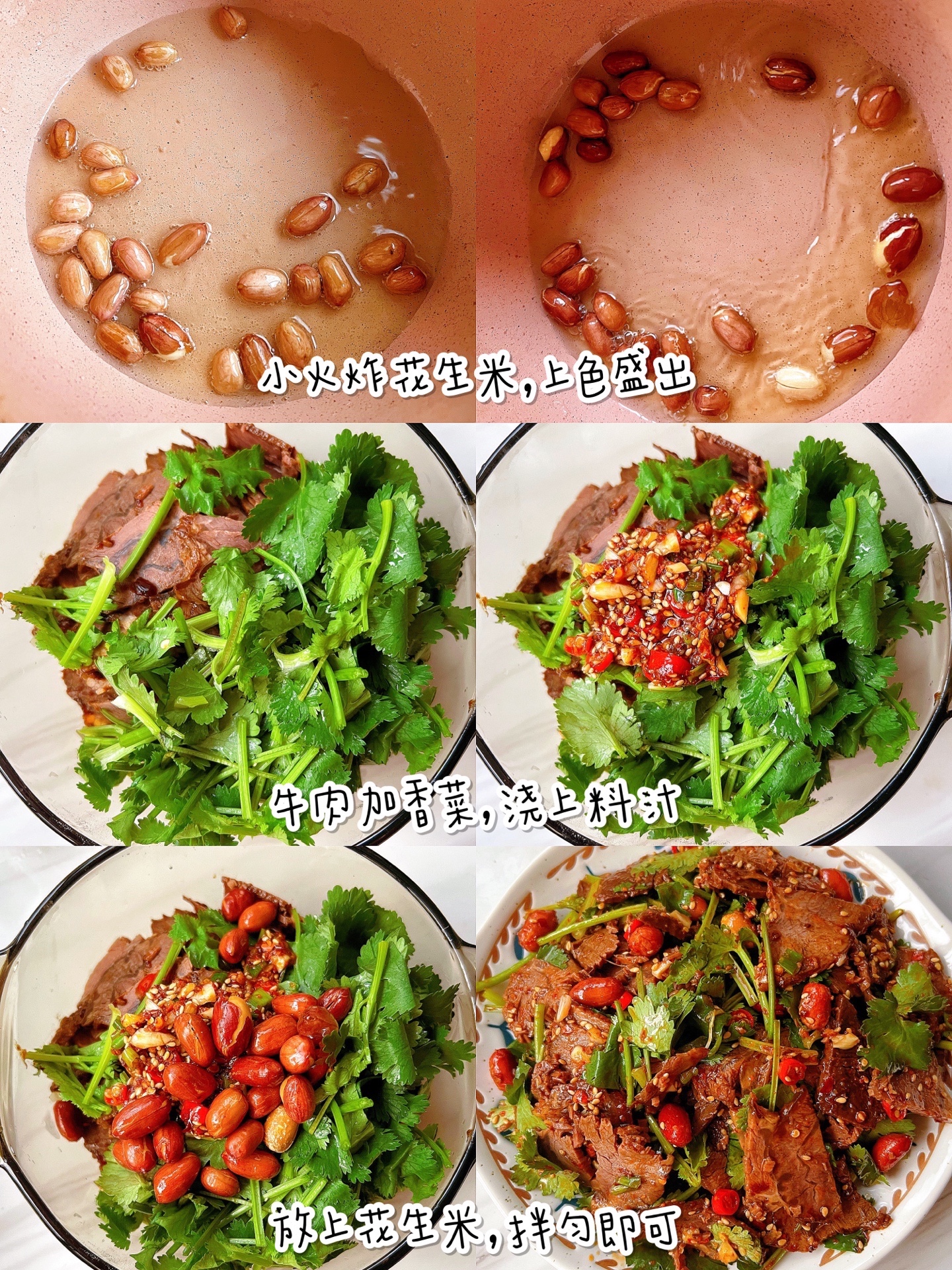 4️⃣牛肉放香菜,浇上料汁,花生米,拌匀即可