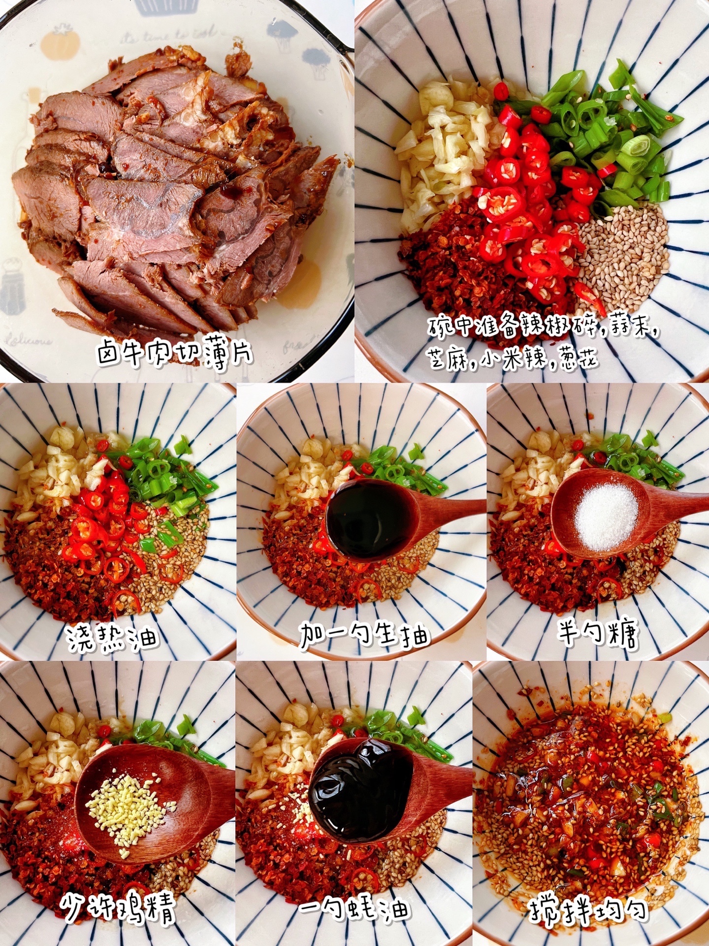 卤牛肉、花生米、辣椒、蒜末、芝麻、小米辣、葱花、生抽、糖、鸡精、蚝油、香菜