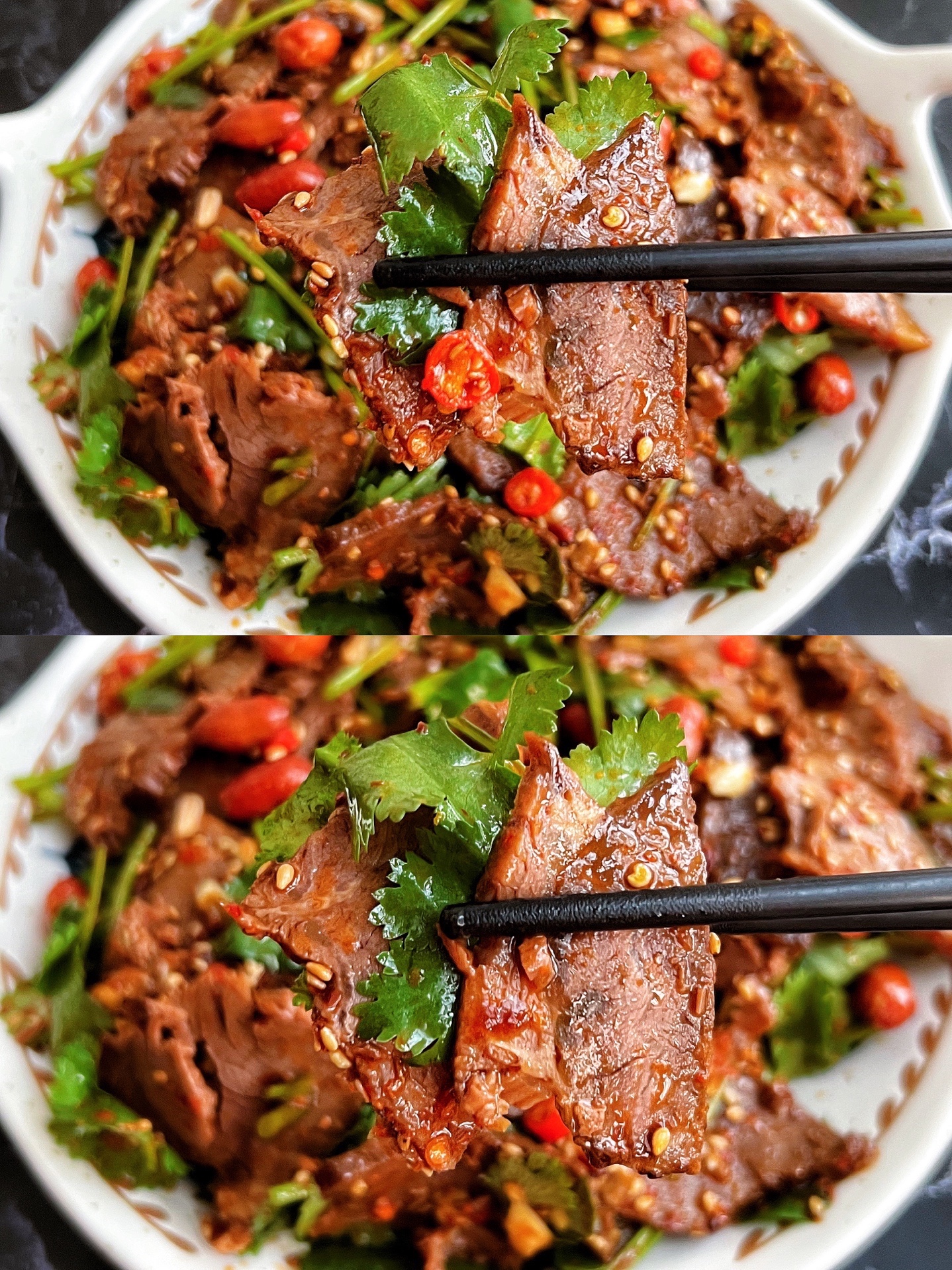 凉拌牛肉真的怎么吃都不腻,外边卤牛肉120一斤,凉拌的更不用说了,很多配菜 肉都得扒拉着盘子找。自己做 想吃多少吃多少!