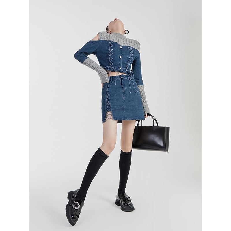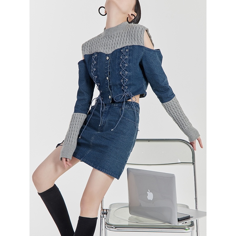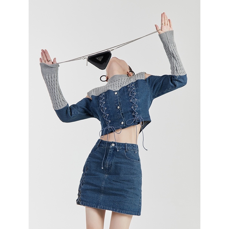 设计感牛仔套装女复古针织拼接露肩上衣纯欲短裙气质两件套真的很酷😎它的设计还是拼接的 也很显腿长,也会显示你们的小蛮腰快点冲吧!