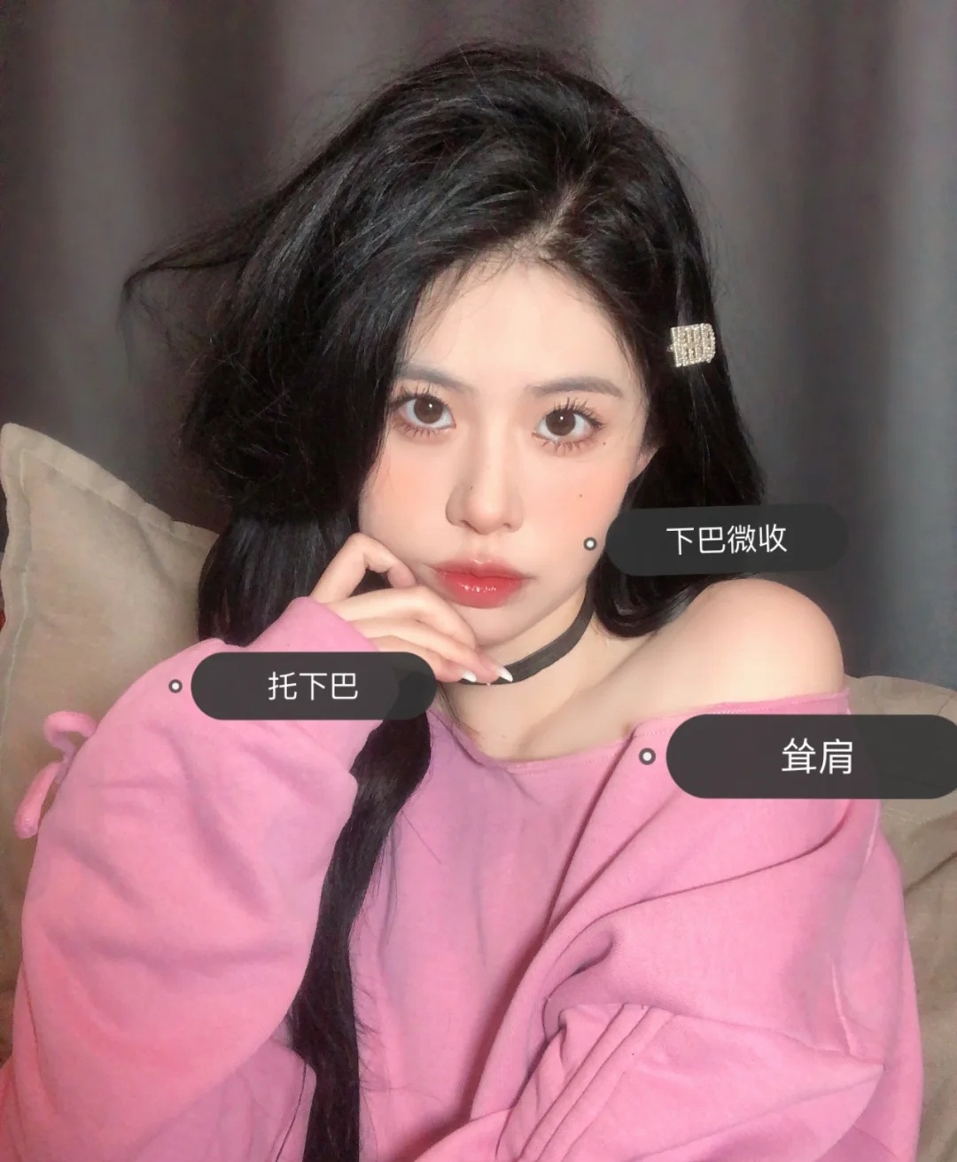 下巴微收,这样会显得下庭比较短,更幼态,眼睛也会看起来更大