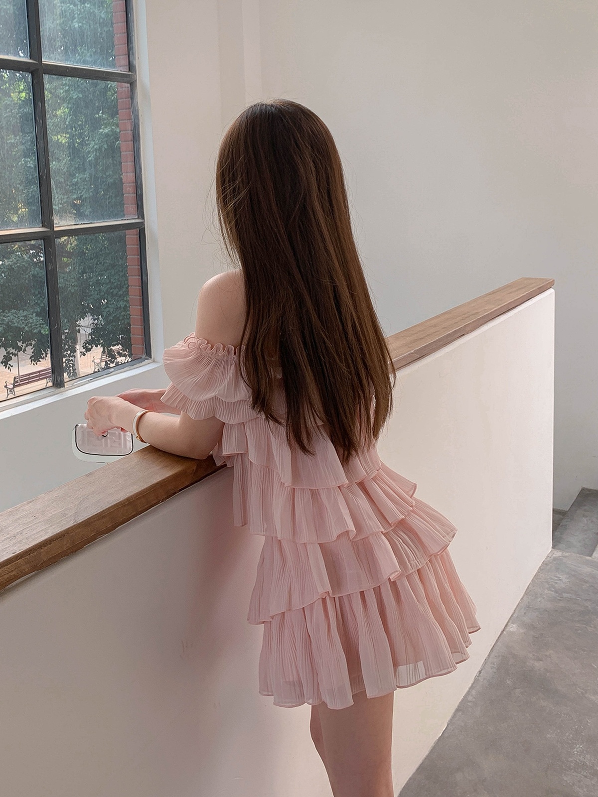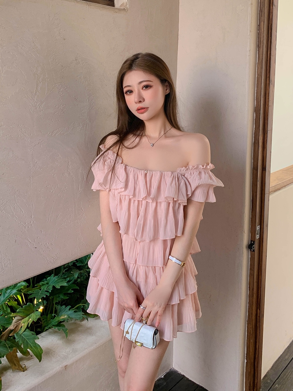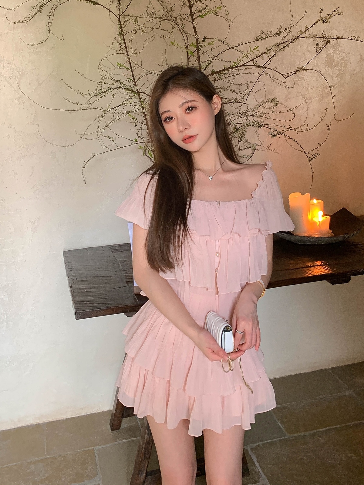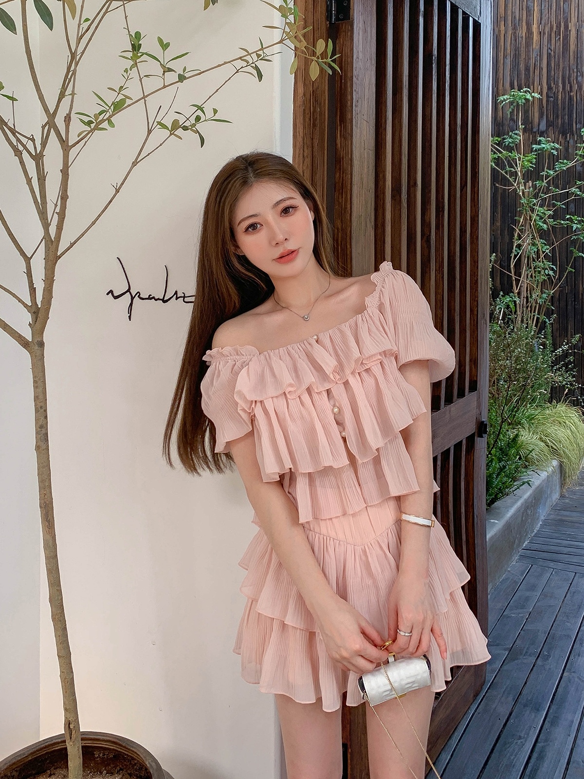 甜美温柔一字肩泡泡袖雪纺上衣高腰荷叶边A字短裙套装