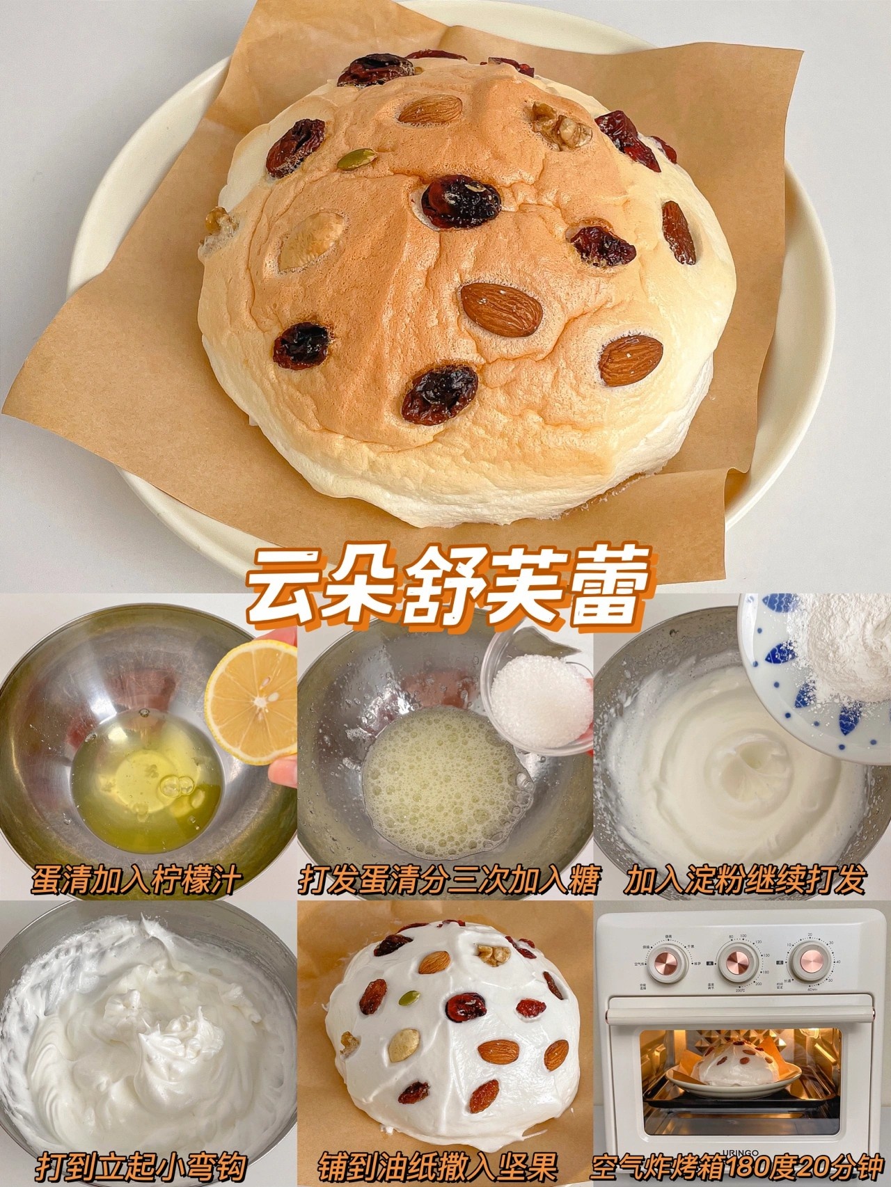 ▫️食材:蛋白3个、白糖15g、玉米淀粉10g、柠檬汁几滴、坚果