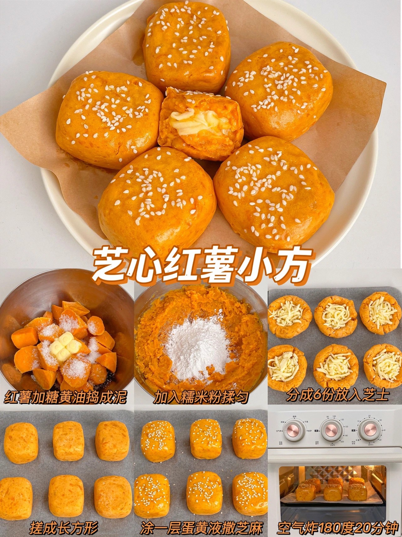 ▫️食材:红薯500g、黄油10g、糯米粉50g、糖 、芝士、鸡蛋、芝麻