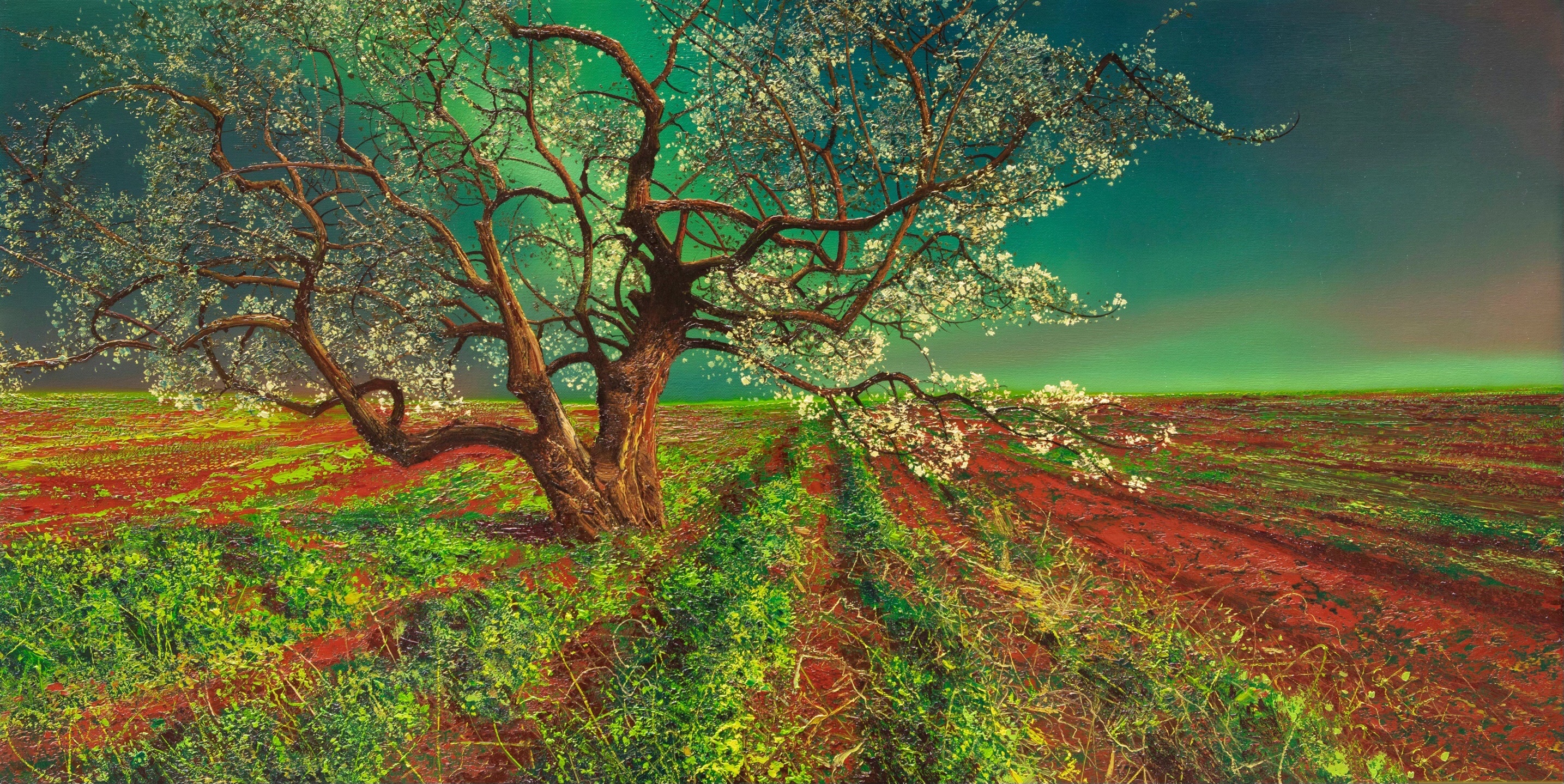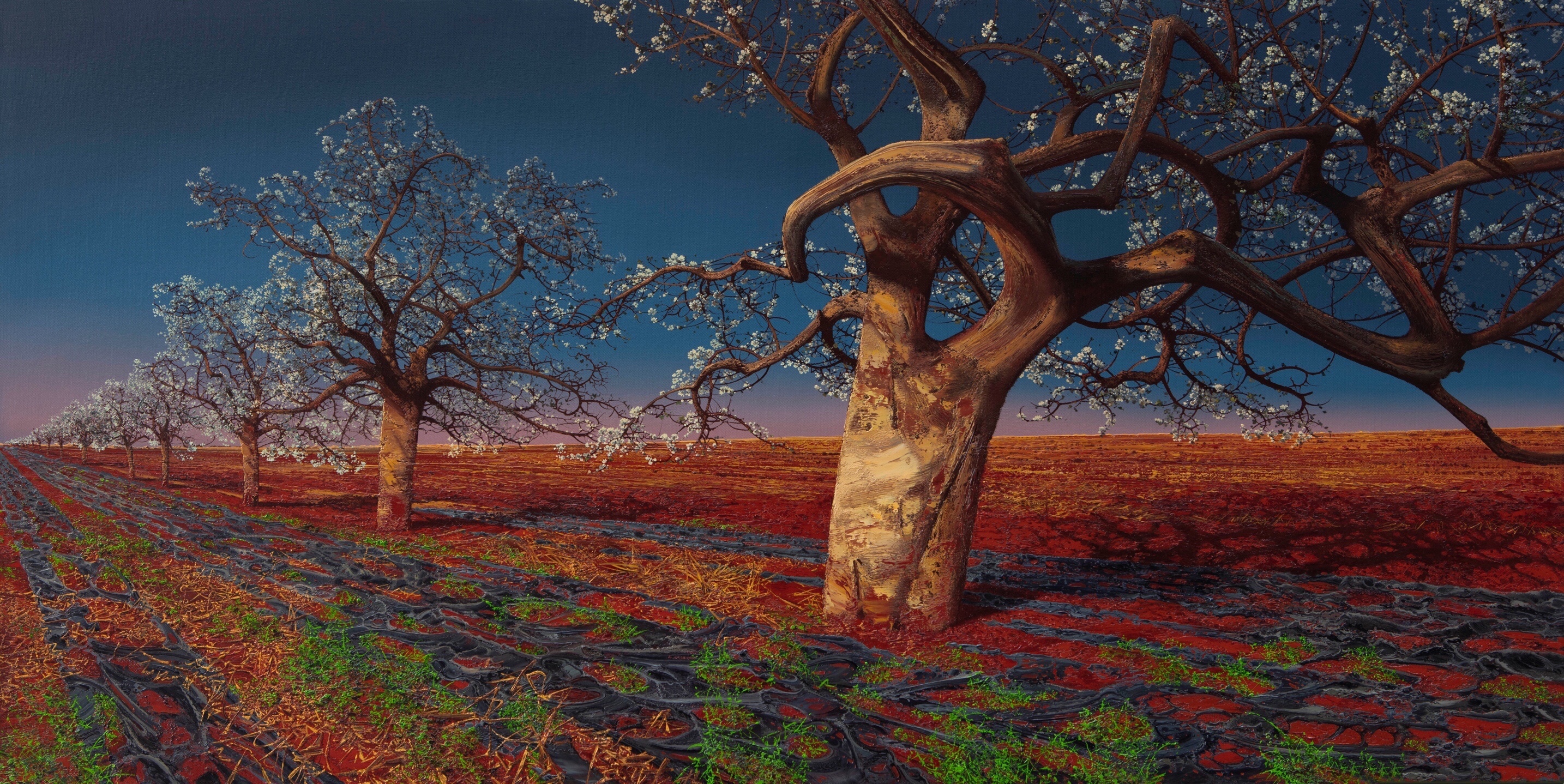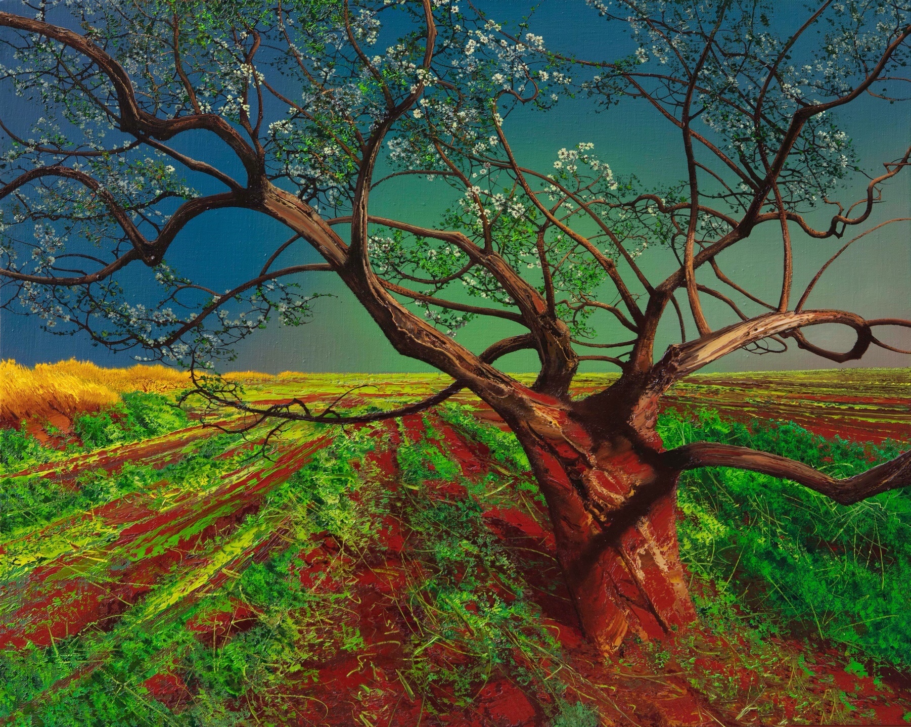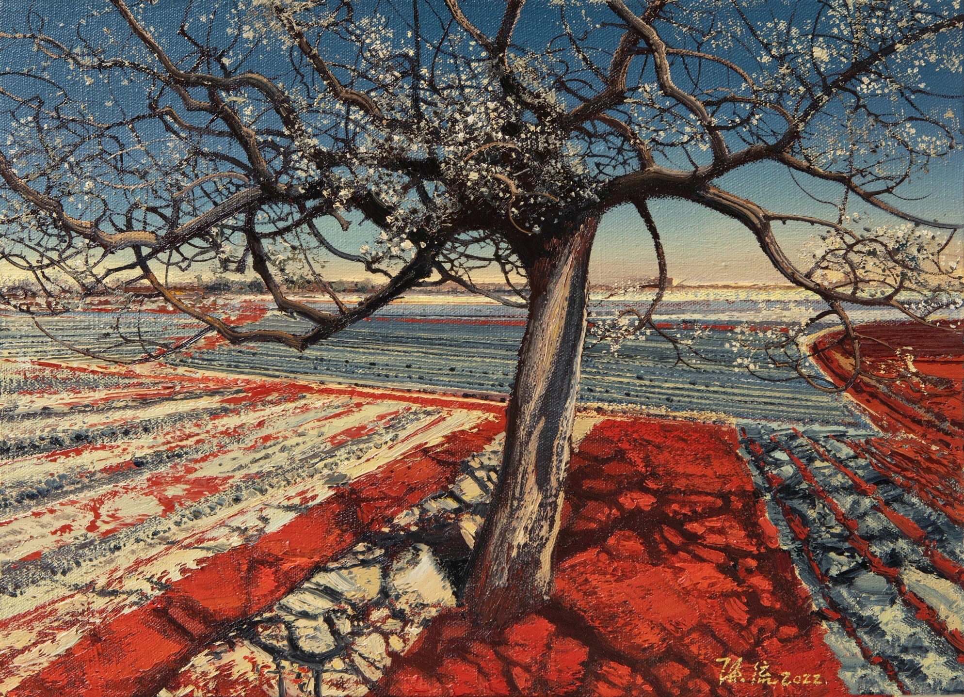 陈流老师画里大片褐红色的土壤,老梨树虬曲盘结的枝干,梨花开时如雪如云的晶白,质感到叫人想去触摸;