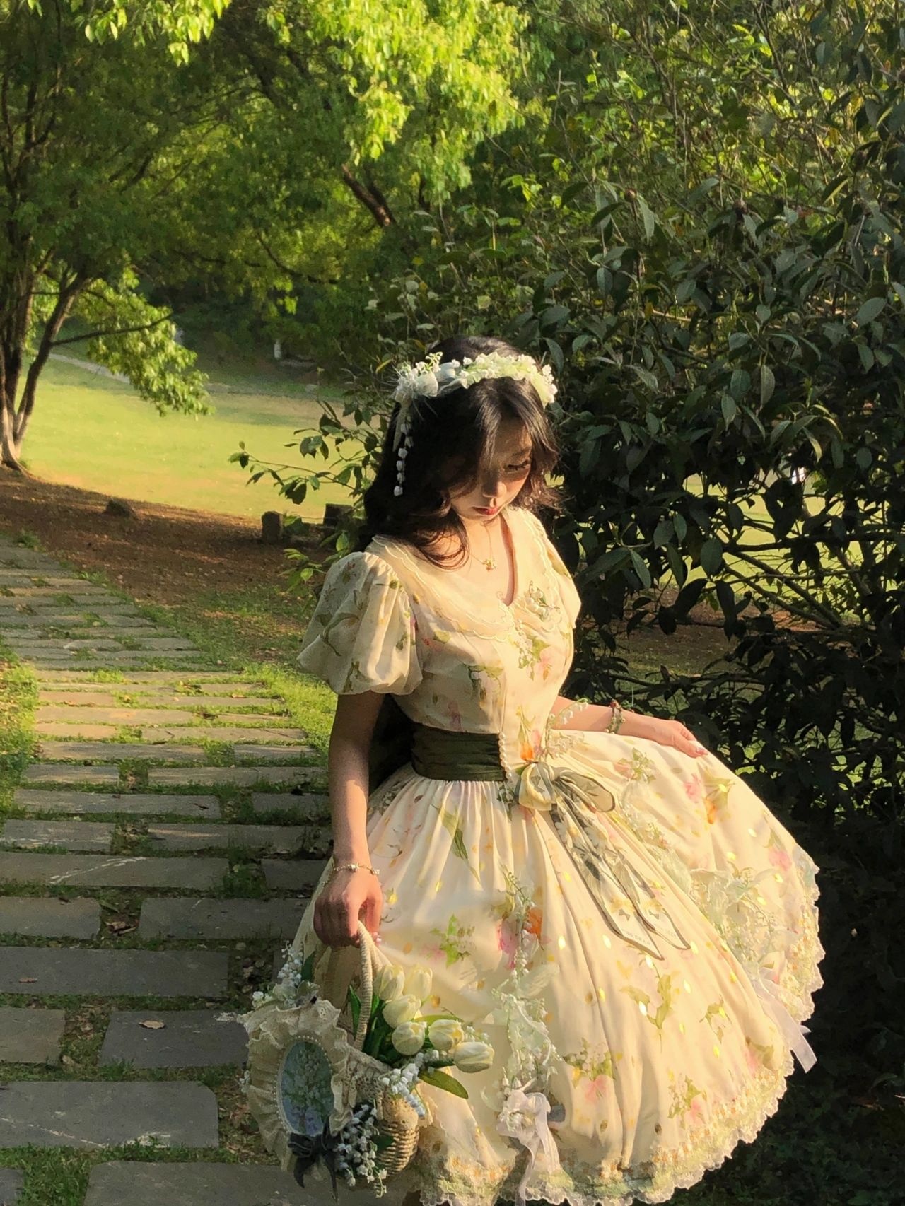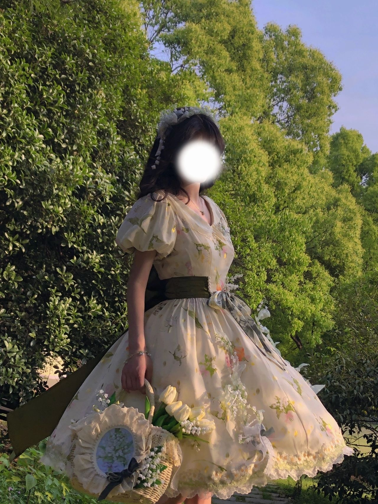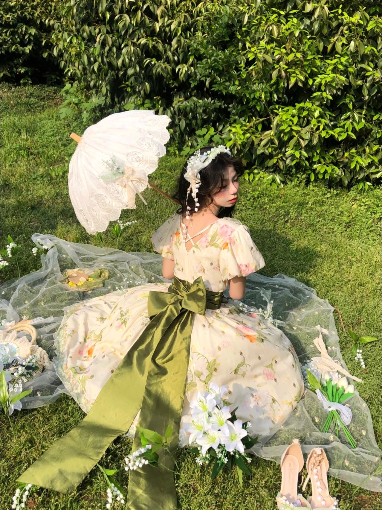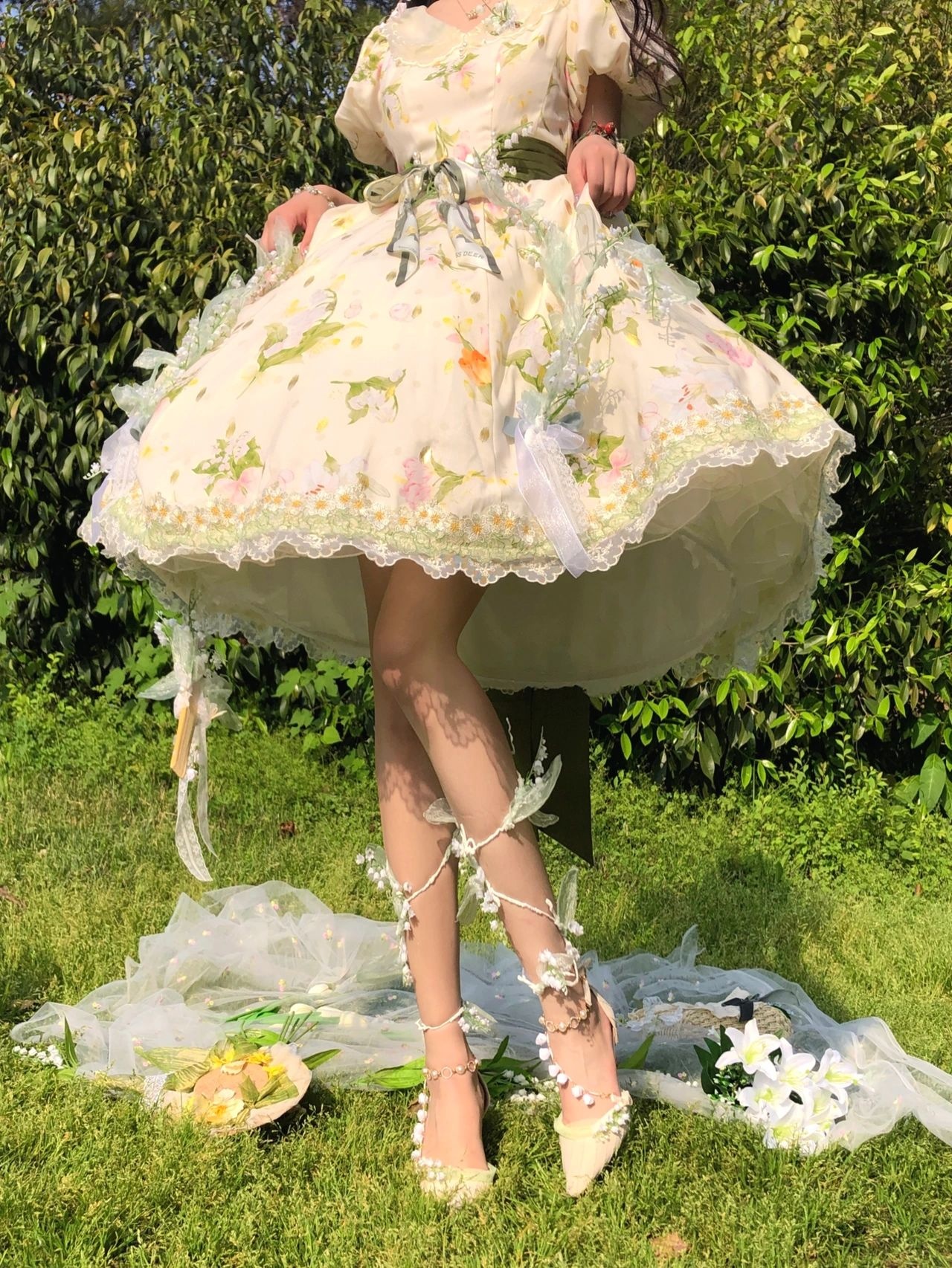 假如把铃兰做成裙子|||摇风铃这条裙子是我衣柜里与众不同的一条印花田园风(平时基本都是纱裙),日常也可以穿着,非常适合在草地上野餐。但觉得后面的大蝴蝶结很公主,所以我又稍微调整了一下搭配,加了两个提拉裙摆和胸针,以及把丝巾打成蝴蝶结别在腰处,加上腿环,整体就华丽了很多,穿这条在田野里奔跑的时候感觉和夕阳、草丛,达成了一种唯美的和谐感。
