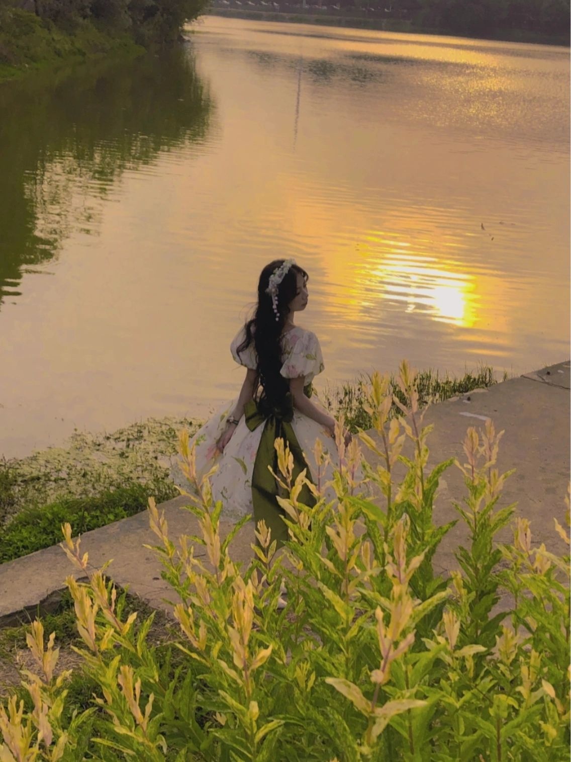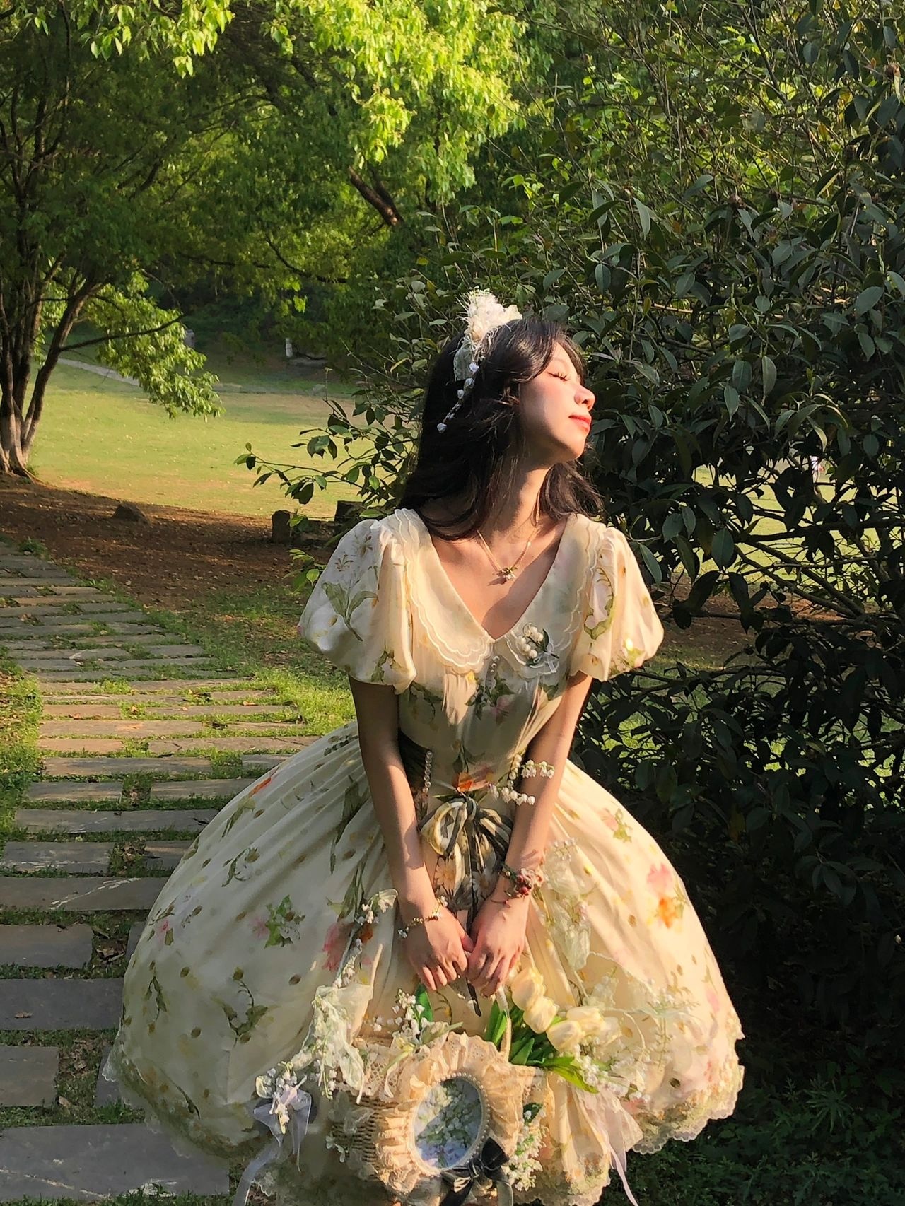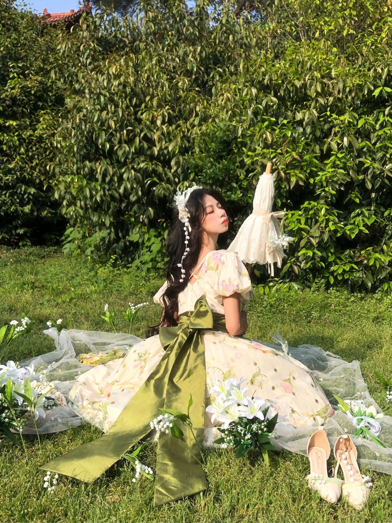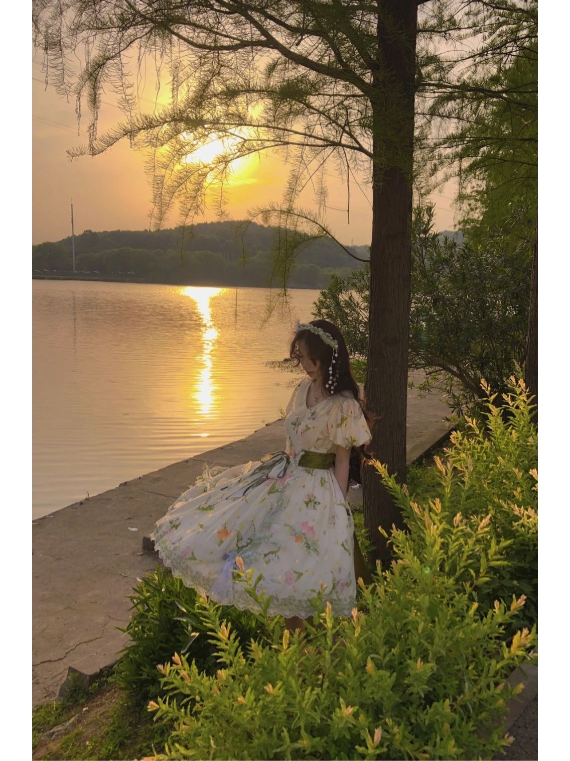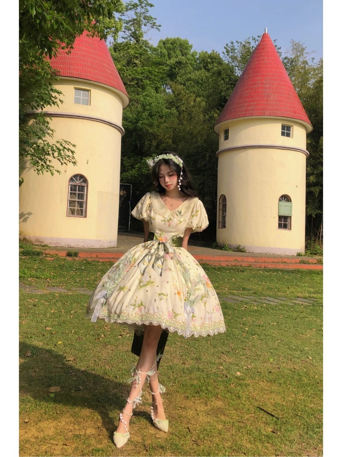 假如把铃兰做成裙子|||摇风铃这条裙子是我衣柜里与众不同的一条印花田园风(平时基本都是纱裙),日常也可以穿着,非常适合在草地上野餐。但觉得后面的大蝴蝶结很公主,所以我又稍微调整了一下搭配,加了两个提拉裙摆和胸针,以及把丝巾打成蝴蝶结别在腰处,加上腿环,整体就华丽了很多,穿这条在田野里奔跑的时候感觉和夕阳、草丛,达成了一种唯美的和谐感。