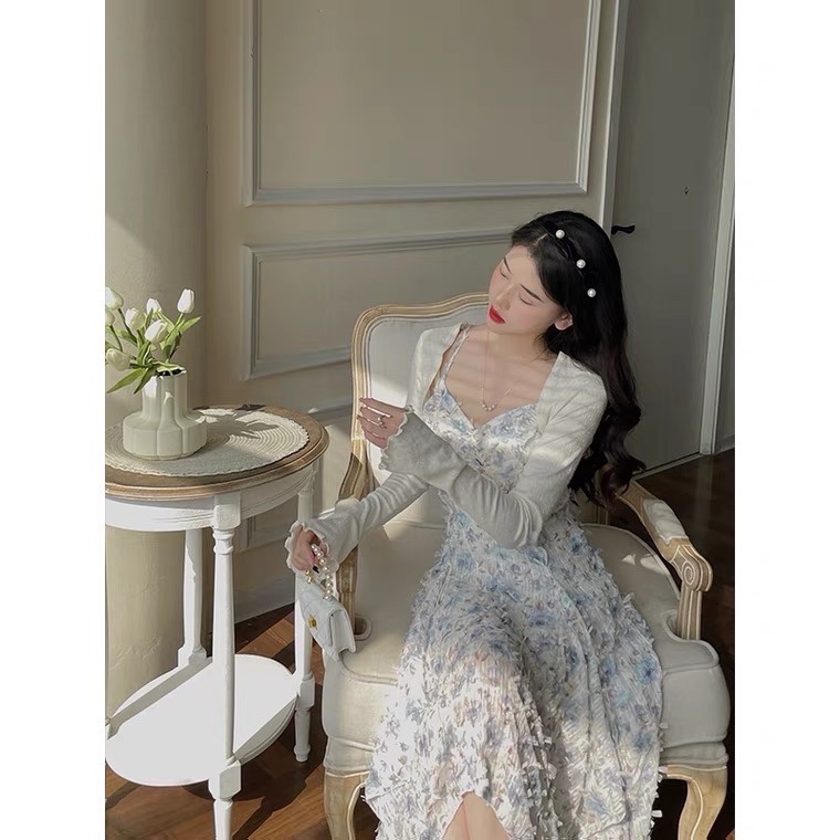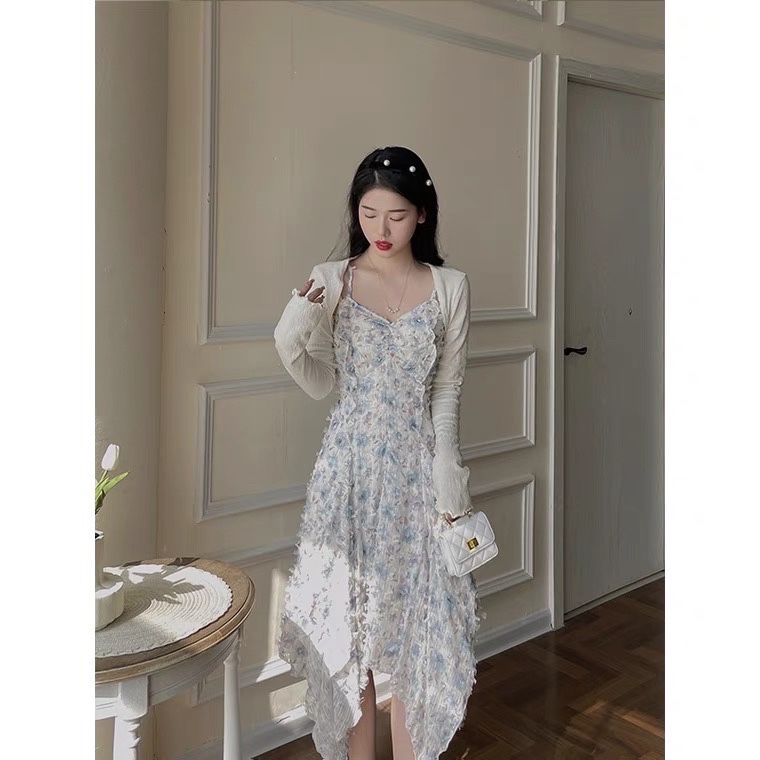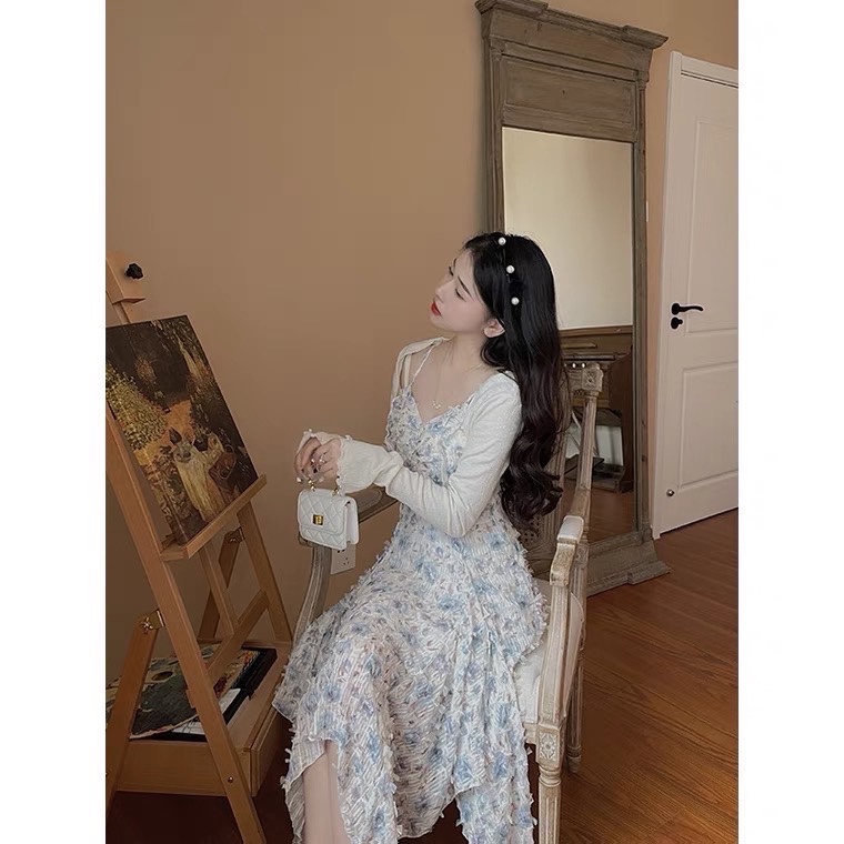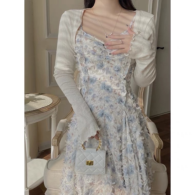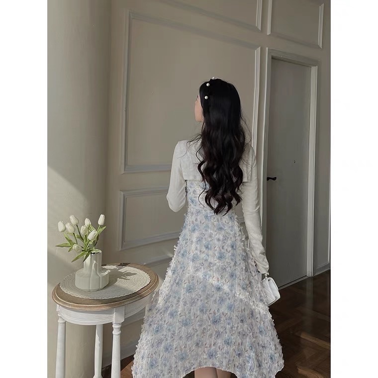 满是蓝色小碎花吊带裙 搭配白色罩衫 真是纯欲风满满