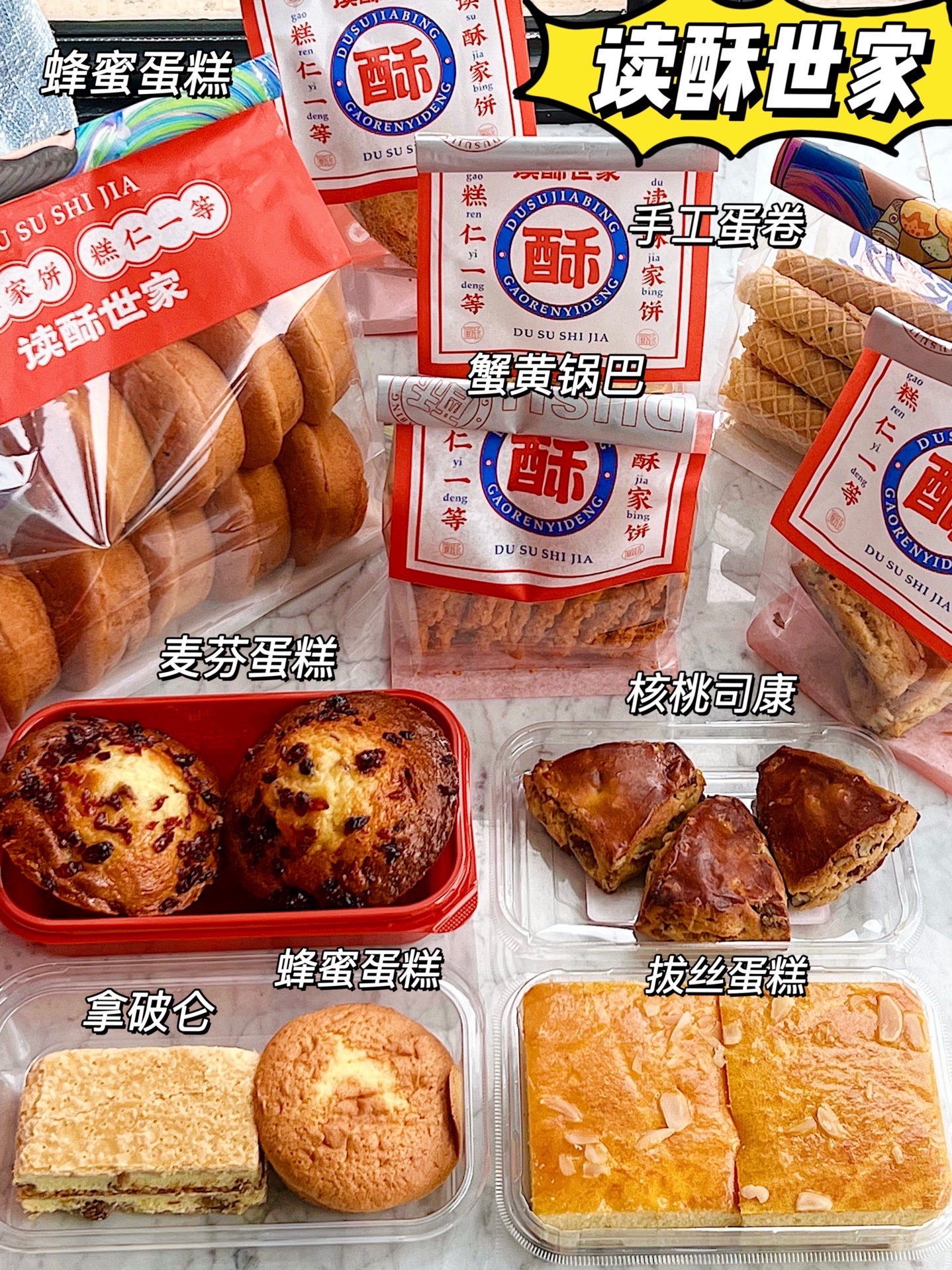 核桃司康+手工蛋卷+蟹黄锅巴+麦芬蛋糕+拿破仑+拔丝蛋糕+蜂蜜蛋糕+面包片