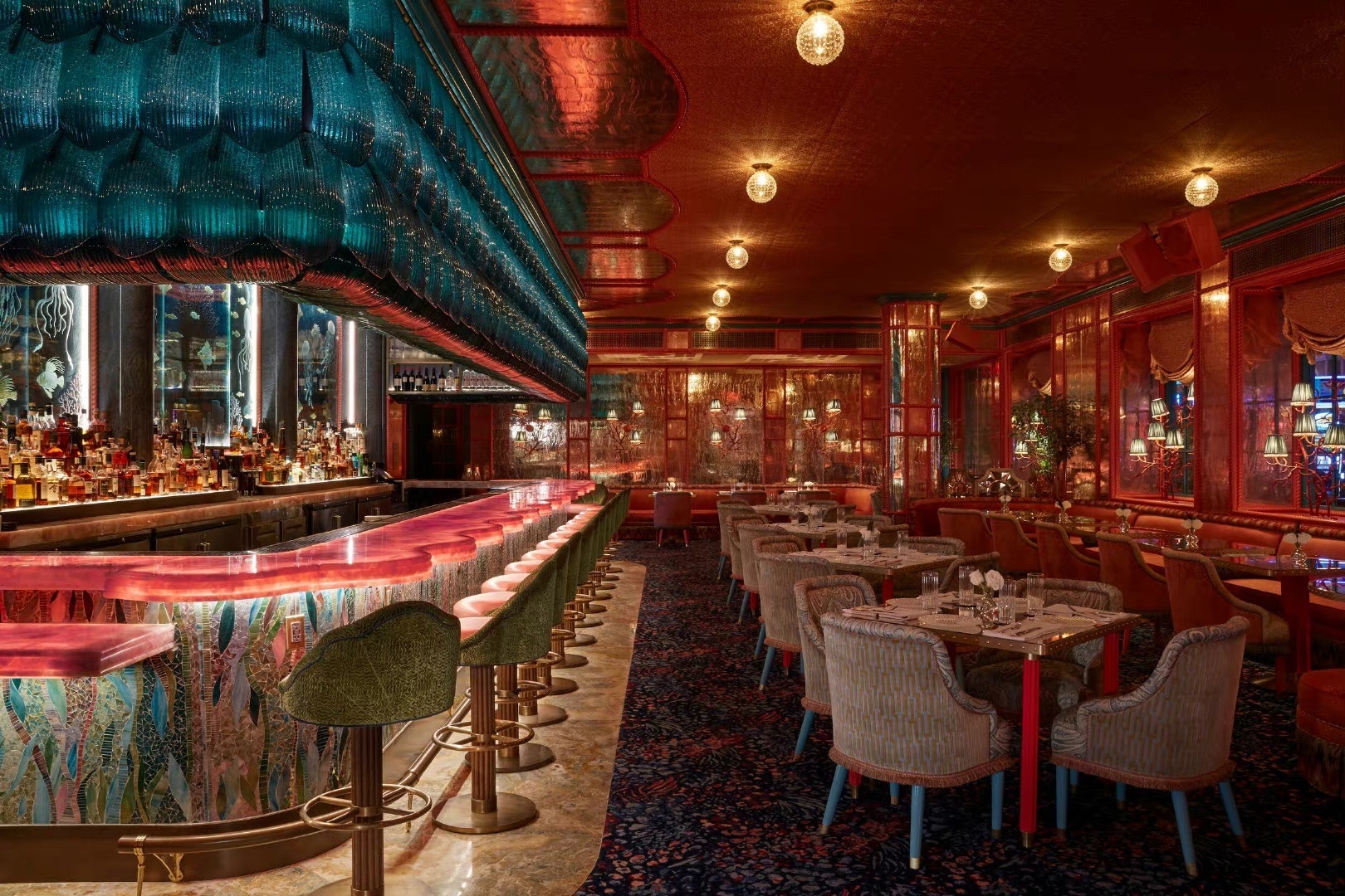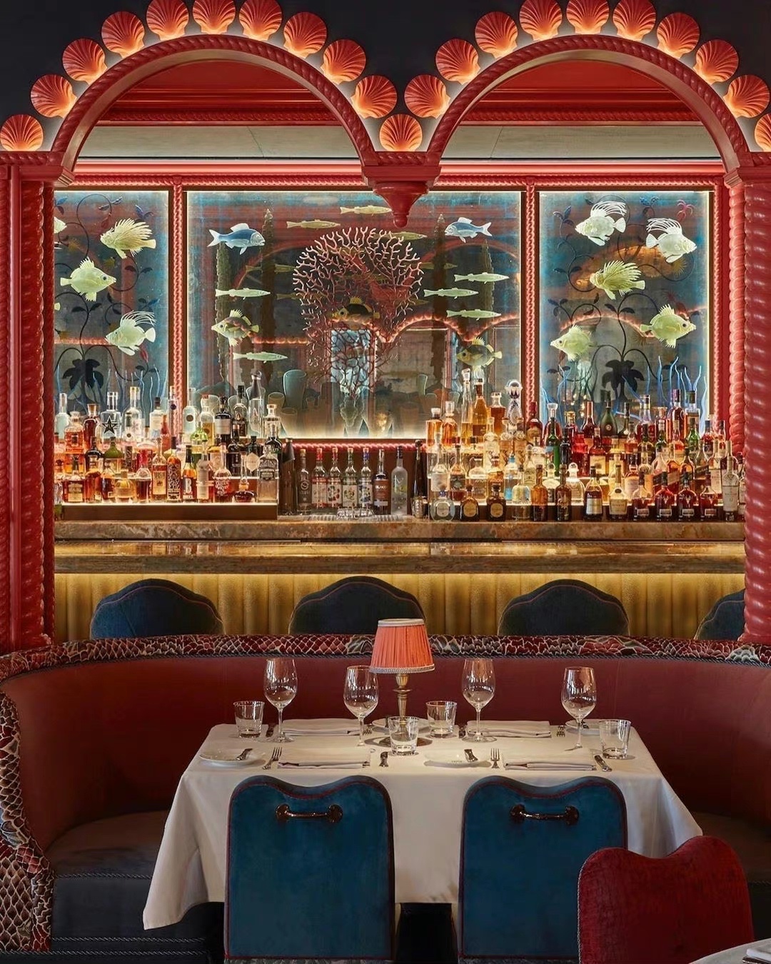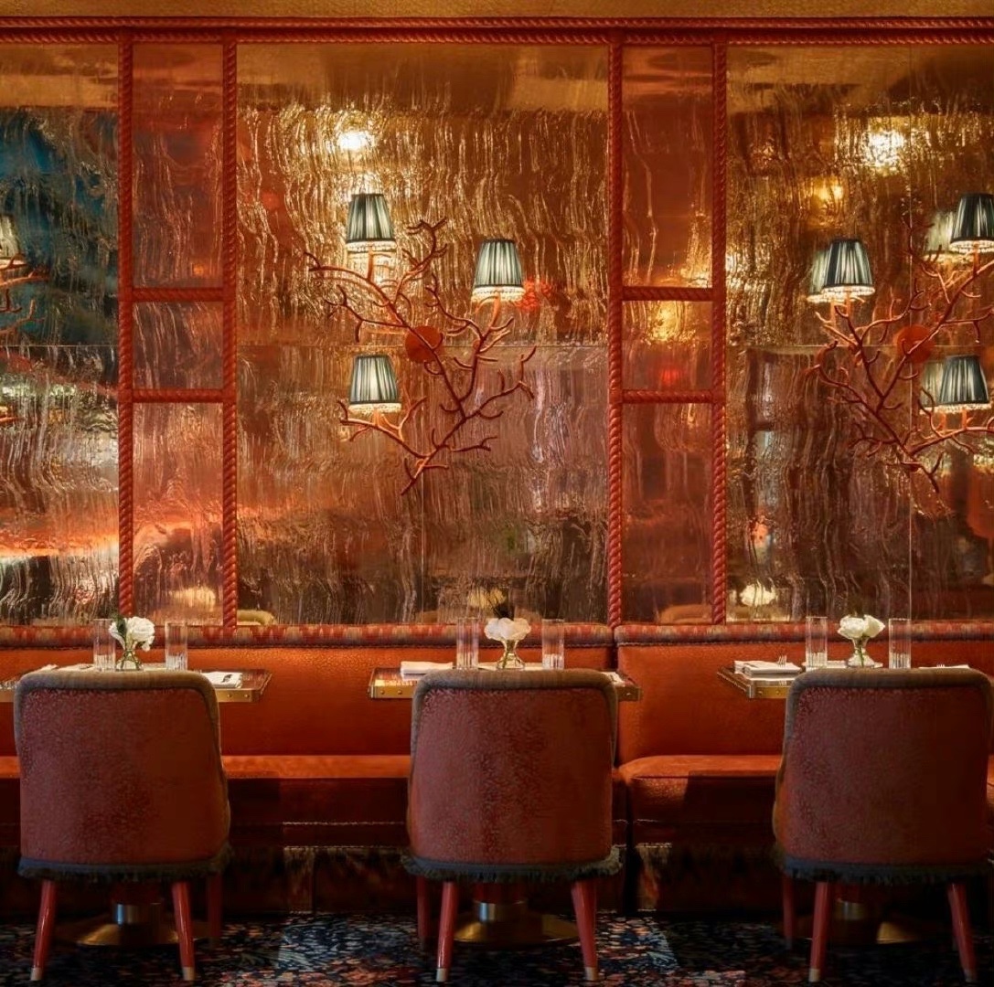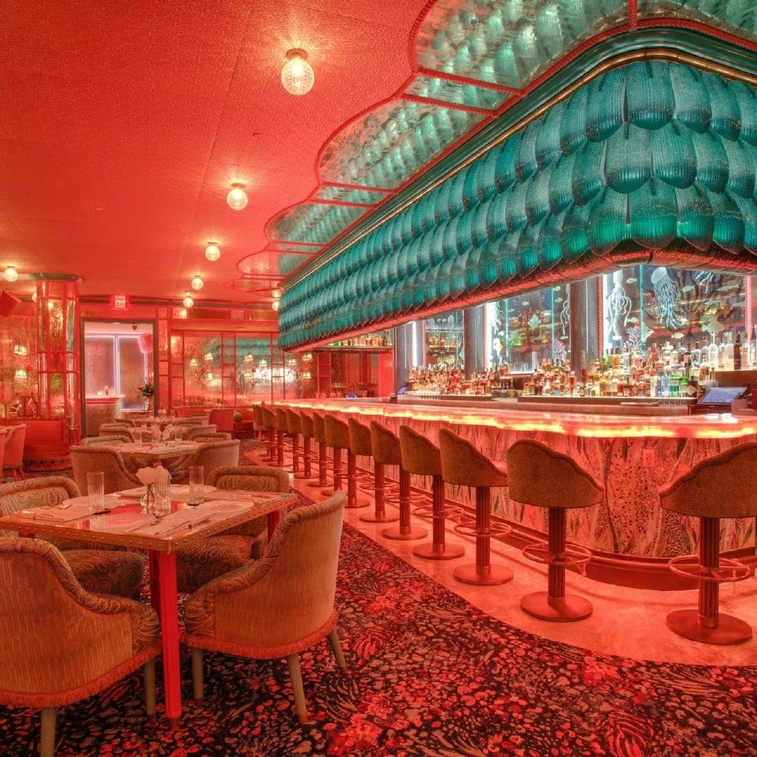 伦敦著名的私人会所 Annabel‘s 的设计师 这次在拉斯维加斯 Bellagio 酒店里的 Mayfair Supper Club 里创作了另一处狂想世界 高饱和度的蓝与红撞色 暧昧的灯光下回响着上个世纪的好莱坞风采 角落里珊瑚贝壳的海洋装饰旁添奇幻色彩
