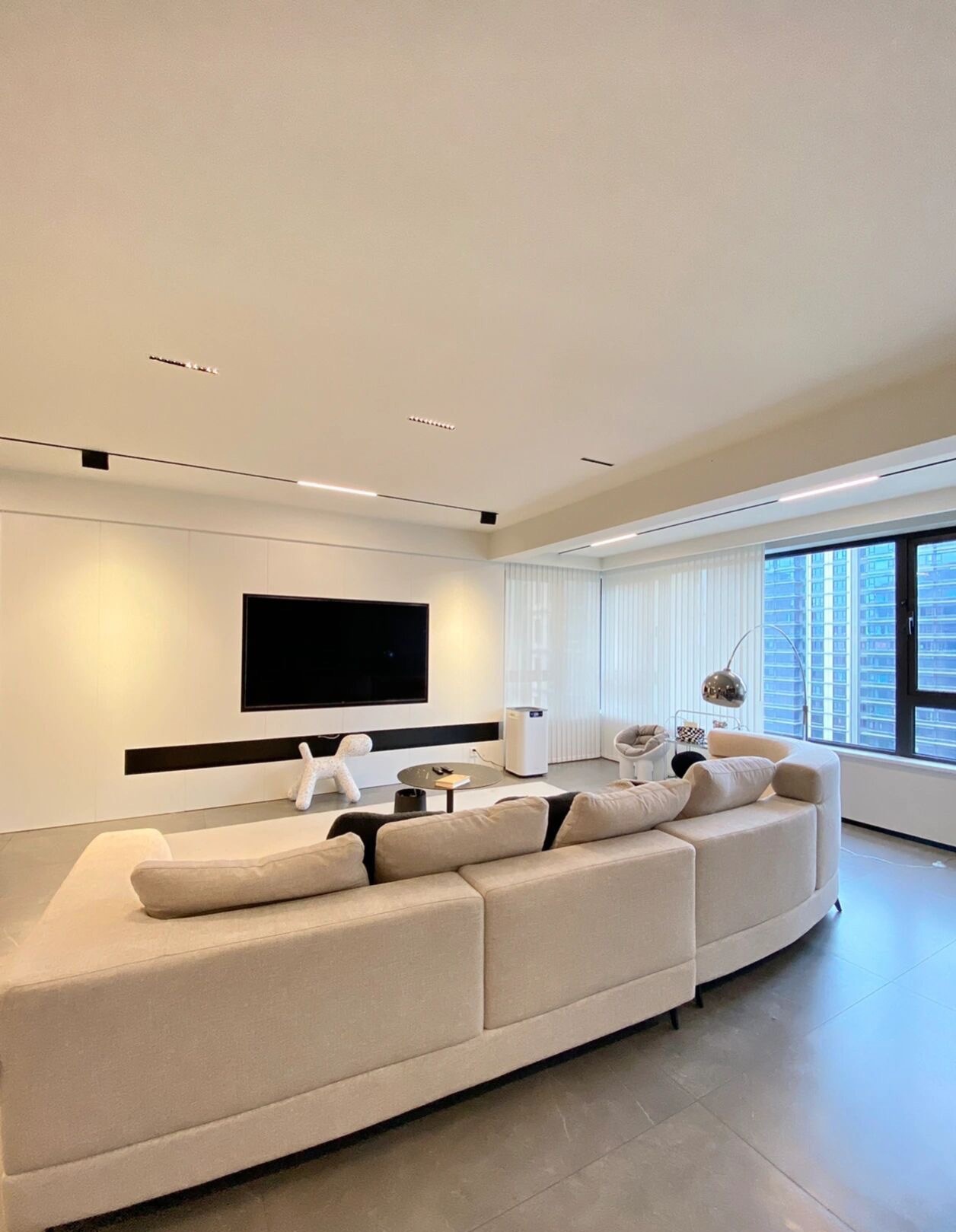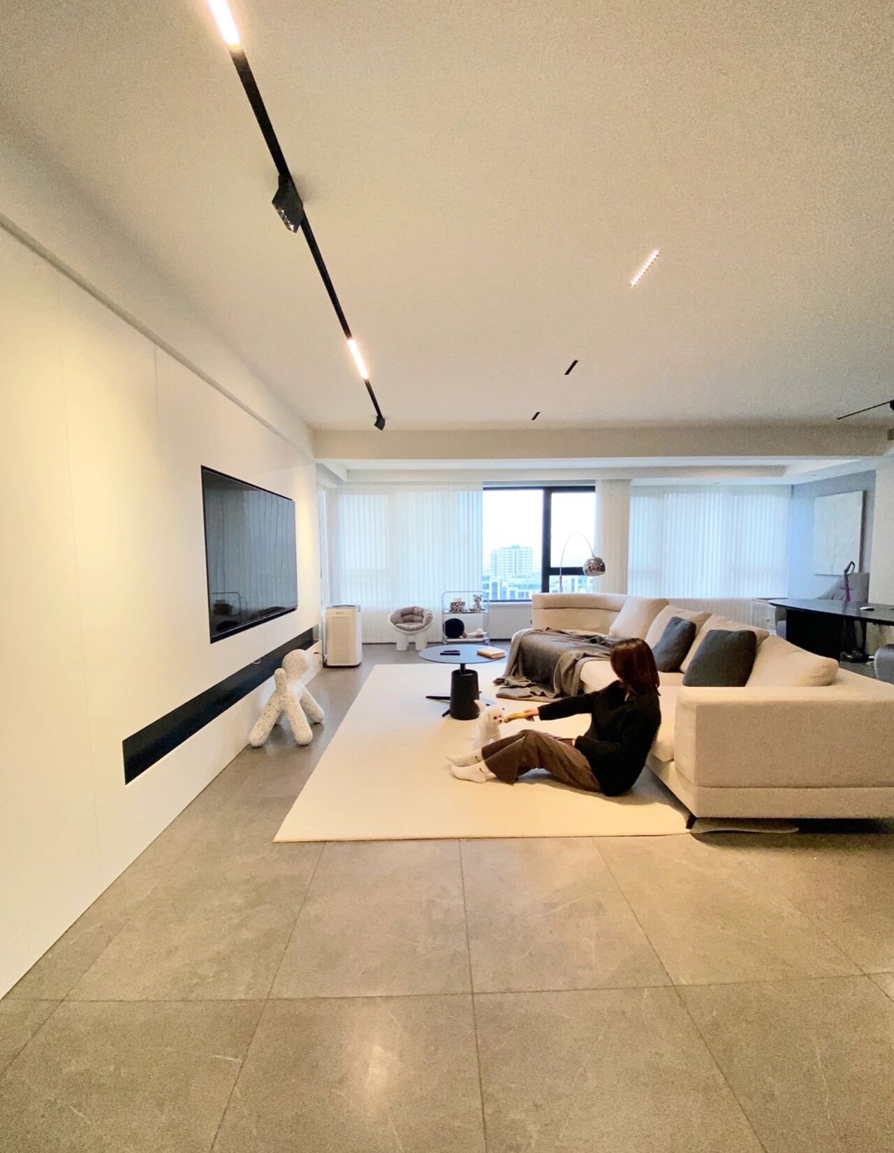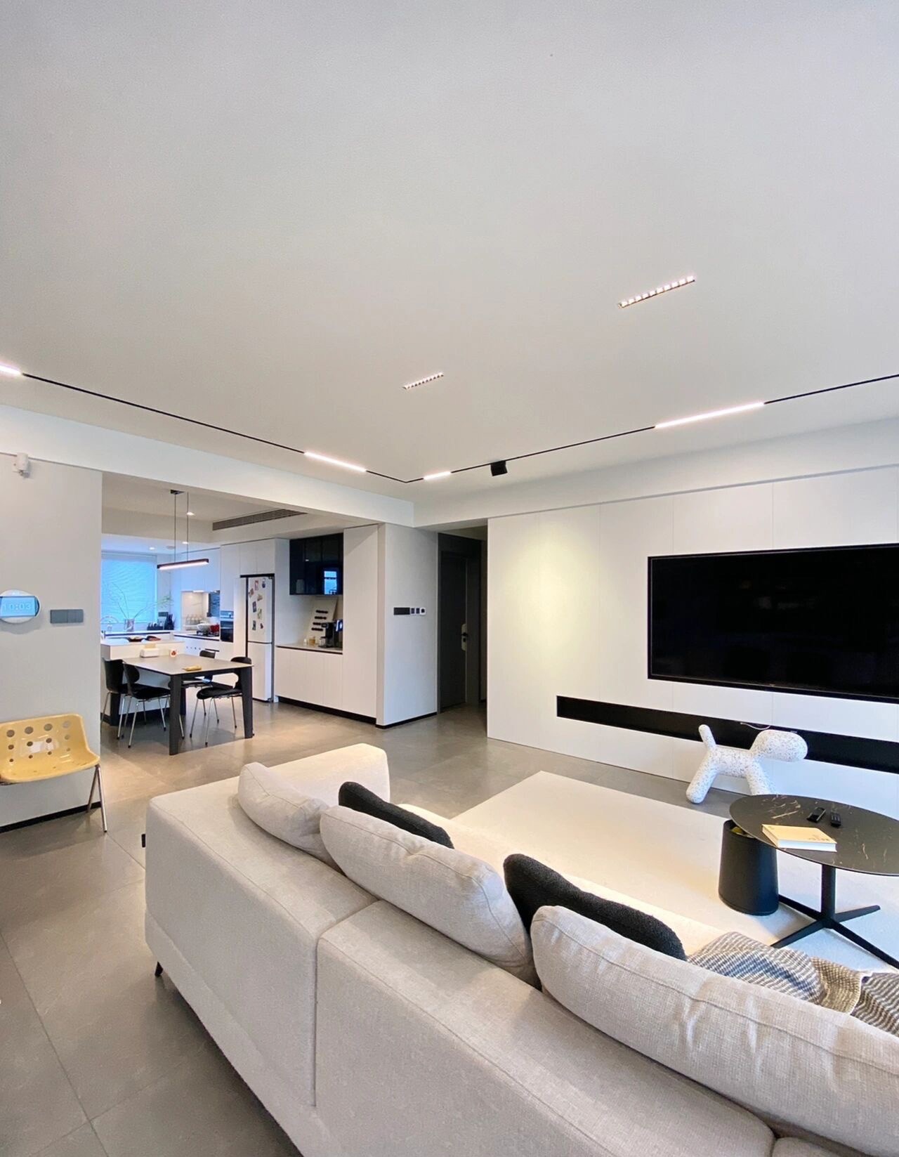 采用单眼皮+薄吊,内嵌轨道磁吸灯作为公共空间的主要照明,搭配电视墙上方的射灯作为局部氛围补充照明,氛围感十足。