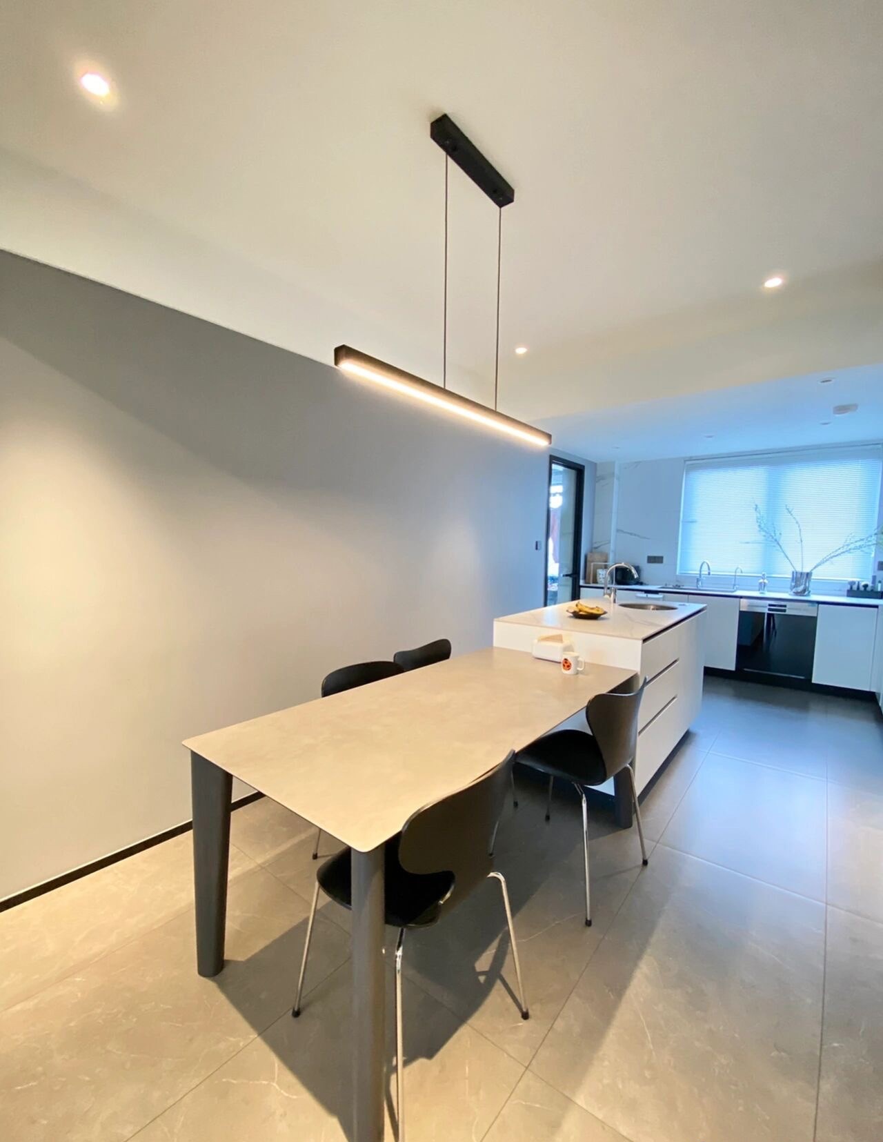 采用内嵌式筒灯,在灯光上形成呼应,自带层次。餐桌上方采用垂直吊灯,采用中性光,营造更舒适温馨的就餐氛围。