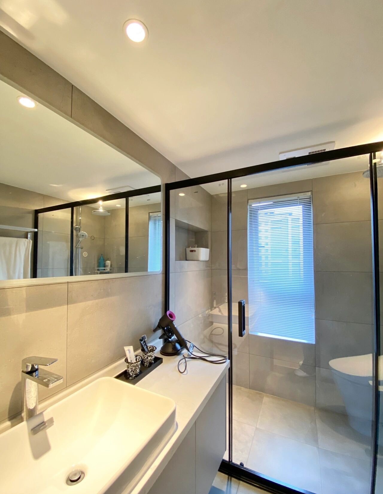 利用防水石膏板作为吊顶,掩盖顶部水管的同时内嵌筒灯。搭配浴室镜灯带,增加局部亮度。